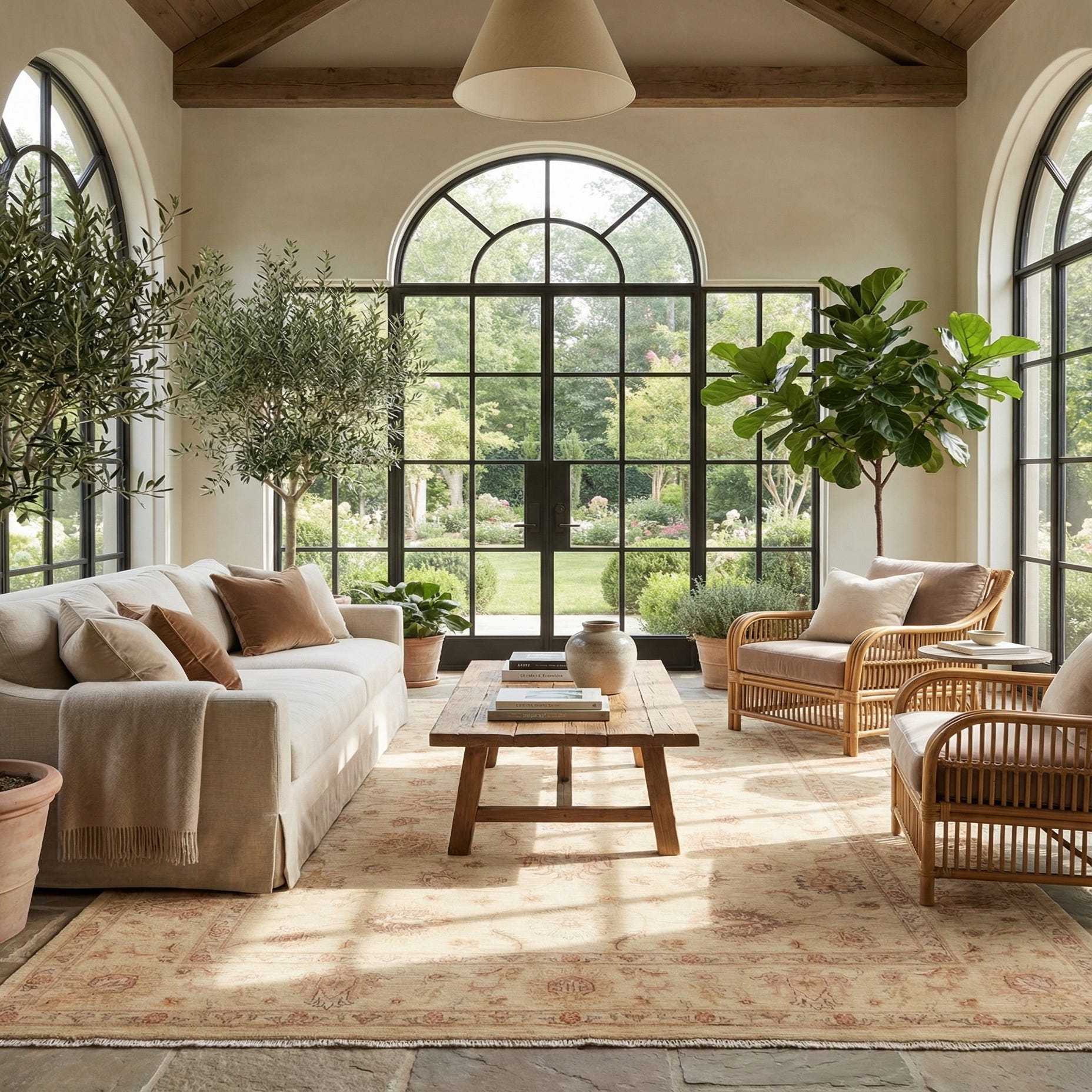 A 7x10 rectangular ivory and cream traditional area rug with a botanical and floral pattern, handmade from wool.