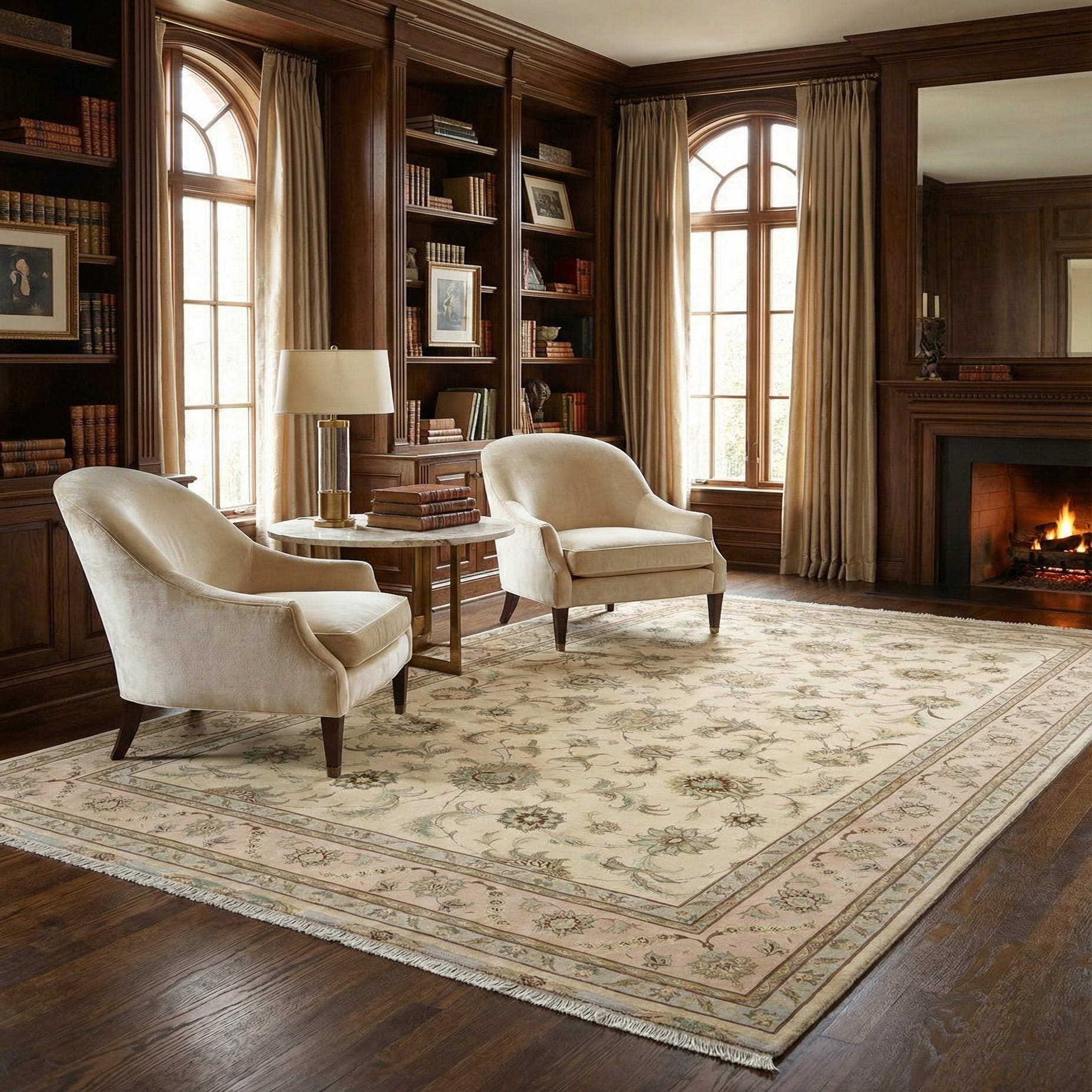 A 7x10 rectangular Tabriz Persian rug in ivory and cream with a detailed floral pattern and a blush pink border.
