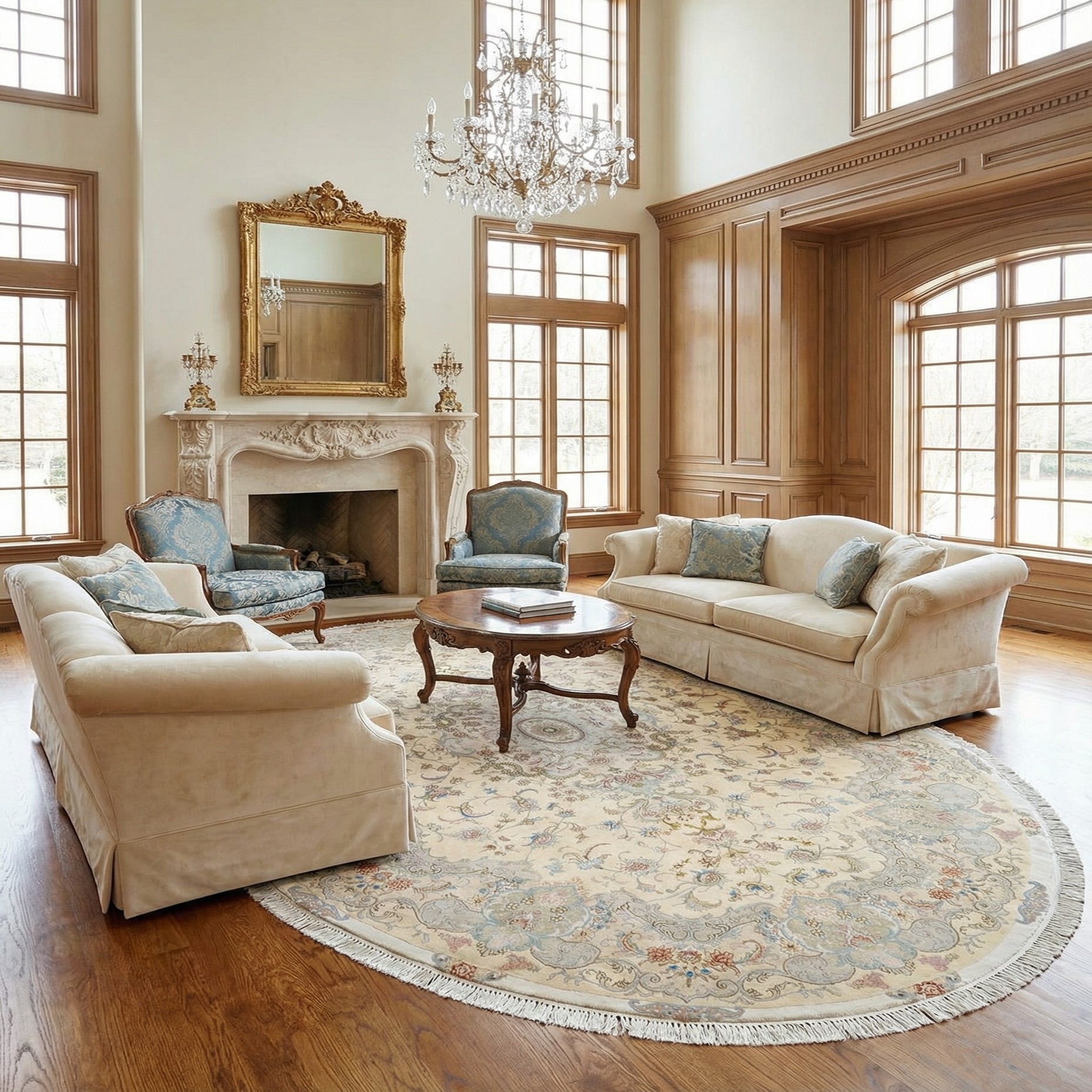 7x10 rectangular Rugs.com Tabriz rug with an ivory field and intricate Persian floral patterns in muted creams, blues, and reds.
