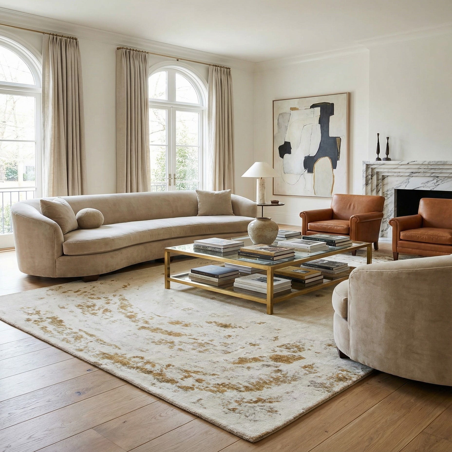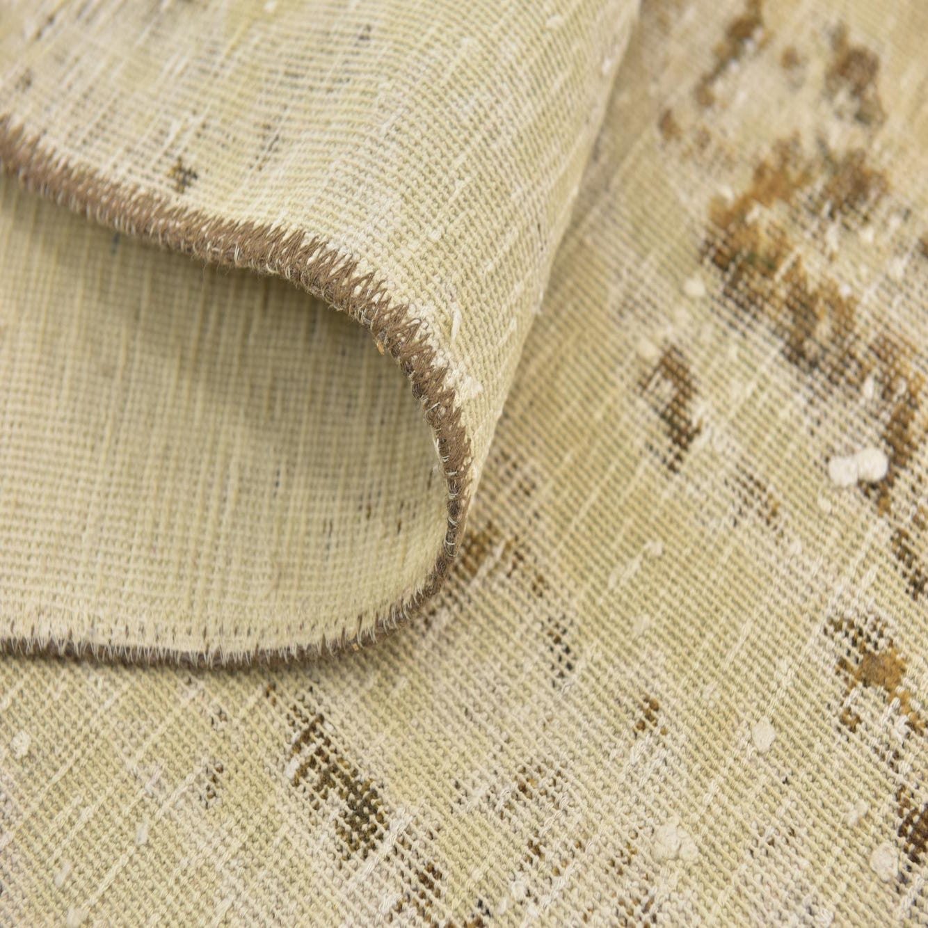 A 7x10 rectangular ivory wool rug with a distressed gold abstract pattern, suitable for a living room.