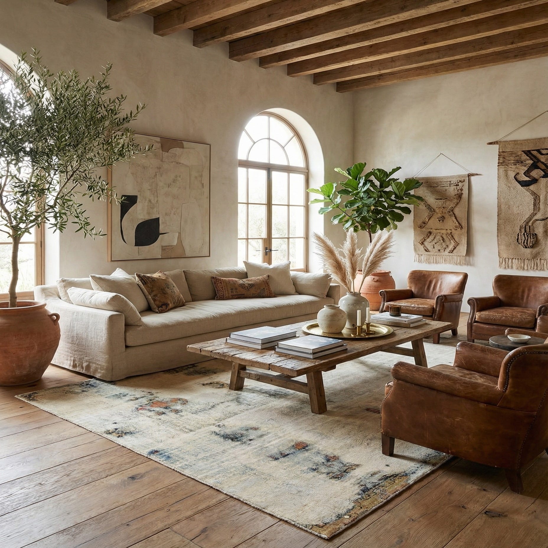 Well-suited to a range of interiors, this rug can anchor a living room seating area, layer beneath the lower two-thirds of a bed, or ground a dining table while keeping the room light and inviting. It pairs easily with natural wood furniture, linen upholstery and metal accents in matte black or brass, and complements styles from modern farmhouse and coastal to contemporary and transitional schemes. The cream background brightens a space while the navy and tan provide depth and the olive and peach accents add a subtle warmth.