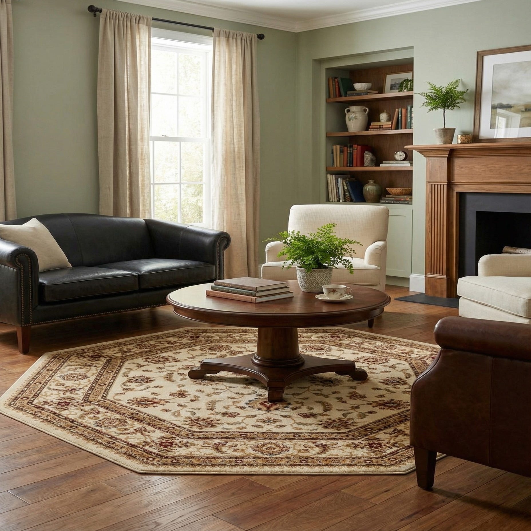 Underfoot the rug has a low-profile pile that feels smooth and slightly cushioned, holding its pattern definition while remaining easy to layer under furniture. Its octagonal shape is ideal for entryways, a foyer or beneath a round dining or bistro table, and it also anchors a seating vignette or study without overwhelming the space. Pair it with warm wood tones, upholstered neutrals and brass or antique-finish accents for a classic look, or mix it with painted furniture and light linens to soften a contemporary living area.