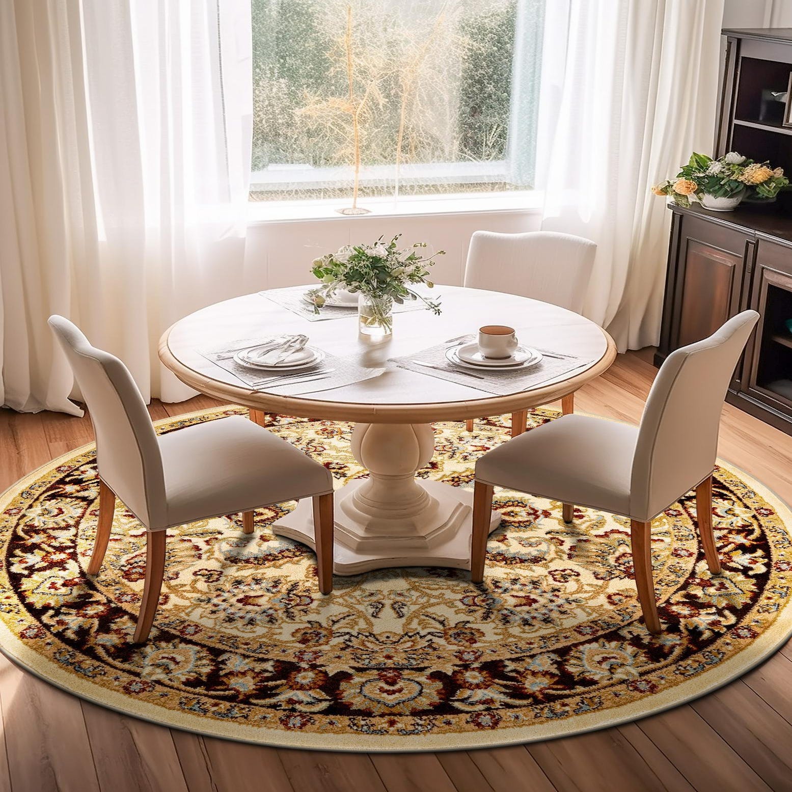 The Aditi collection presents a refined 8 Ft Round rug, machine woven from 100% polypropylene, offering durability and ease of maintenance. The pattern boasts traditional motifs with a symmetrical arrangement that exudes a classic charm. The primary cream background sets a neutral stage that allows the intricate details in brown, light blue, light green, red, peach, and tan to stand out, giving the rug a sophisticated palette that can integrate seamlessly into various design schemes.