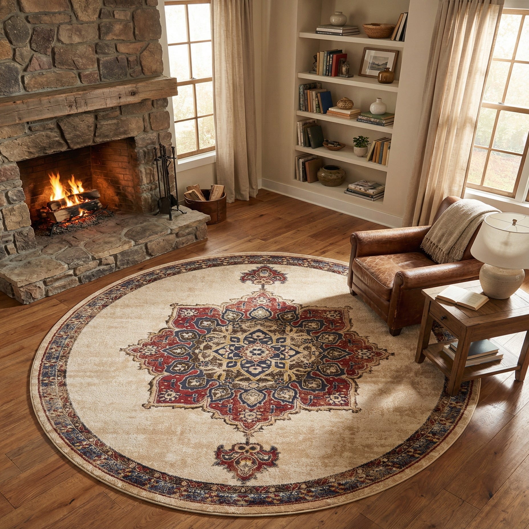 This piece works well beneath a round dining table or as a focal layer in a living area or bedroom seating nook. It pairs particularly well with warm wood furniture, leather accent chairs, navy or light-blue upholstery, and metallic accents in gold or brass, fitting transitional, traditional, or eclectic interiors that benefit from a grounded, patterned element.