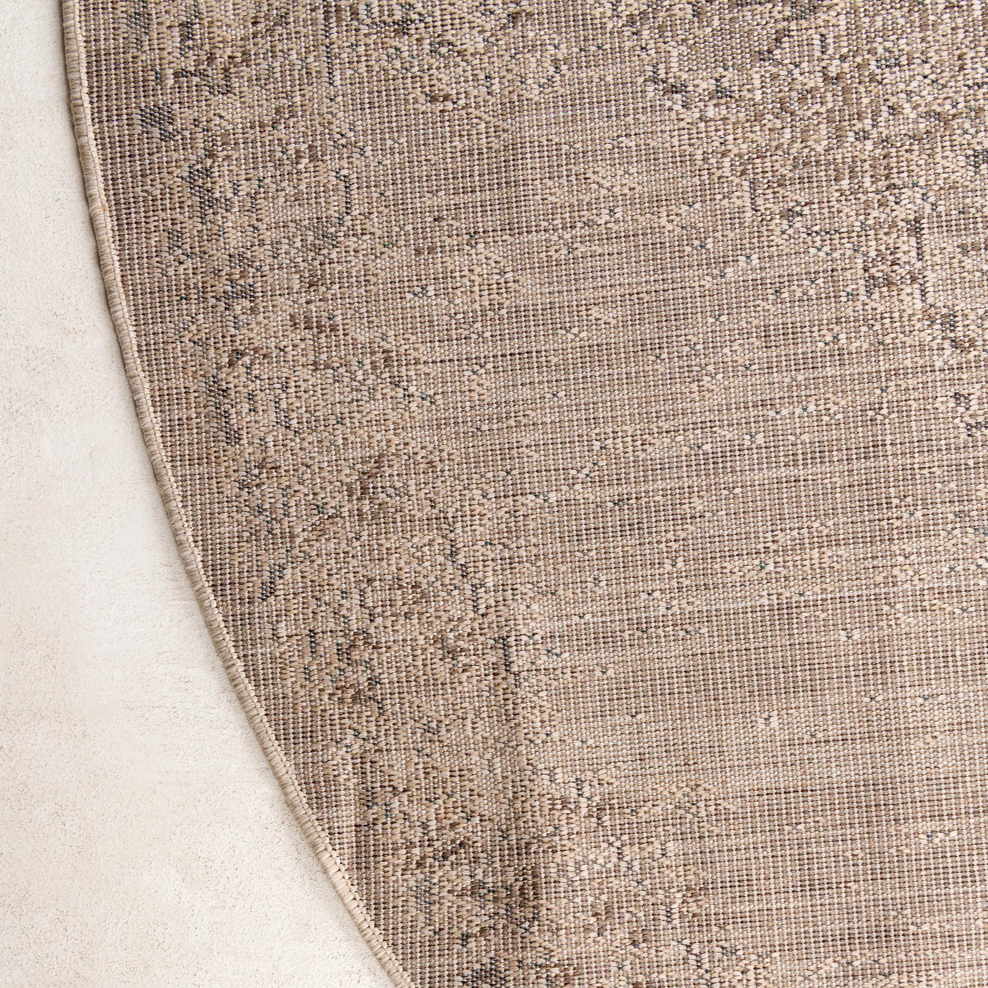 This round shape is ideal for anchoring a seating area or defining a cozy breakfast nook, and the neutral palette pairs naturally with warm woods, linen upholstery, and muted metal accents. The relaxed medallion styling works well in modern farmhouse, coastal, transitional, and Scandinavian-inspired interiors where a soft, lived-in look is desired.