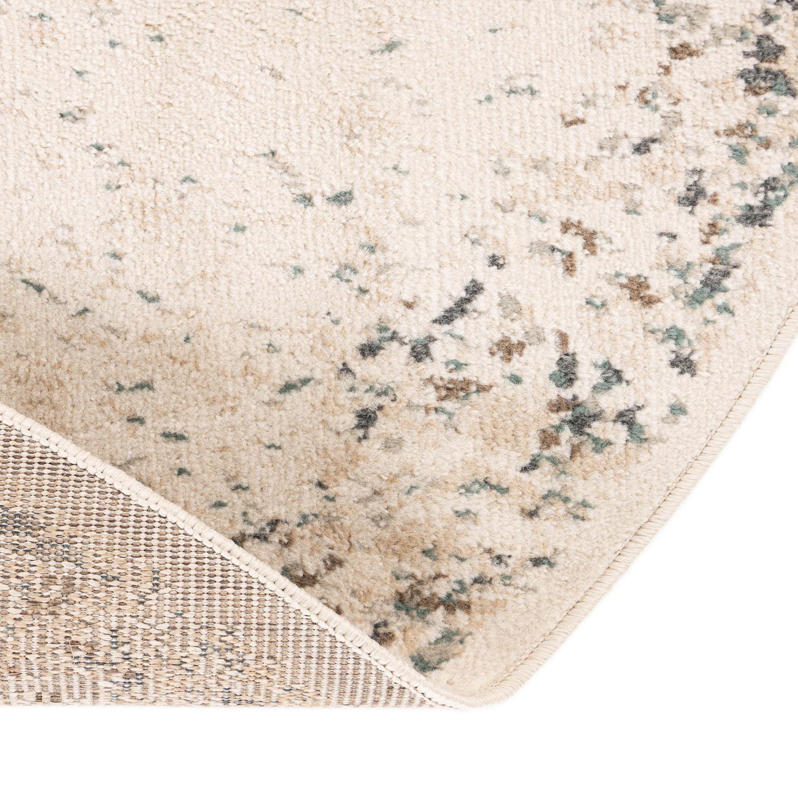 A soft cream field sets the stage for a faded medallion motif worked in warm beige, brown, and touches of gray. The pattern has a gently distressed, speckled finish and a subtle outer border that gives the rug a lived-in, vintage-inspired character. Machine-made of 100% polypropylene, the low-profile pile has a smooth, slightly cushioned hand that layers easily beneath furniture while keeping the design crisp and legible.