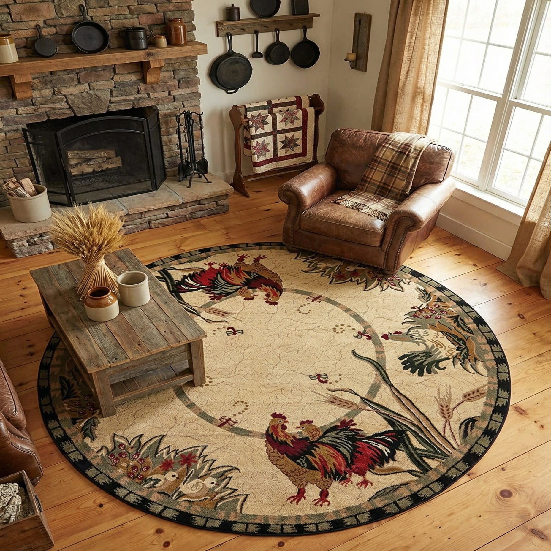 A warm cream field sets the stage for a traditional country motif of roosters, wheat stalks and leafy sprays rendered in black, olive, green, light brown, tan, red and rust red. A subtle circular medallion anchors the design while the outer band, edged in black with tan and olive checks, frames the scene. The roosters' plumage is worked in layered shades of red, rust and black with fine accents that give the feathers and floral details clear definition against the neutral background.