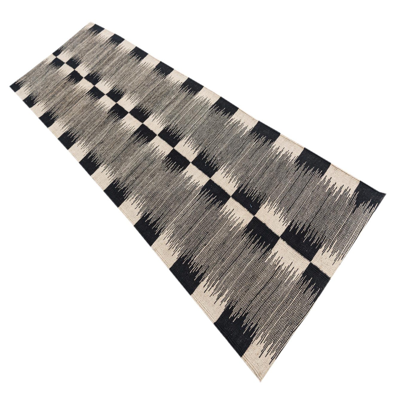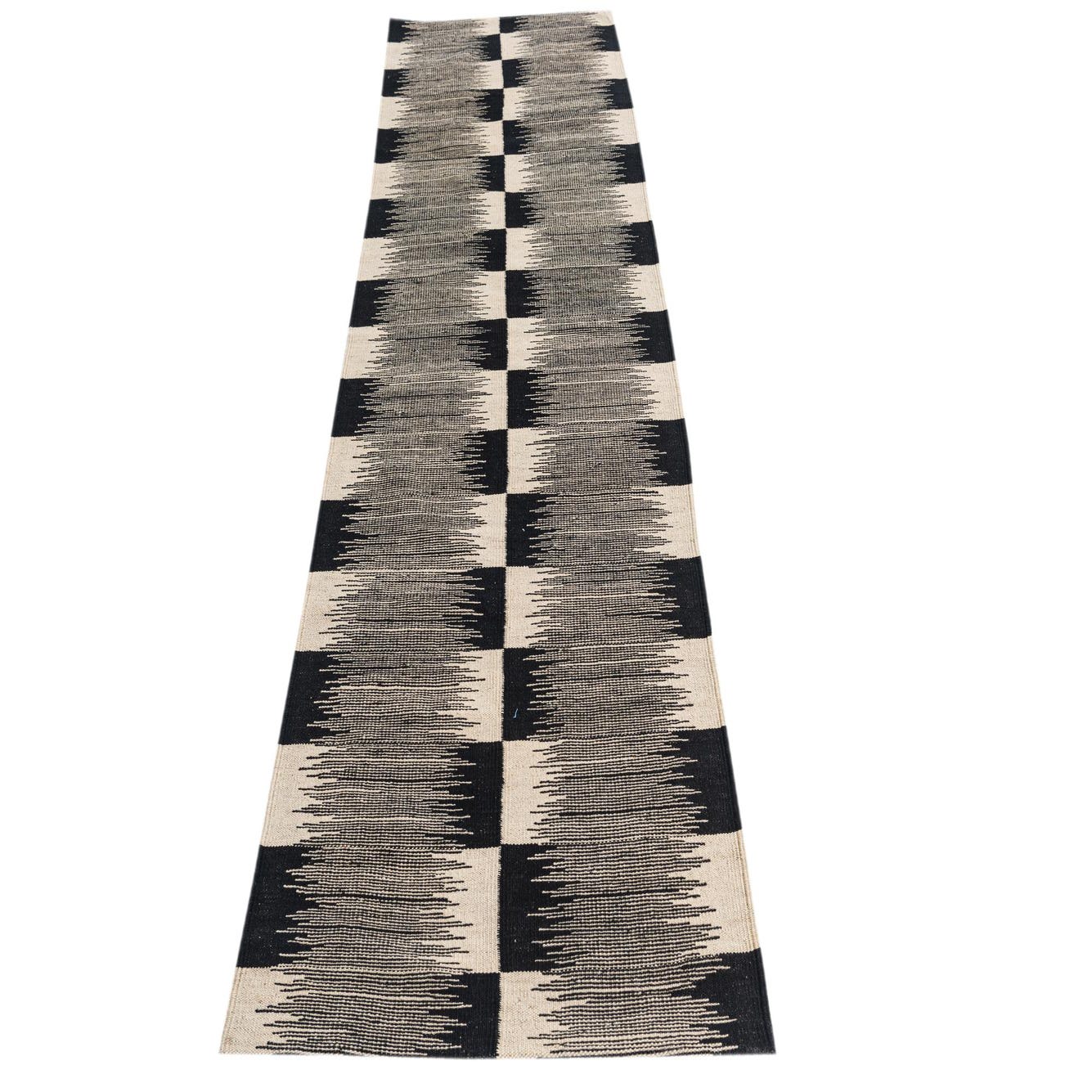 An 8 ft runner rug featuring a modern tribal pattern with ivory and black alternating blocks, suitable for a hallway or kitchen.