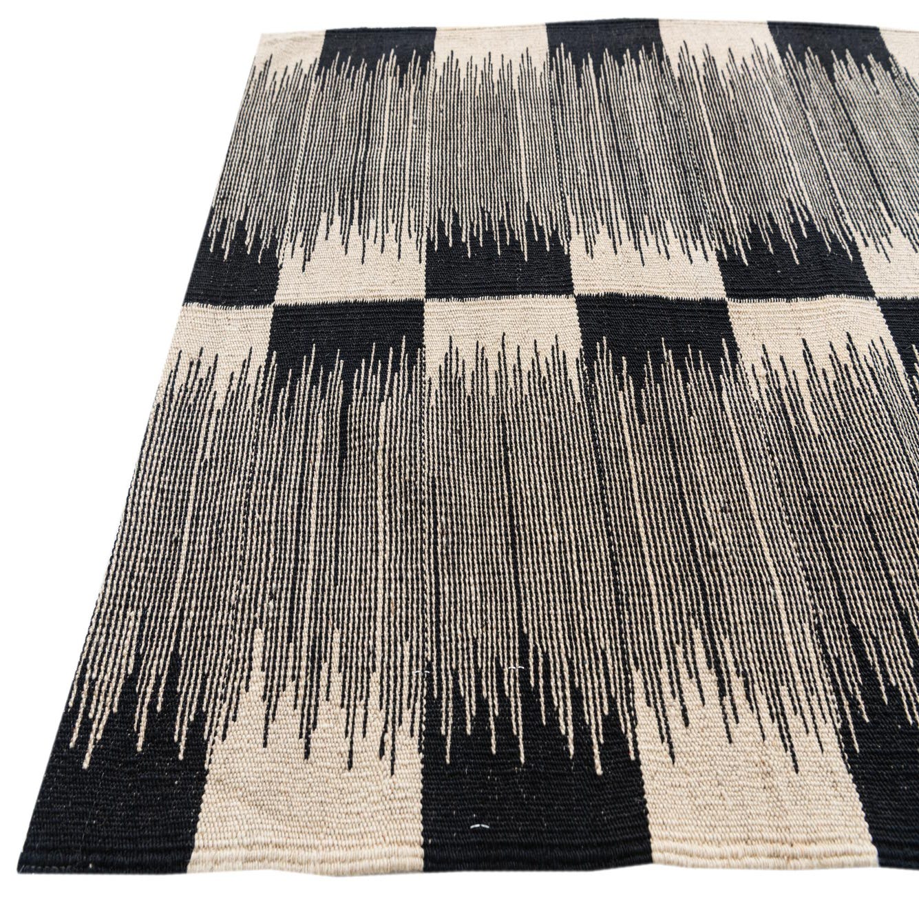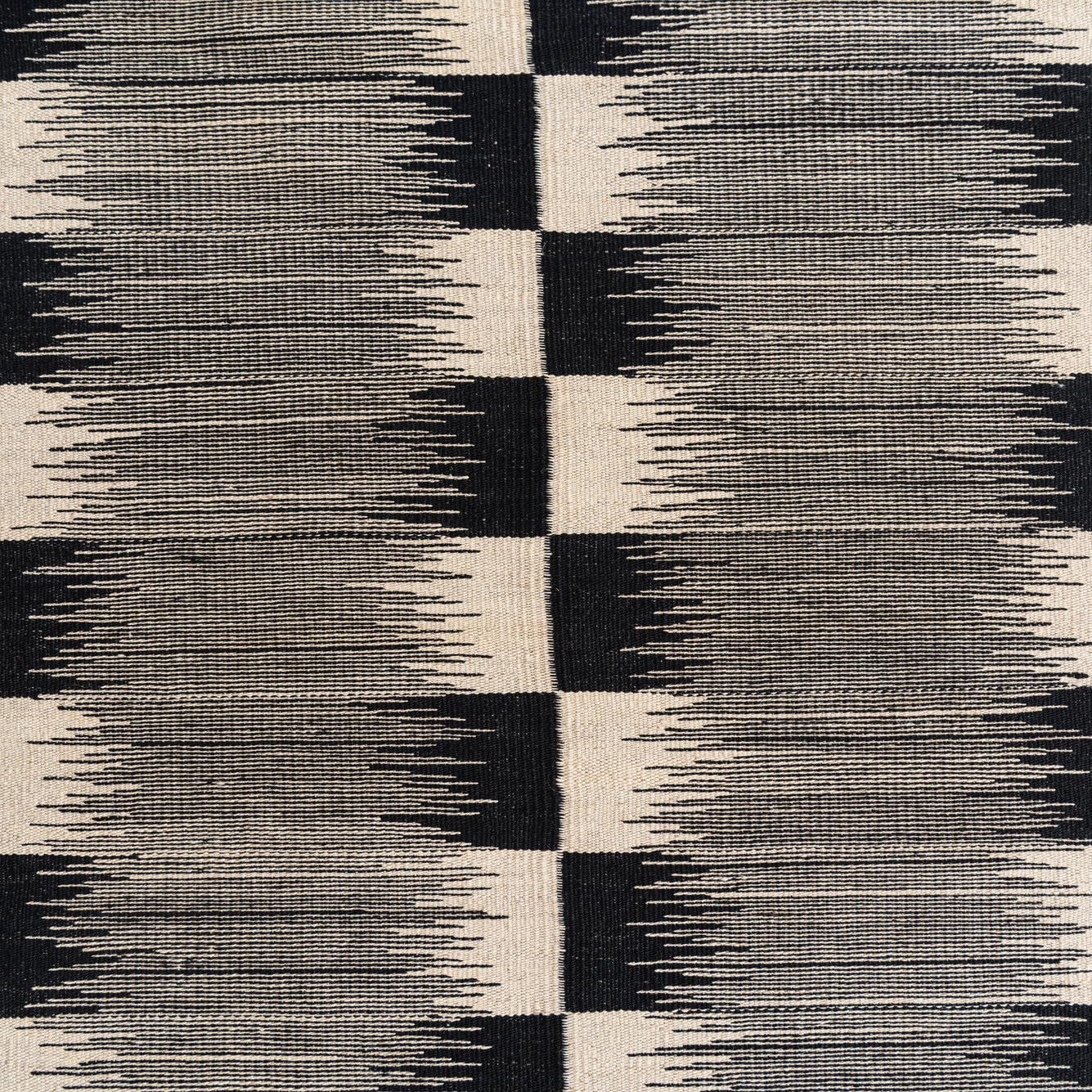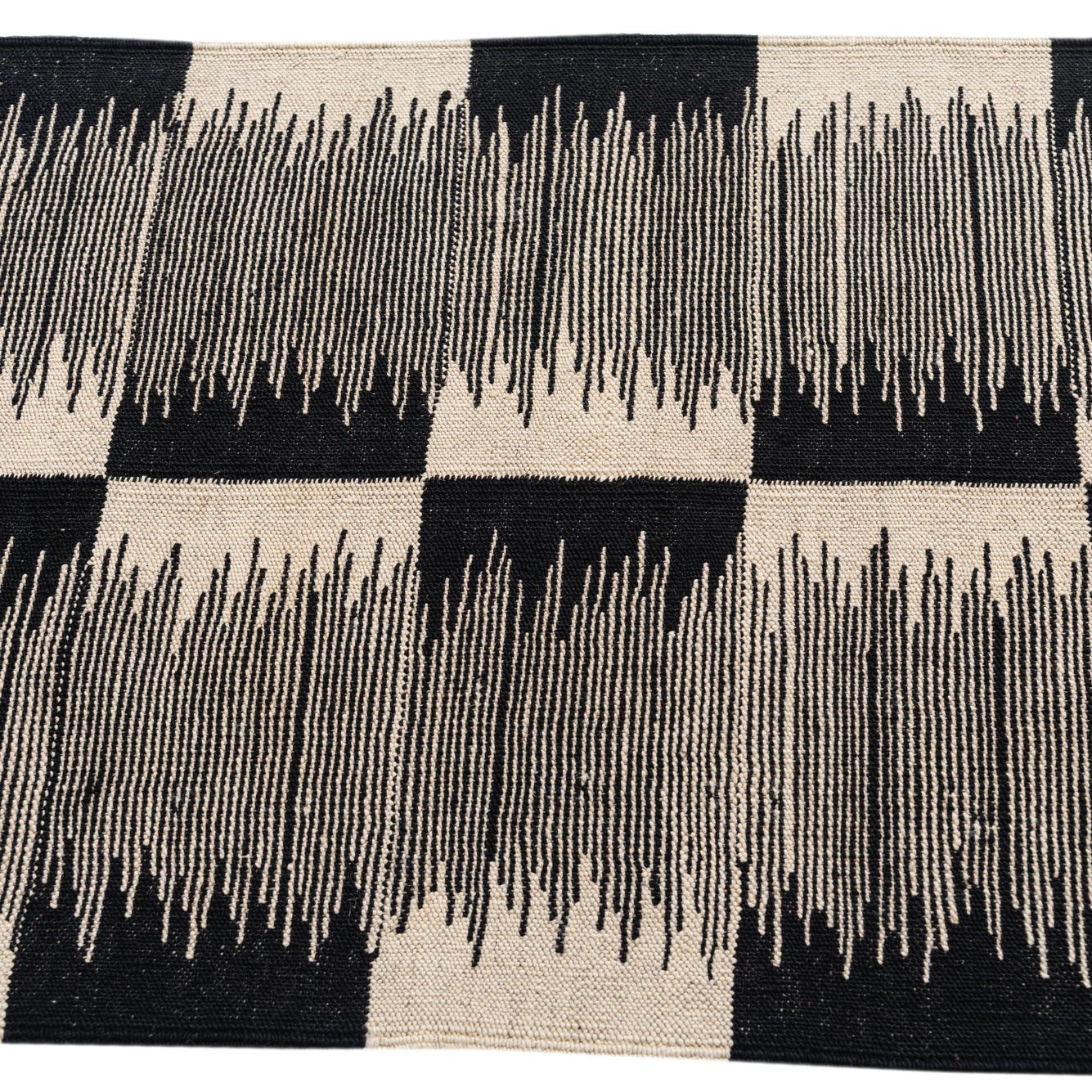 The Kilim Modern collection presents a hand-woven 8 Ft runner crafted from 100% wool, offering durability and natural resilience against everyday wear. This runner features a dynamic and linear pattern, showcasing bold black motifs on a cream background, creating visual contrast and interest. The pattern is reminiscent of traditional kilim designs with a contemporary twist, adaptable to a wide range of home decor styles.