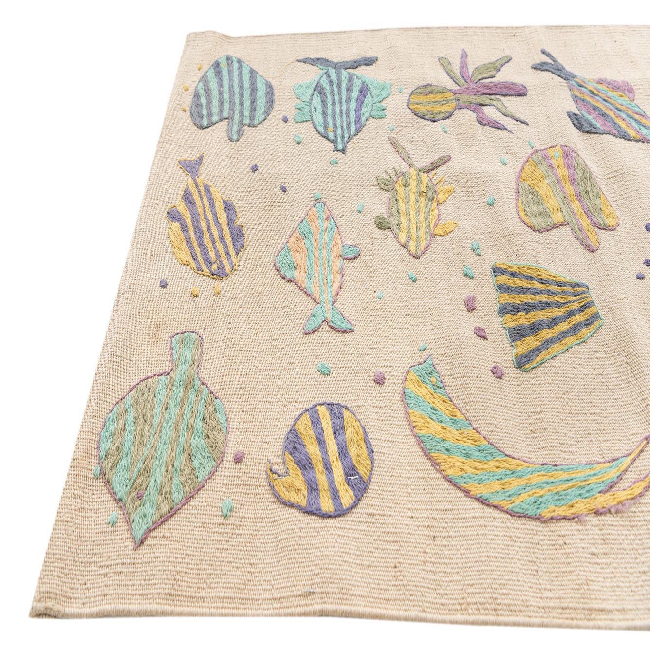 An 8 ft Kilim Suzani runner rug with a cream background and colorful tribal fish and plant motifs in teal, yellow, purple, and orange.