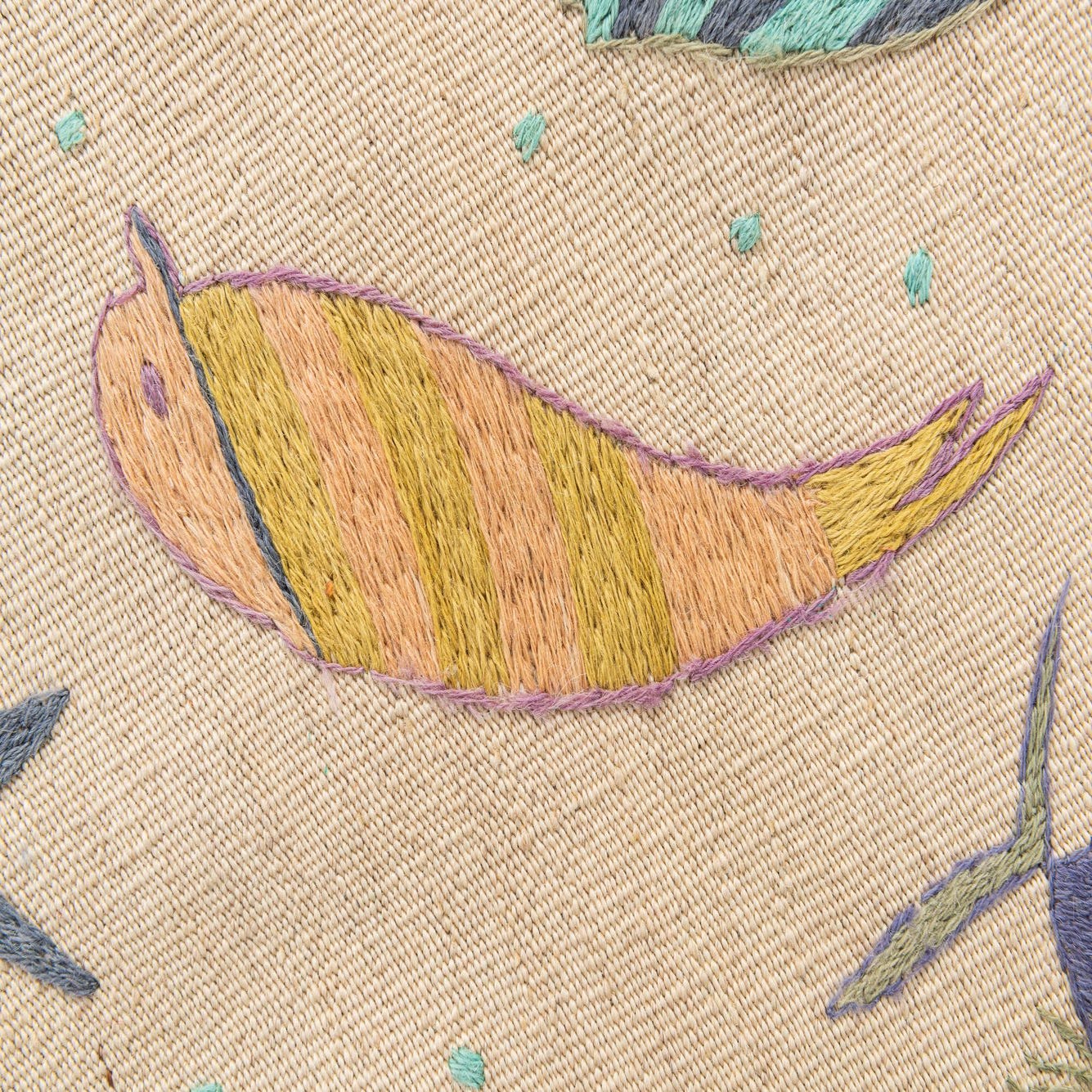 Primary color is Cream. Colors in this rug include: Cream, Olive, Turquoise, Yellow, Violet, Gray.