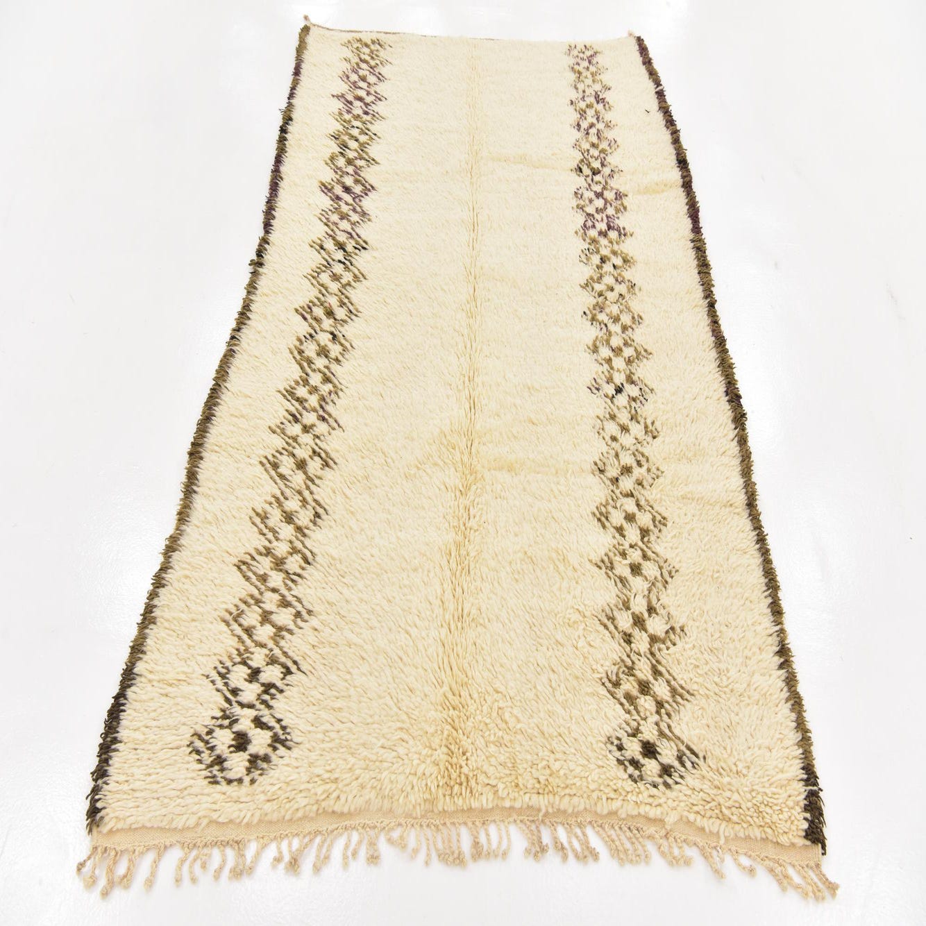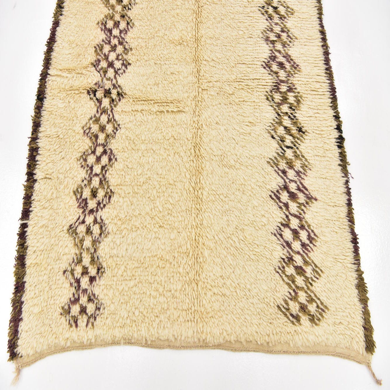 An 8 ft ivory shag runner rug with two vertical tribal patterns in brown and purple, suitable for a hallway.