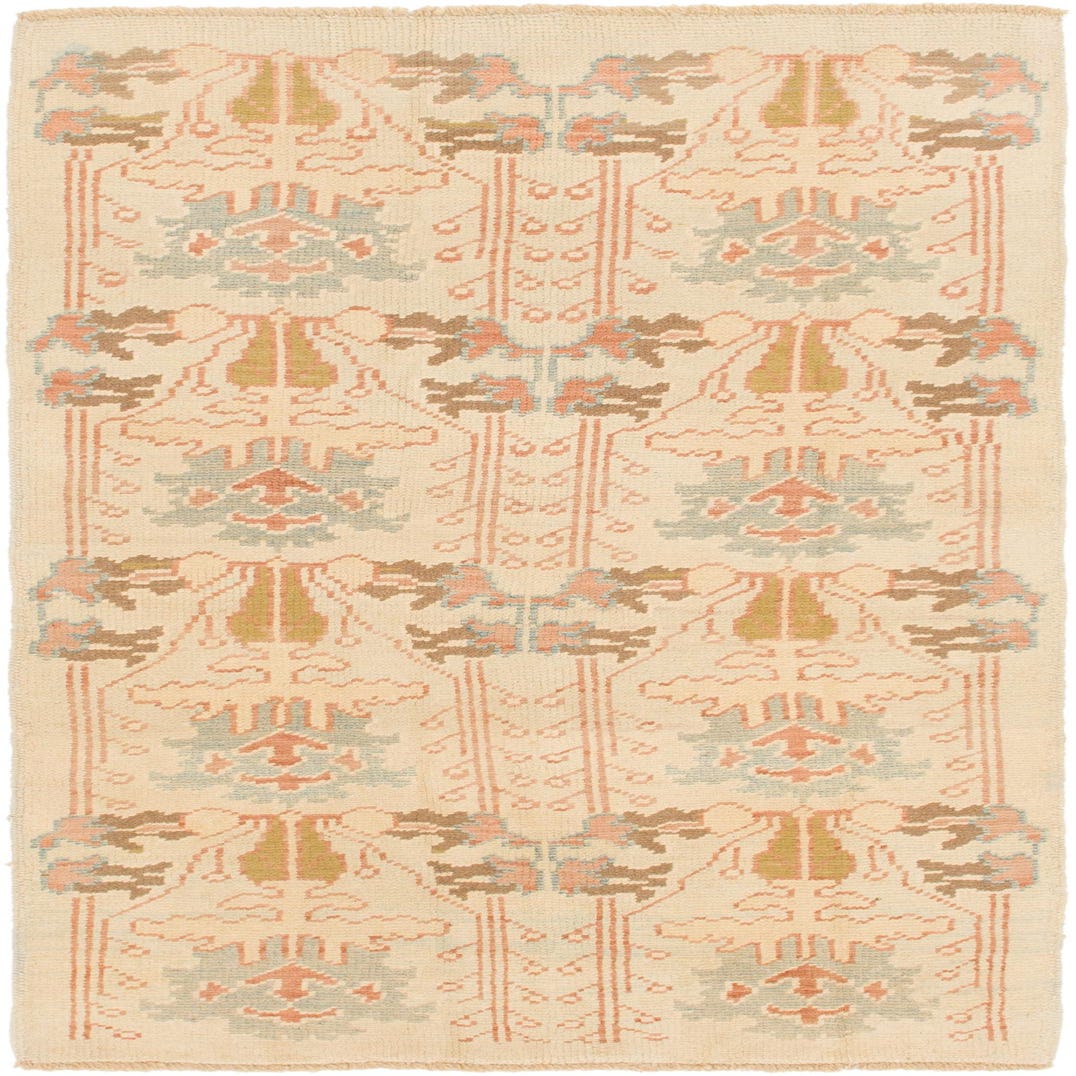 Primary color is Cream. Colors in this rug include: Cream, Brown, Blue, Peach, Olive.