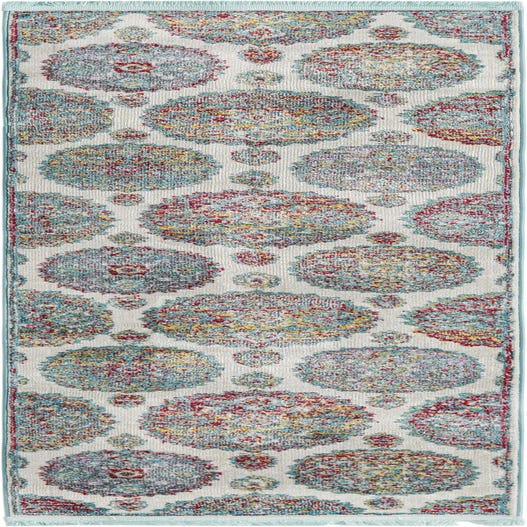 A repeating medallion motif punctuates a cream field, each circular medallion built from a finely speckled blend of blue, gray, green, red, yellow and pink. The pattern has a vintage-inspired, slightly distressed look that feels both classic and relaxed, with smaller teardrop motifs set between the larger round forms for added rhythm. Machine made of 100% polypropylene, the rug has a low, even pile that feels smooth underfoot and holds color definition well; the ends are finished with short fringe for a casual, finished edge.
