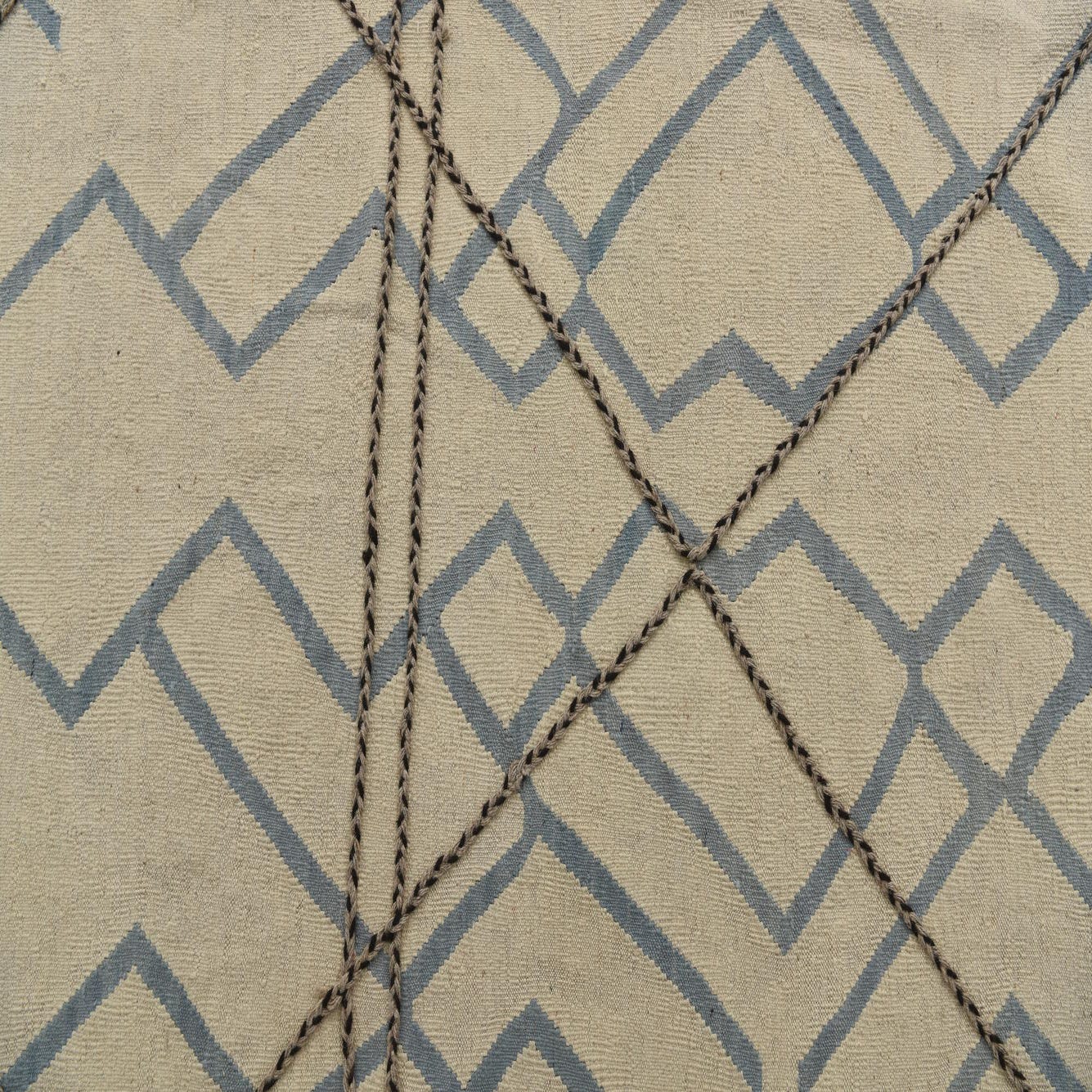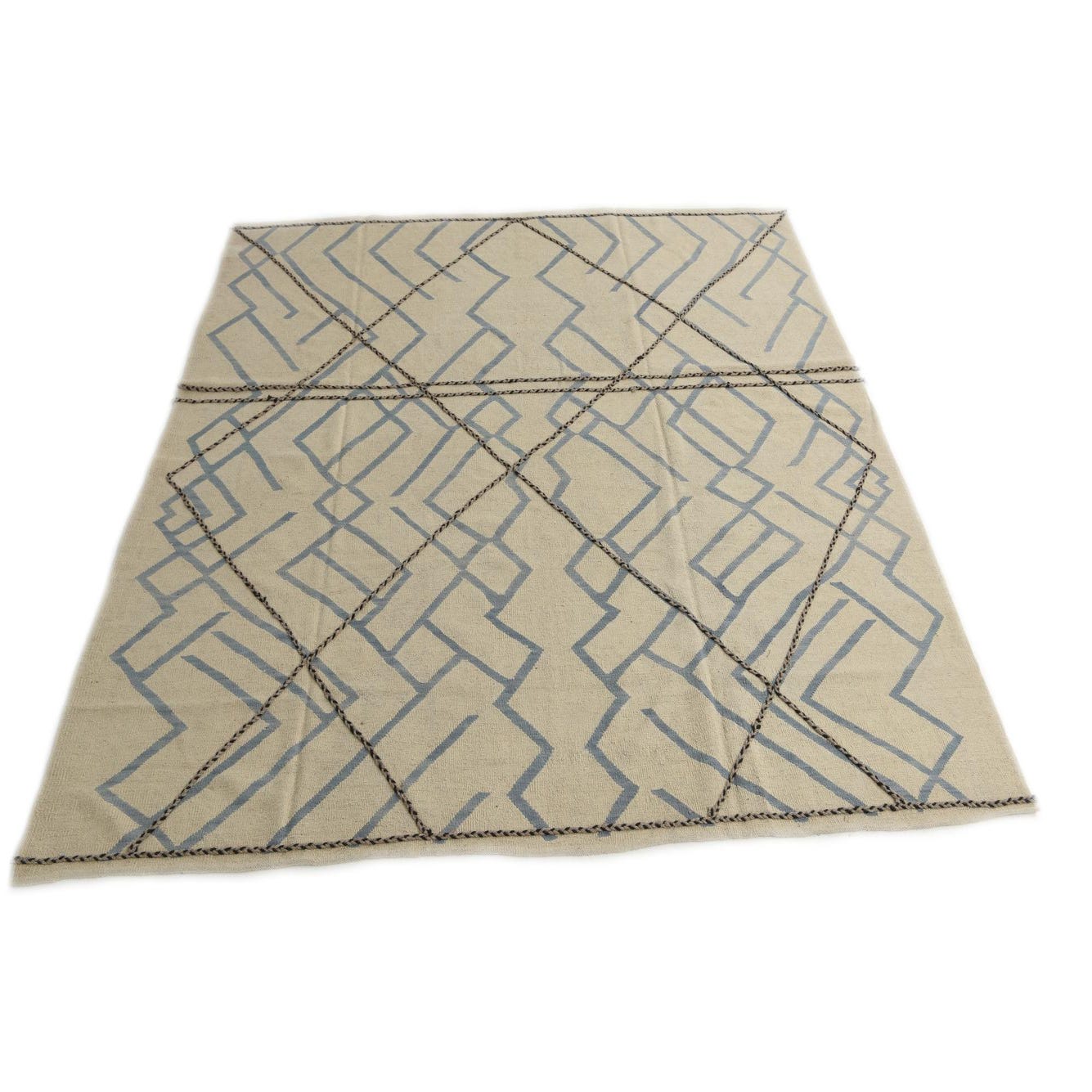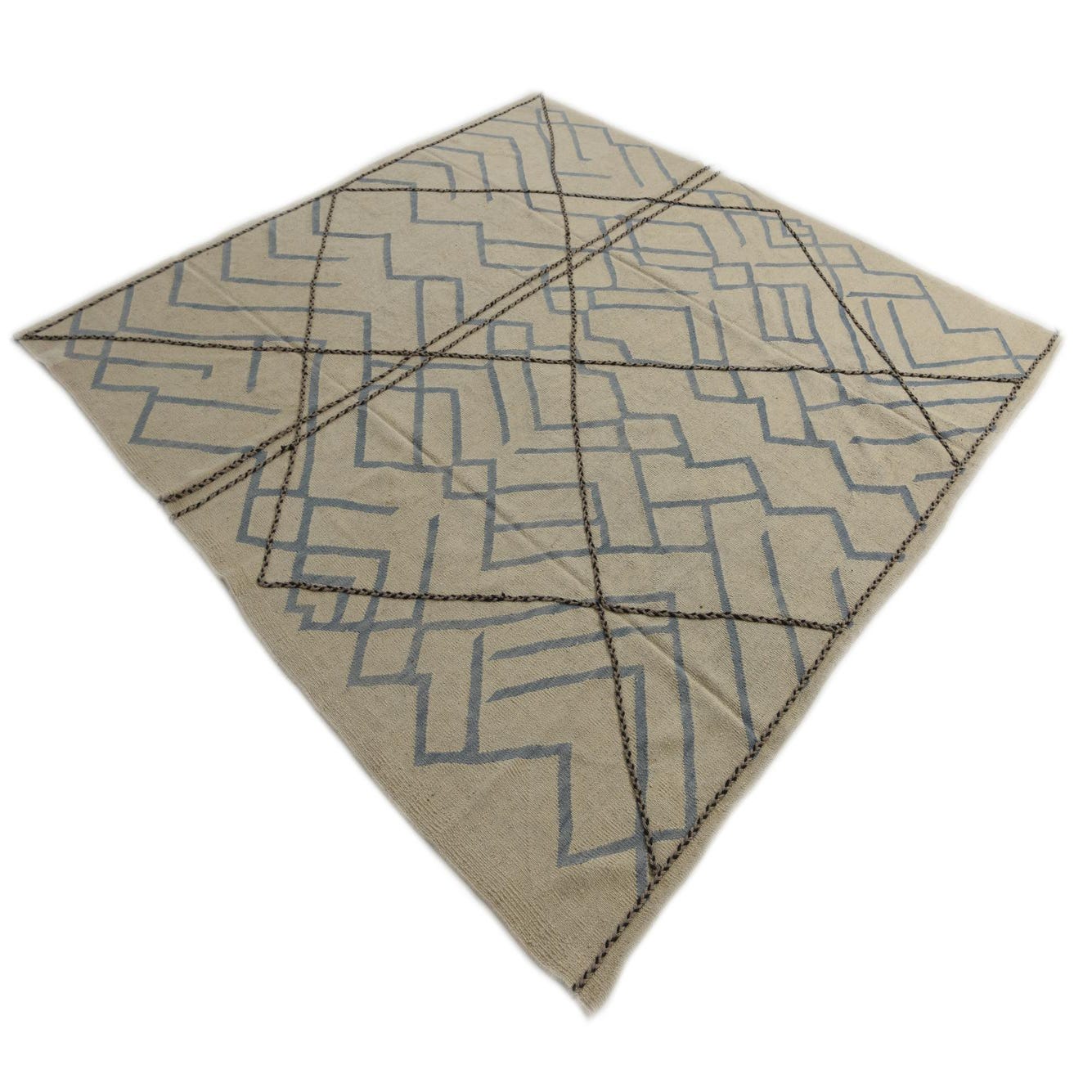 A square 8' 3 x 8' 5 Kilim Modern rug with an ivory background and light blue abstract tribal patterns, accented with dark brown diagonal stitching.
