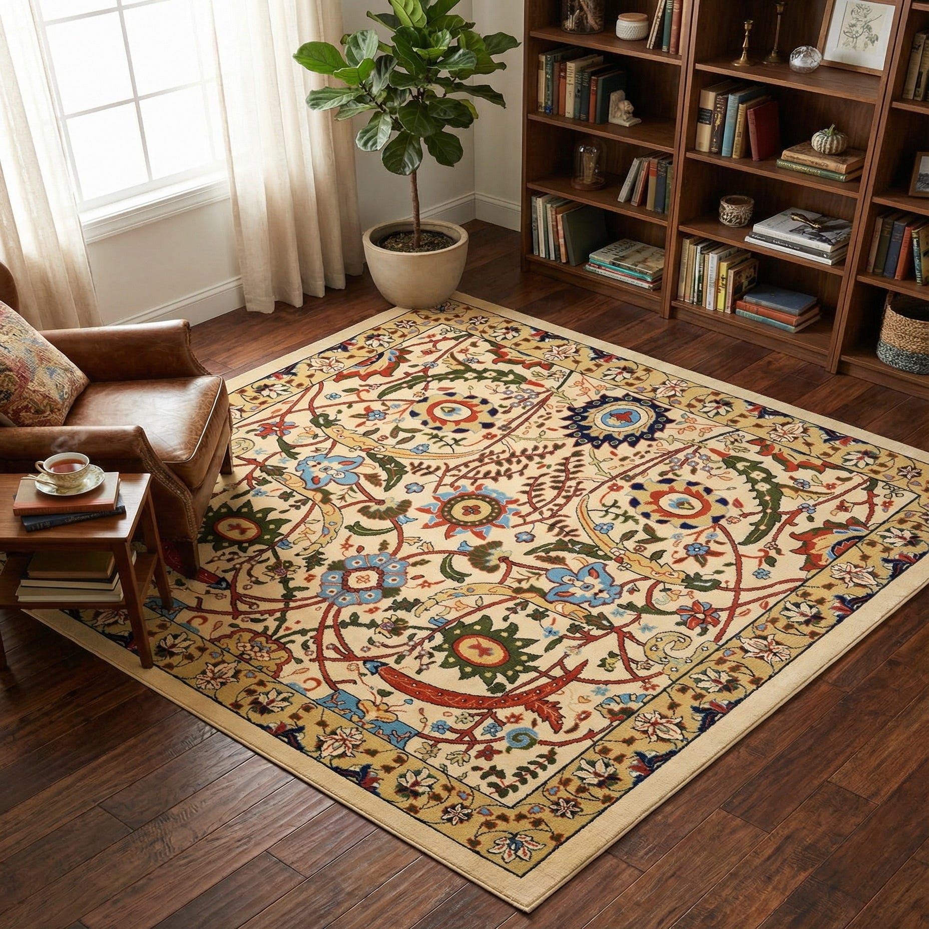 A classic Persian-inspired floral design unfolds across a cream ground, with an overall medallion and scrolling vine pattern that reads both ordered and lively. Stylized rosettes, palmettes and trailing blooms are rendered in navy blue, sky blue, red, light green, tan and black, with a narrow tan border of repeating floral motifs that frames the composition. The balanced layout and refined color mix give the rug an approachable traditional look that complements both formal and relaxed settings.