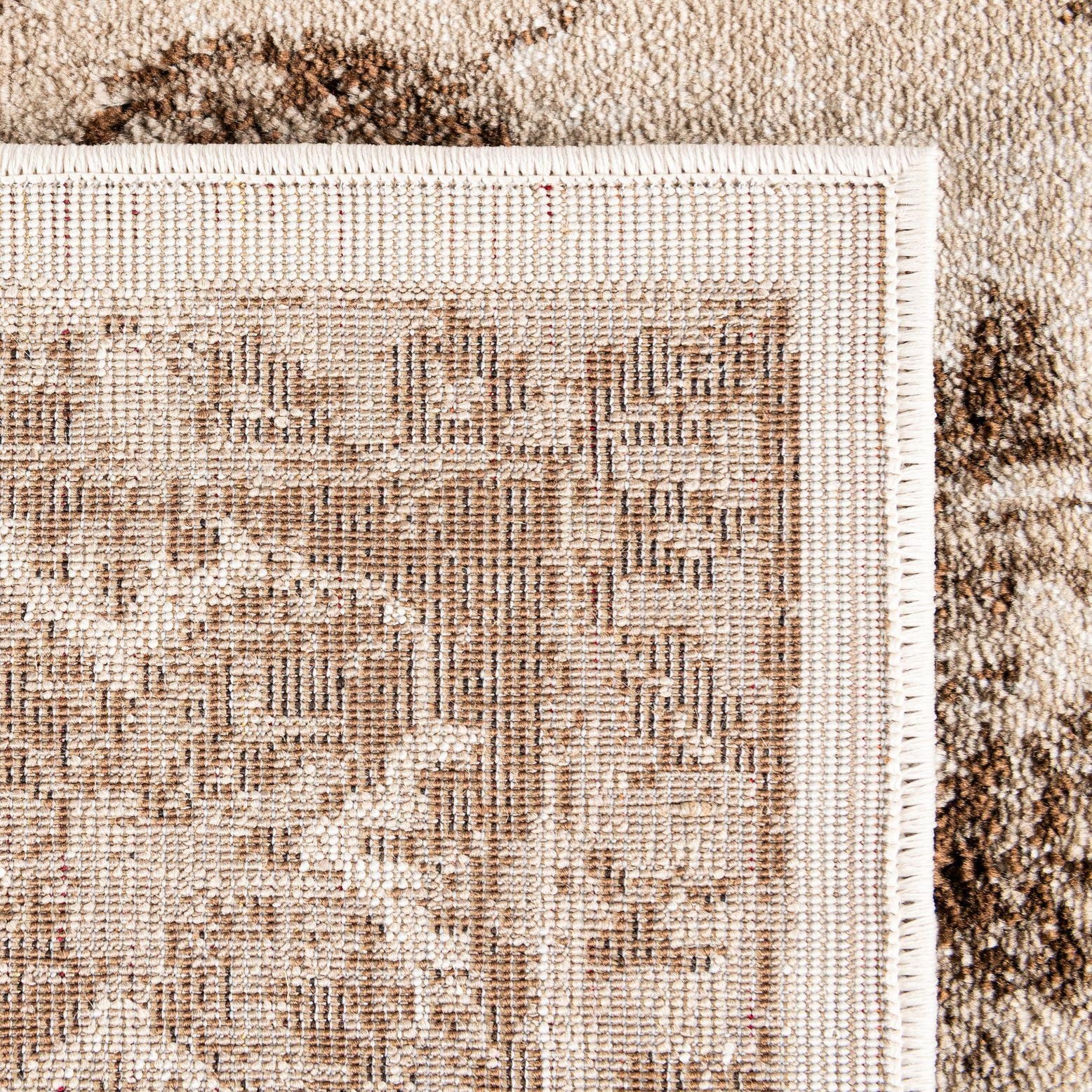 A softly worn medallion design brings classic character to a neutral palette. The cream background provides a bright, airy foundation while beige, light brown and richer brown motifs form an antique-inspired central medallion, scrolling vines and a pronounced border with a distressed, timeworn effect. The machine-made construction of 55% polypropylene and 45% polyester produces a low-to-medium pile that feels smooth and slightly lustrous underfoot, with a tightly woven surface and neatly finished edges.