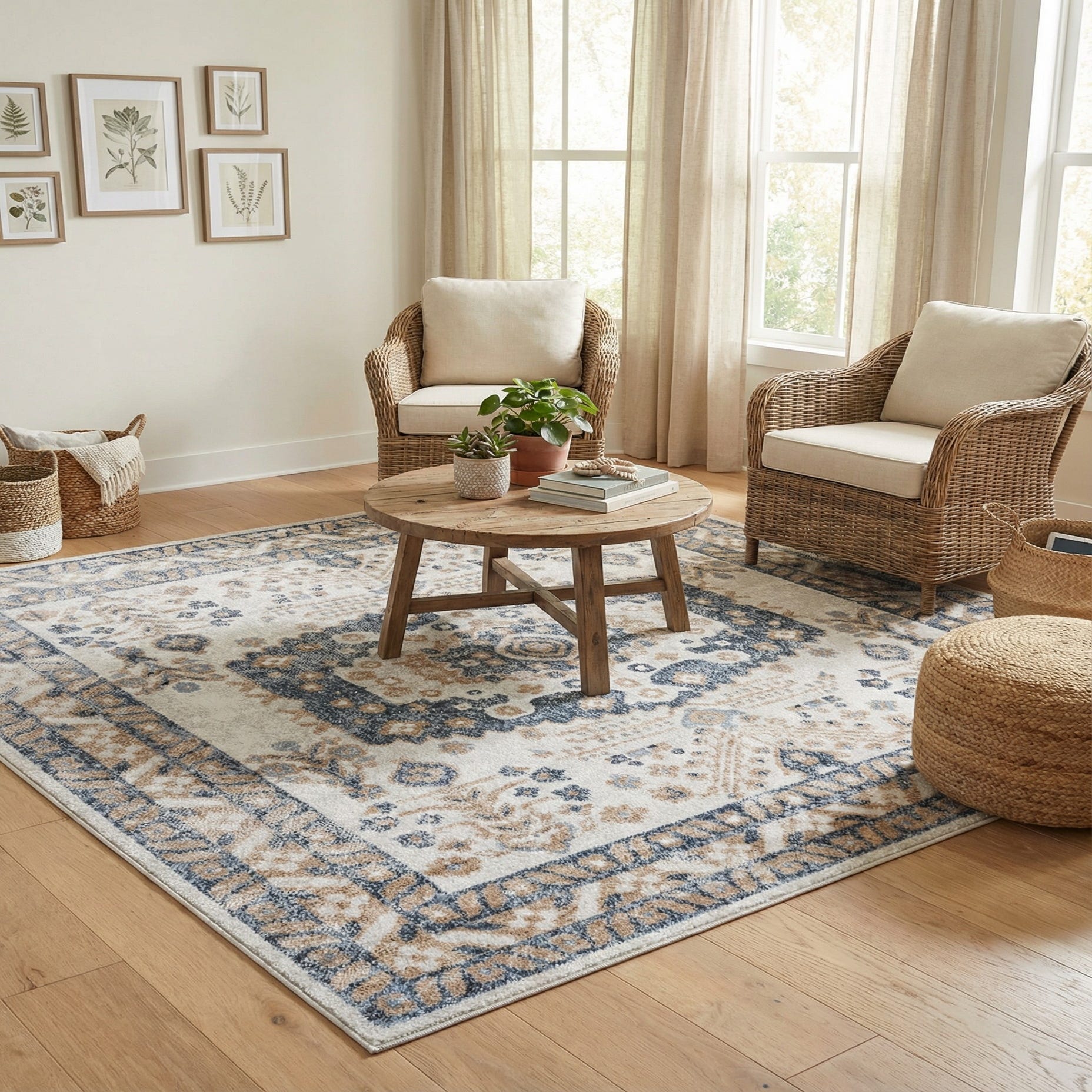 A classic medallion pattern with a softly worn look gives this rug a timeless presence. The cream ground sets a light, airy stage for navy blue and warm brown motifs that form a central medallion and an ornate border. Ivory highlights add subtle contrast while the machine-made construction in 100% polypropylene creates a low-profile pile with a smooth, slightly plush feel underfoot. The surface has a gentle, brushed texture that invites you to run your hand across the pattern and appreciate the layered colorwork.
