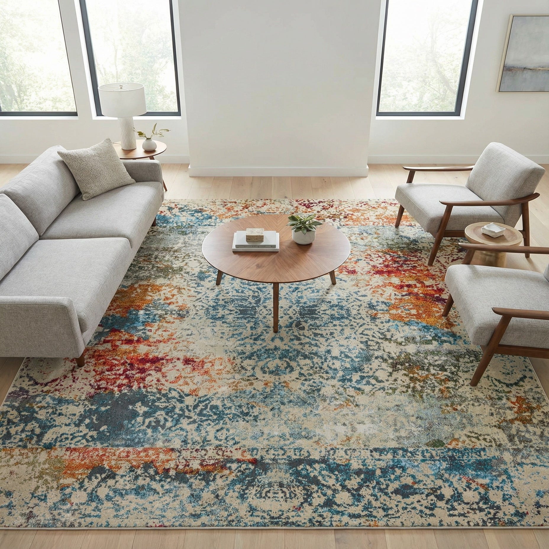 This layered colorway and softened pattern work well in a range of interiors: anchor a neutral living room to introduce color without overwhelming existing decor, place it under a dining table to add warmth and visual interest, or use it in a home office to bring an approachable, creative tone. The mix of warm golds and reds with cool blues and gray pairs nicely with light wood furniture, matte metal accents, and textured linens—suiting contemporary, transitional, and eclectic schemes.
