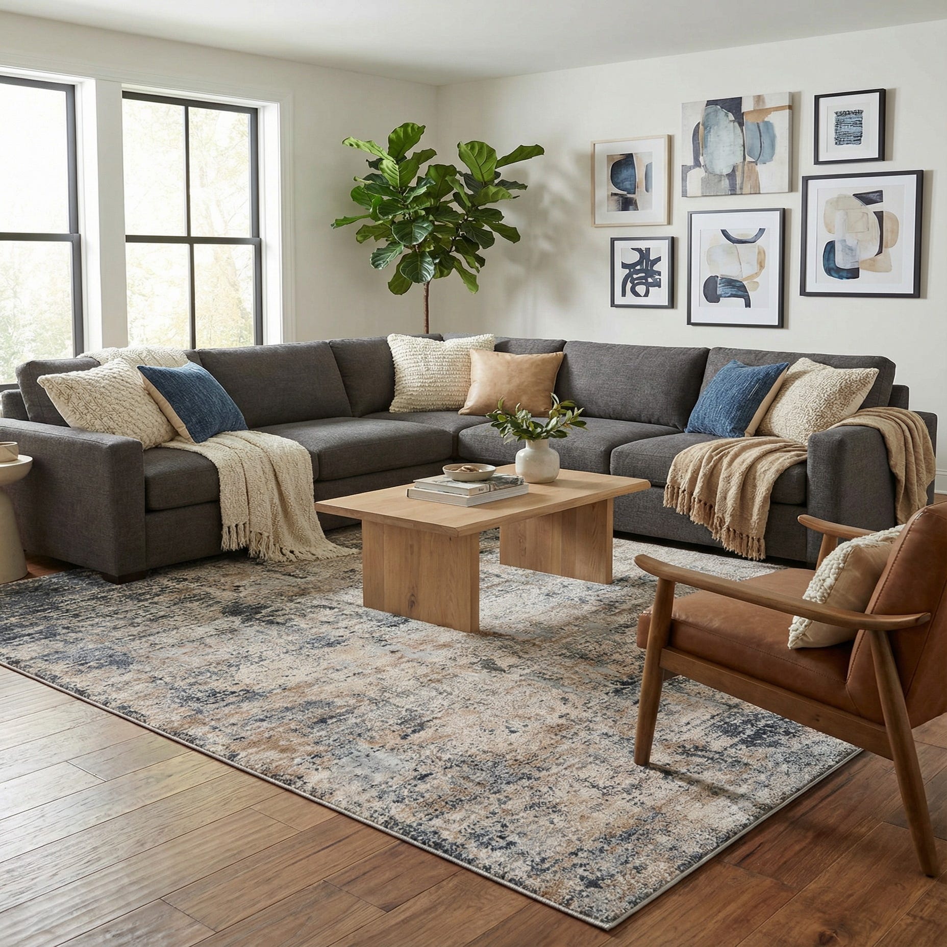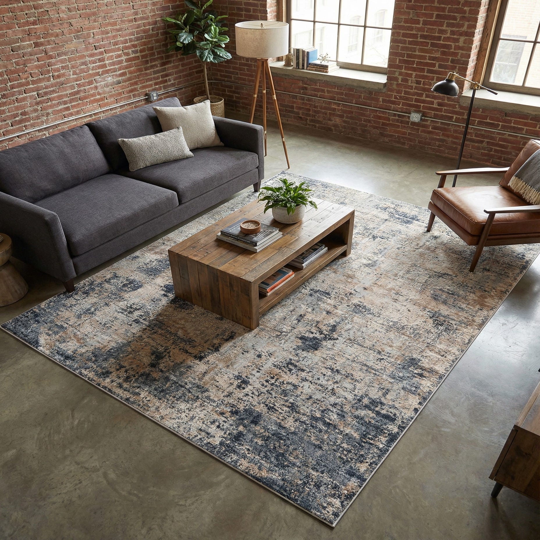 This rug fits well in a range of interiors: place it beneath a sofa and coffee table in a contemporary living room to anchor neutral upholstery and navy accent pillows, or layer it under a light-wood dining table to add textural interest to a modern farmhouse or transitional space. It also works nicely in a bedroom or home office where muted color and soft texture help establish a calm, pulled-together look. The machine-made construction and blended fibers make it an easy choice when you want a refined, lived-in aesthetic.