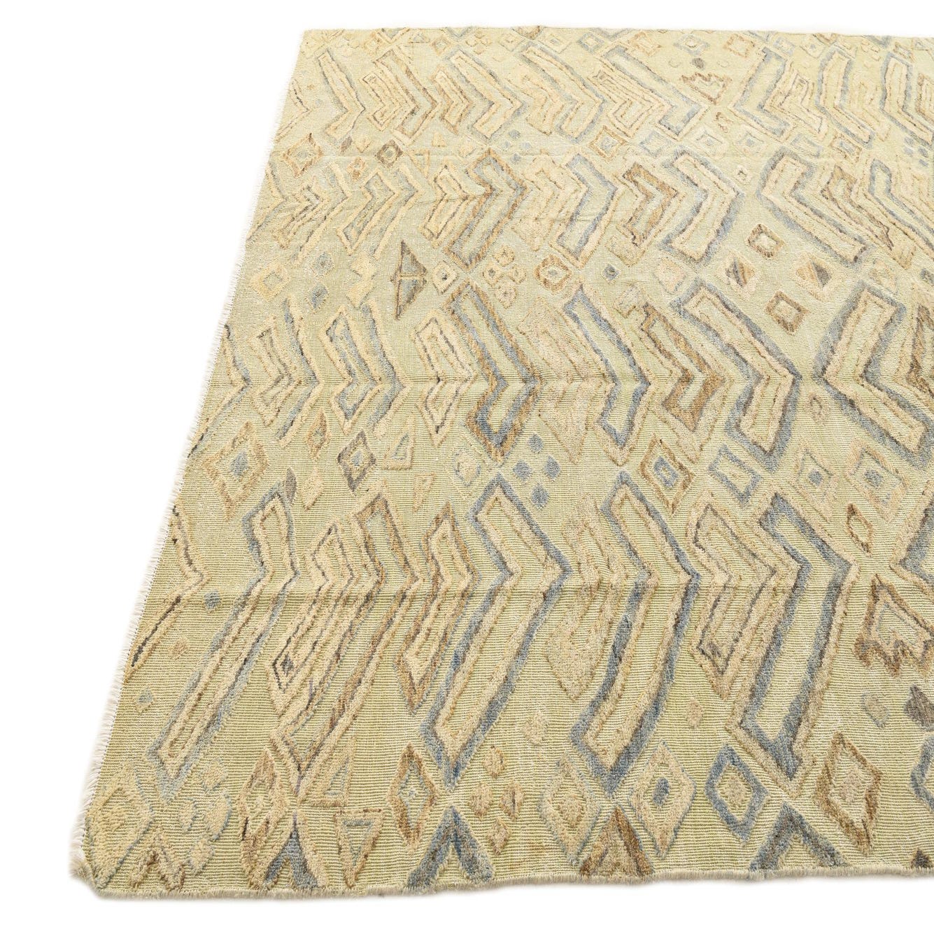An 8x10 rectangular ivory wool rug with a modern abstract pattern in textured cream, blue, and brown tones.