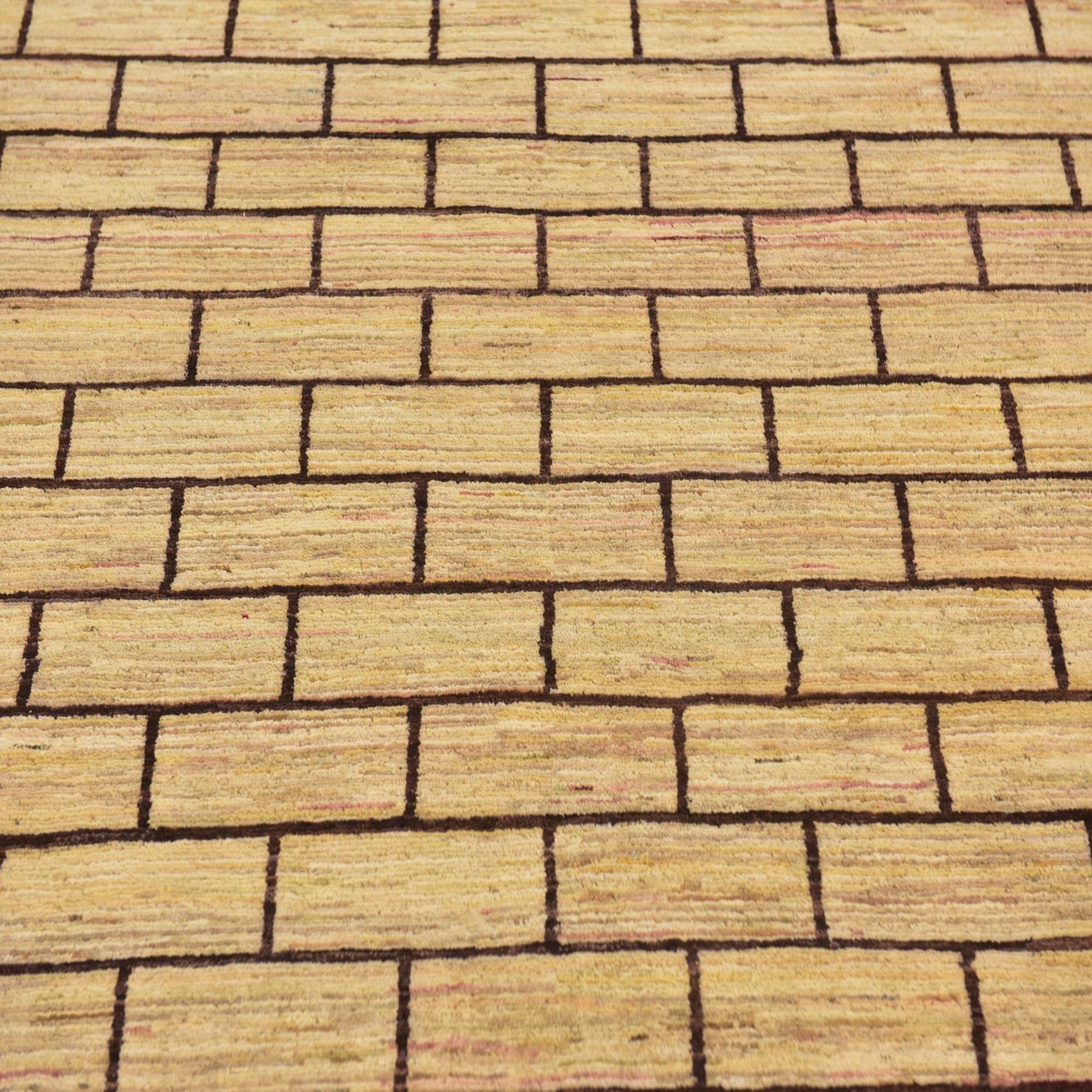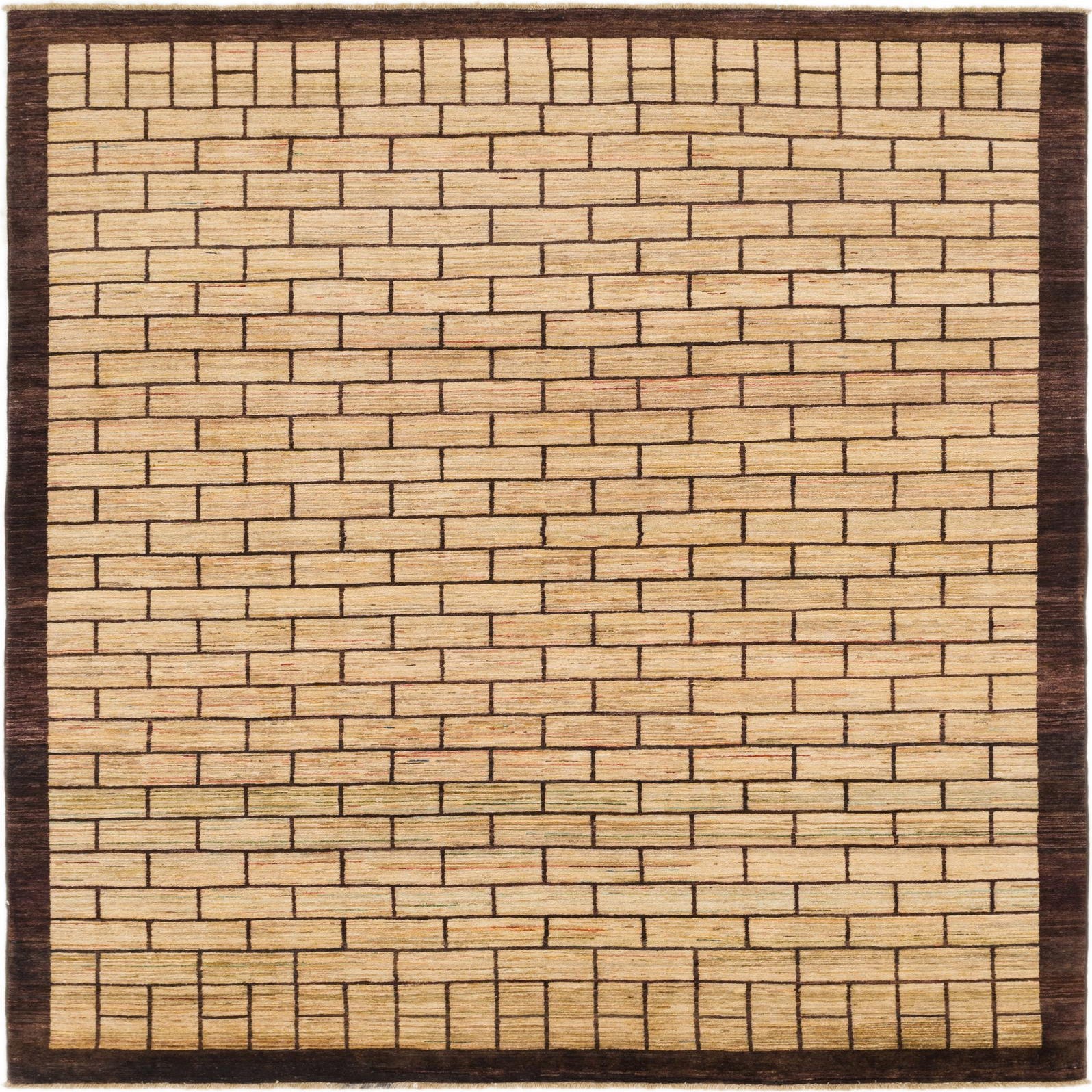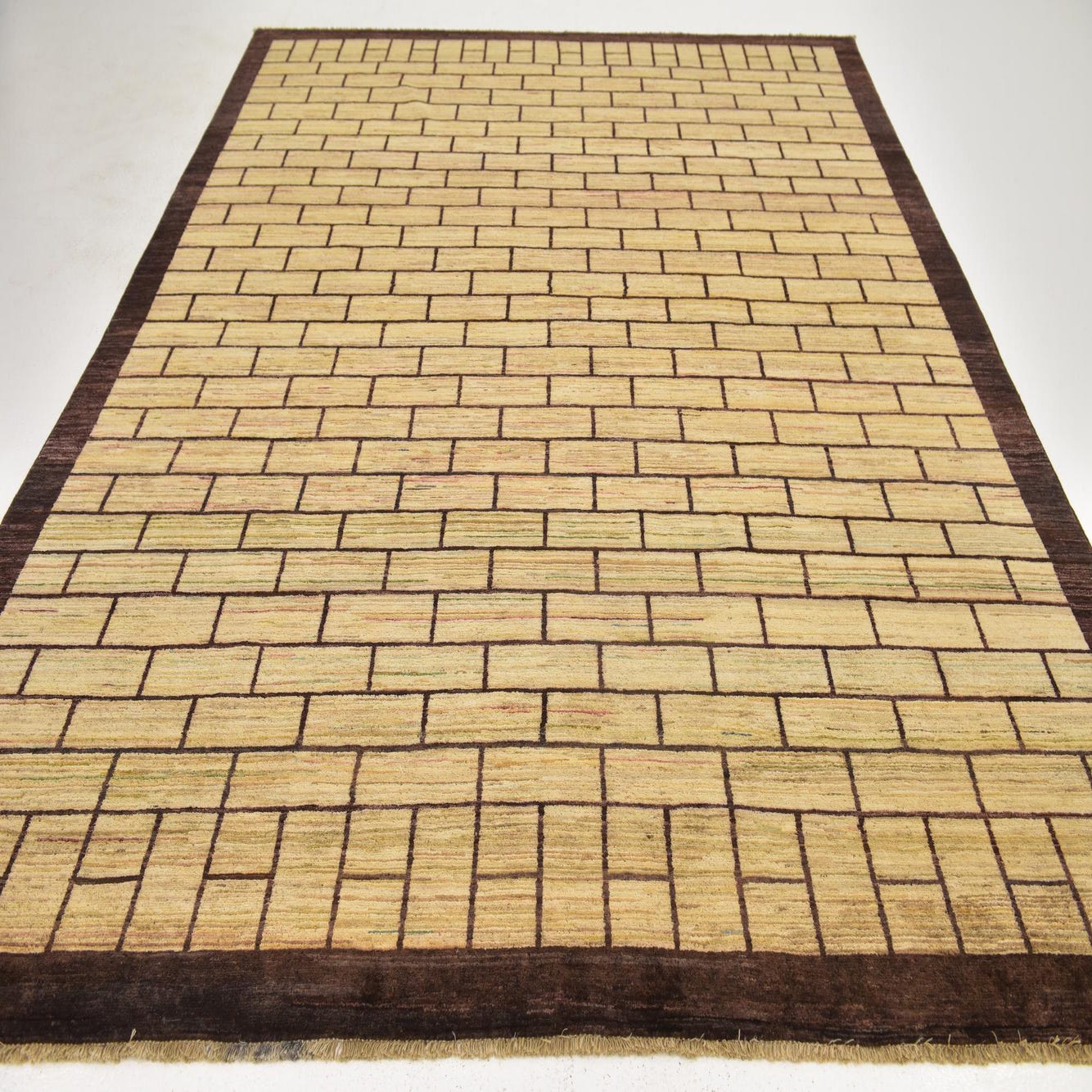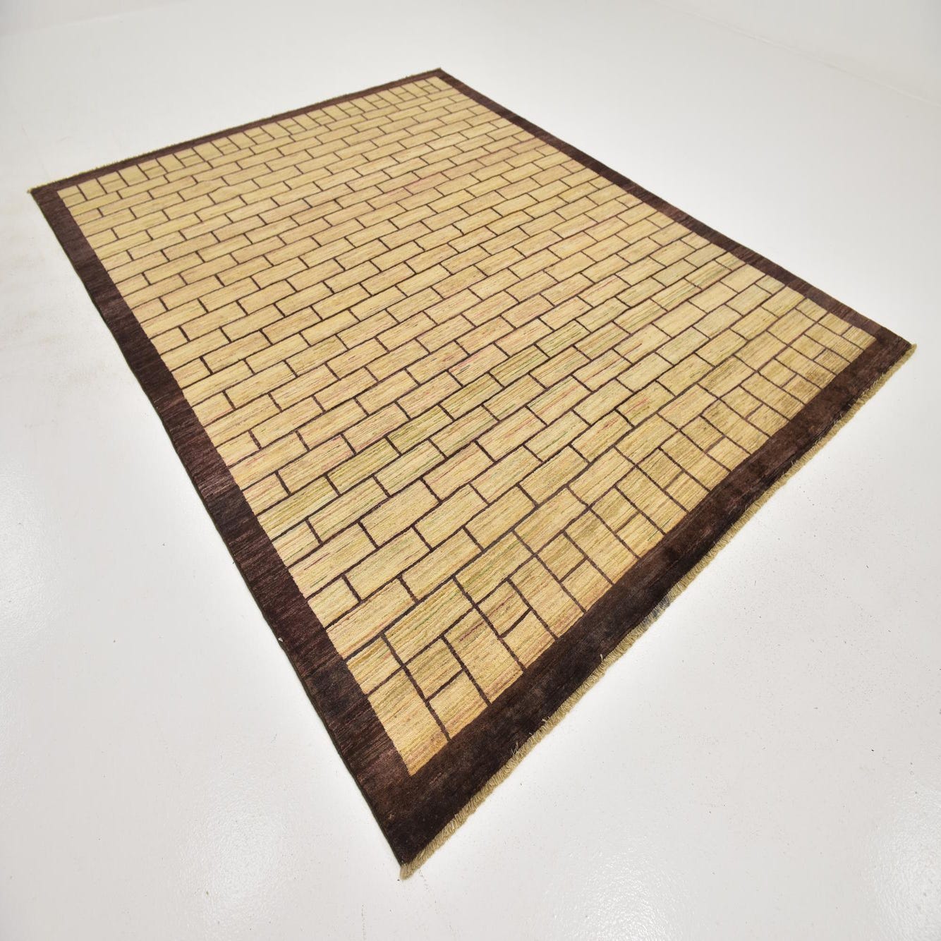 The Kashkuli Gabbeh area rug, measuring 8x10, boasts a hand-knotted construction of 100% wool, ensuring durability and a plush feel underfoot. It features an intriguing geometric pattern composed of rectangular shapes that mimic the look of a stacked brick wall. This pattern provides both visual interest and textural appeal, as the variation in pile heights adds depth to the design.