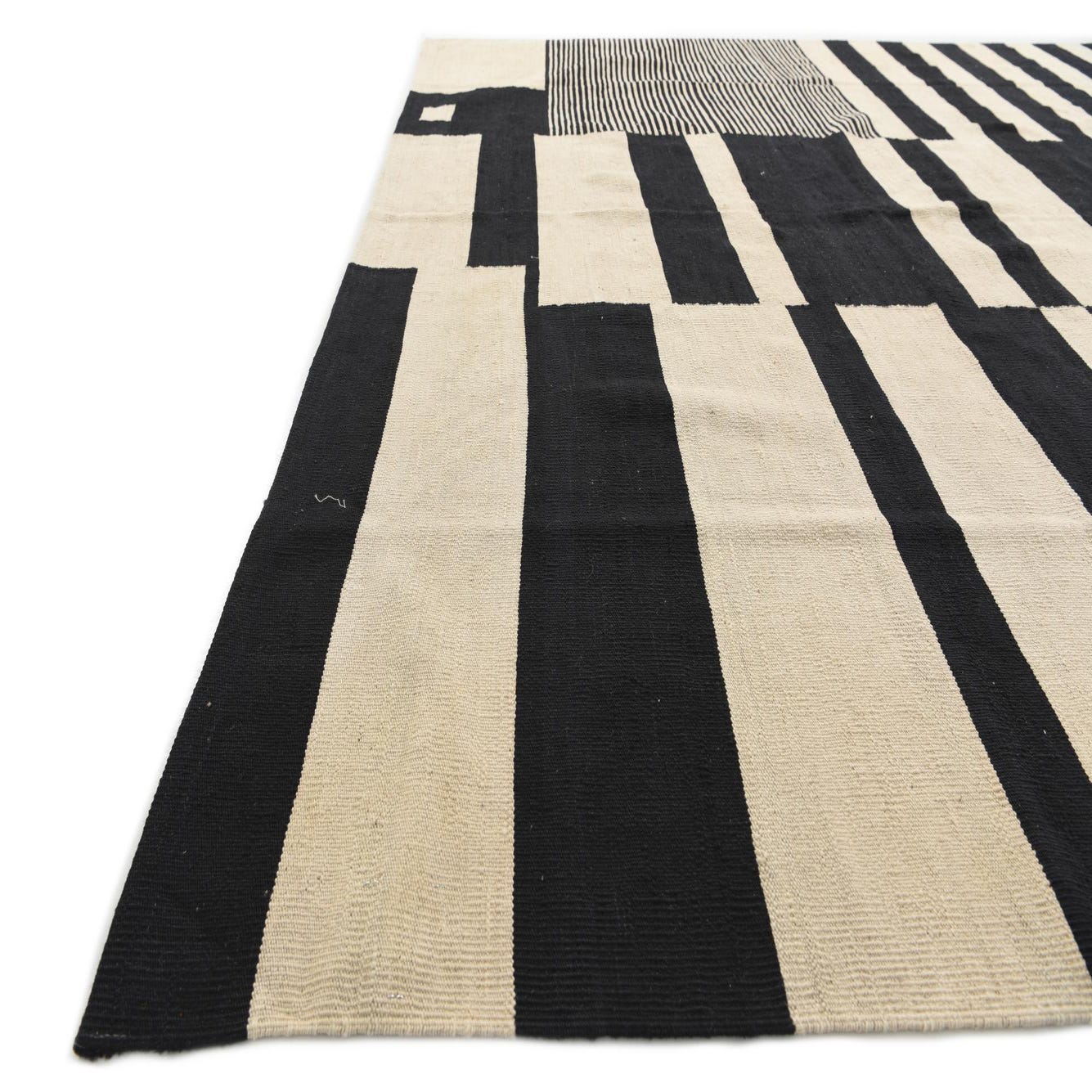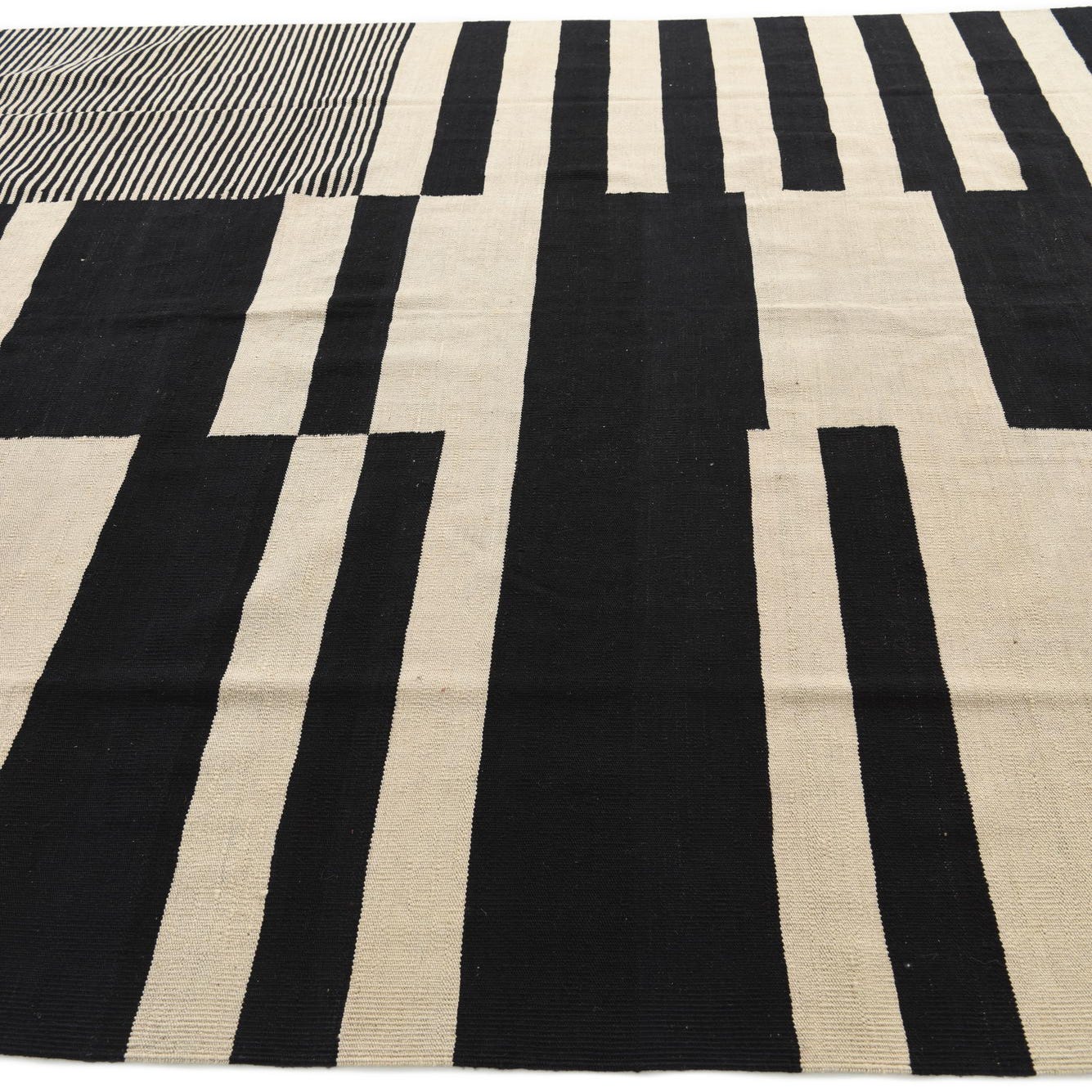 This Kilim Modern collection rug is hand-woven of 100% wool, offering durability and a substantial feel underfoot. The piece measures 8 feet by 10 feet and features a striking cream and black color palette. The cream background serves as a neutral canvas for the bold, geometric pattern that adorns this rug. Its array of black stripes and blocks forms a modern and abstract design that can anchor a room with its clean lines and stark contrasts.