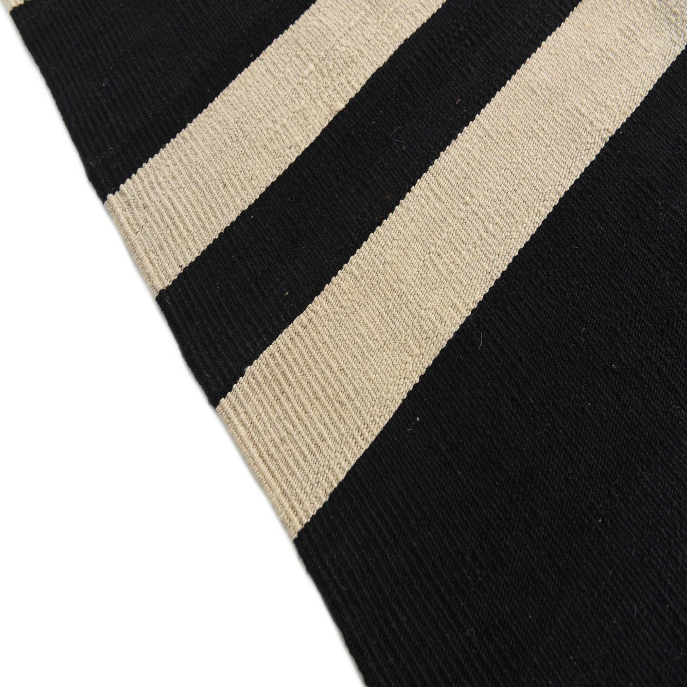 The texture of the rug is inviting and reflects the high-quality construction expected of hand-woven textiles. This rug's straightforward color scheme and contemporary design lend it versatility in various interior design settings. Ideal for a minimalist or modernist aesthetic, it could spectacularly offset sleek furniture and monochromatic color schemes. This rug would also work well in eclectic or industrial spaces, where its graphic nature can complement exposed materials like brick, concrete, or metal. For those looking to create a dynamic focal point in living, dining, or open-plan spaces, this eye-catching piece will confidently punctuate the area with style.