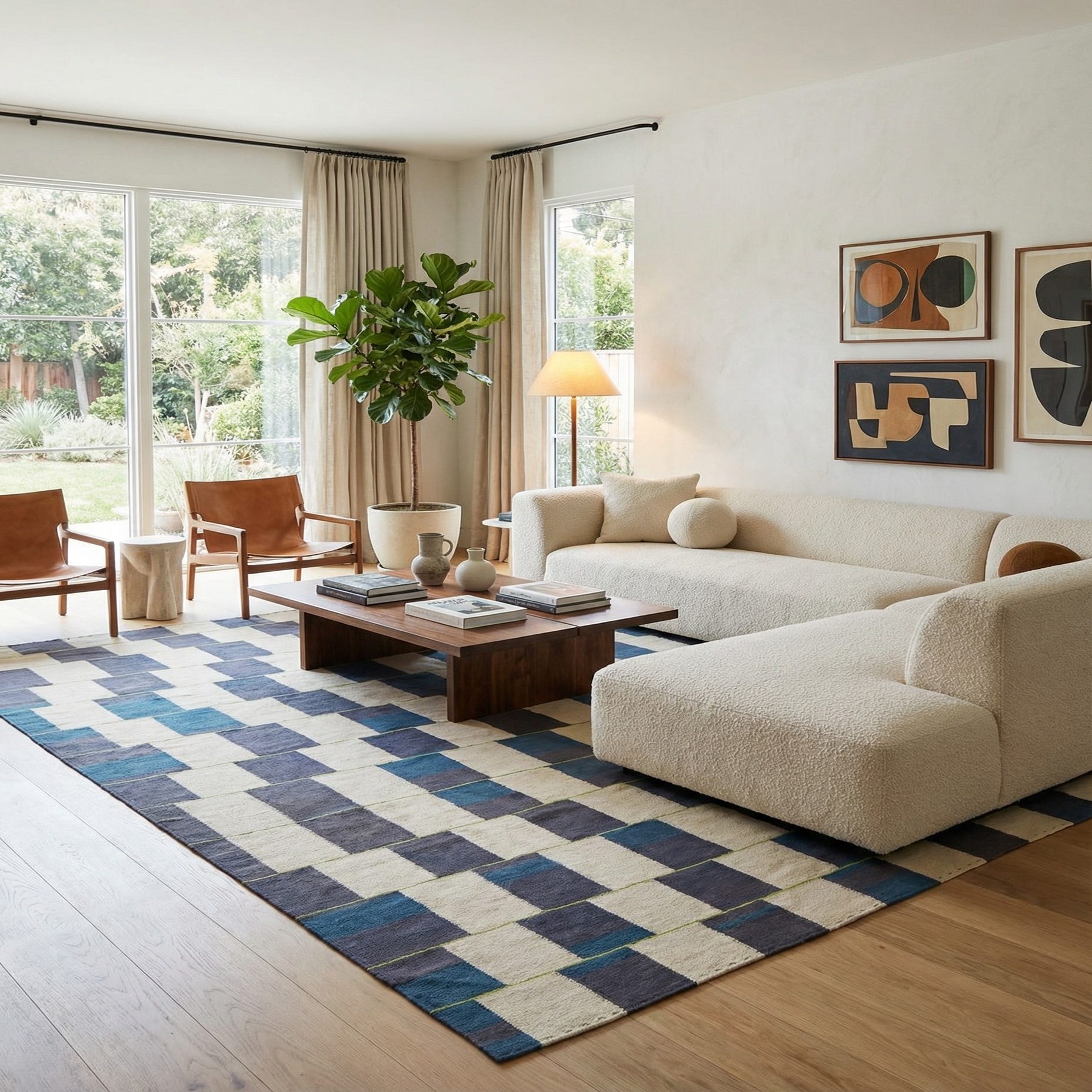 The rug's crisp geometric shapes give it a contemporary edge, making it a versatile piece for various decor themes. It could seamlessly integrate into a minimalist setting, complementing clean lines and a neutral color palette. Alternatively, this rug could also serve as a grounding element in a bohemian-styled space, where its earthy tones and texture would resonate with eclectic furnishings and natural materials. In a more traditional setting, the rug's classic pattern and subdued colors could add a touch of modernity without overwhelming the existing decor.