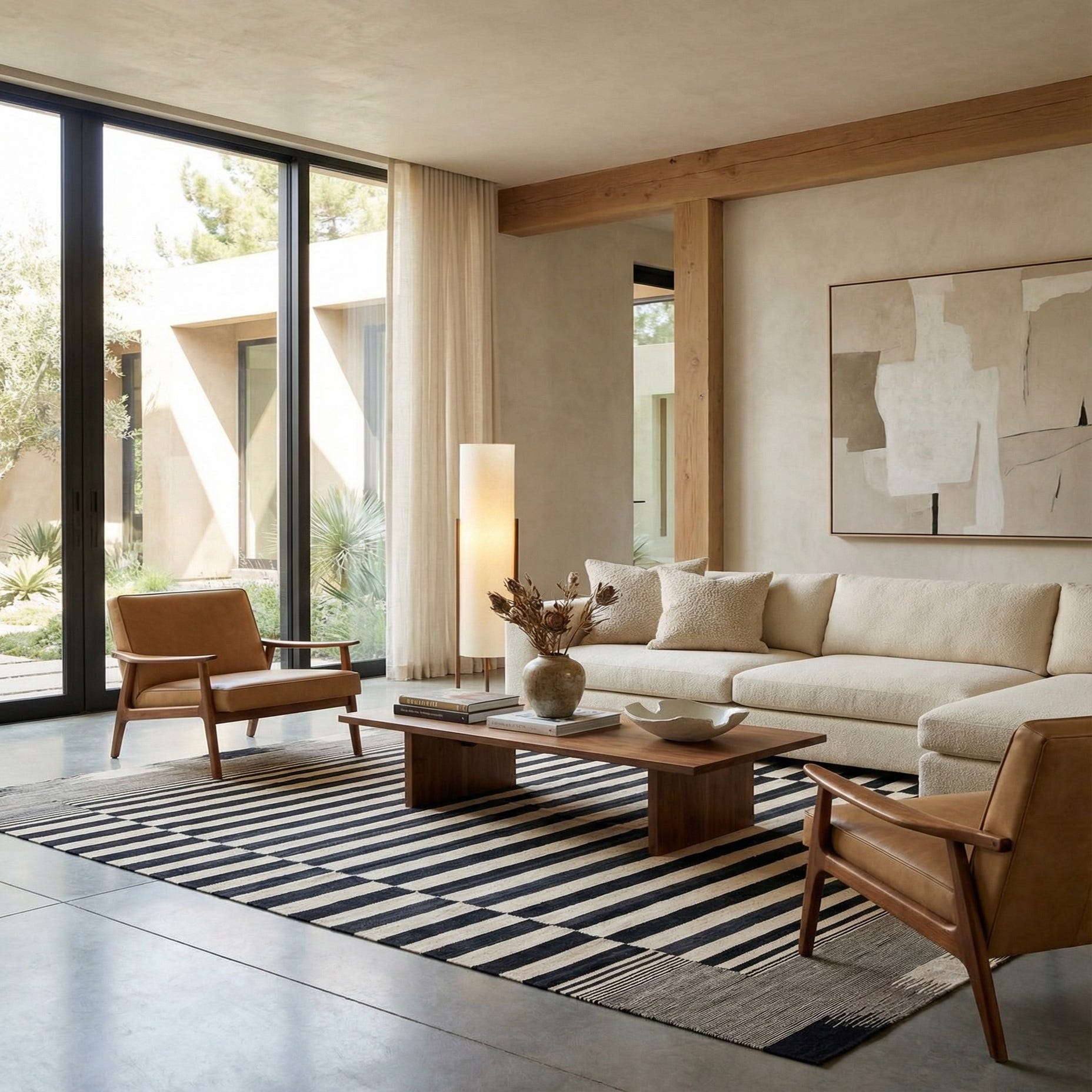 This rug works well in modern and minimalist interiors where graphic patterning is needed to anchor a seating area, and it pairs naturally with light woods, black metal accents, and leather furniture for a clean, layered look. Use it to define an open-plan living room, place it beneath a conversation grouping, or position it in a home office to introduce pattern without overwhelming the palette. It also complements monochrome or neutral bedrooms and looks intentional when layered over hardwood or sisal for added depth.