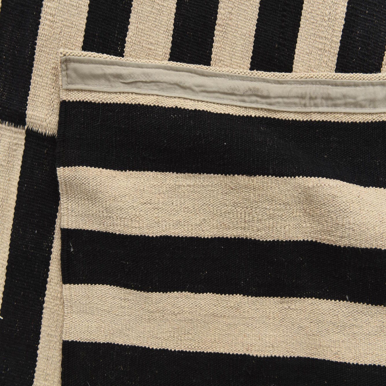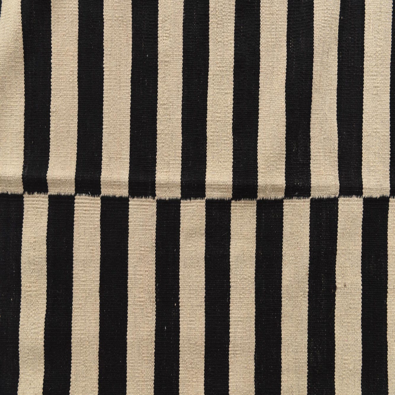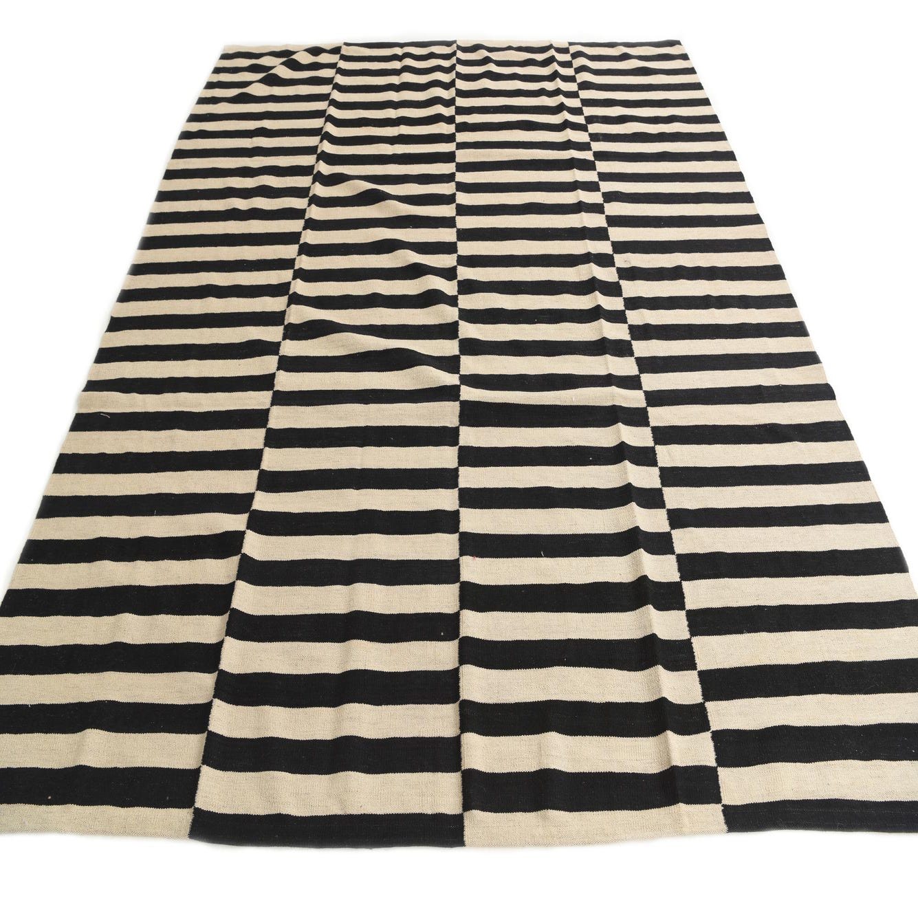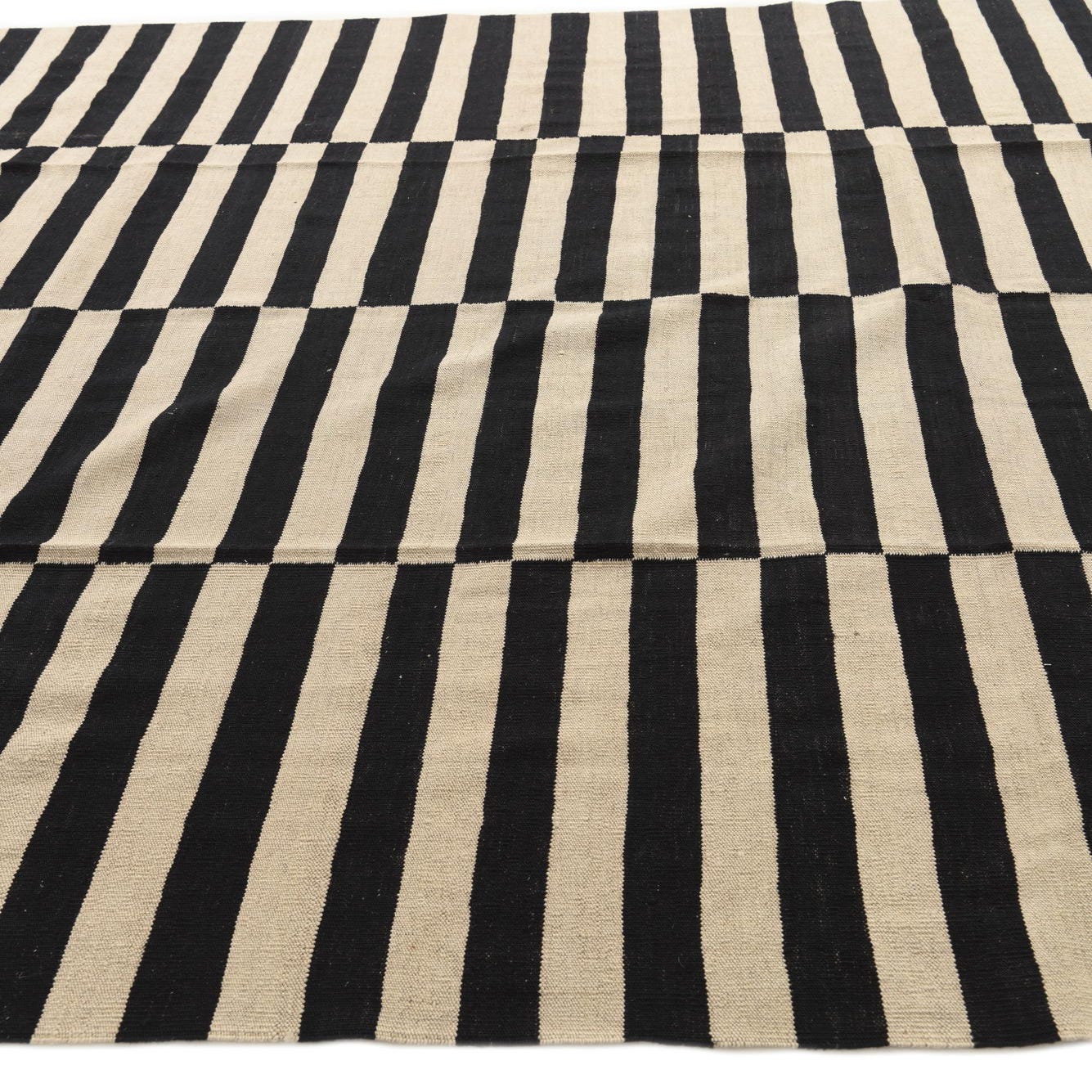 An 8x10 rectangular flatweave rug with a modern tribal pattern of alternating black and ivory horizontal stripes.