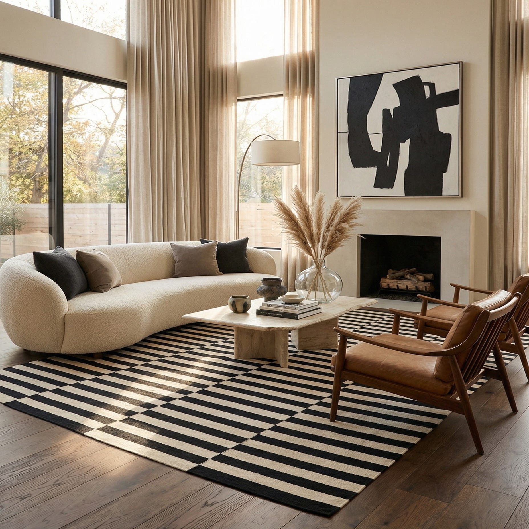 This rug's clean lines and minimalist color palette make it a versatile addition to various interior design styles, including modern, Scandinavian, and coastal-inspired spaces. It could serve as a statement piece in a monochromatic setting or complement a room with bold colors and patterns. The simplicity of the design allows it to anchor furniture groupings without overpowering the space, making it suitable for both living and dining areas.