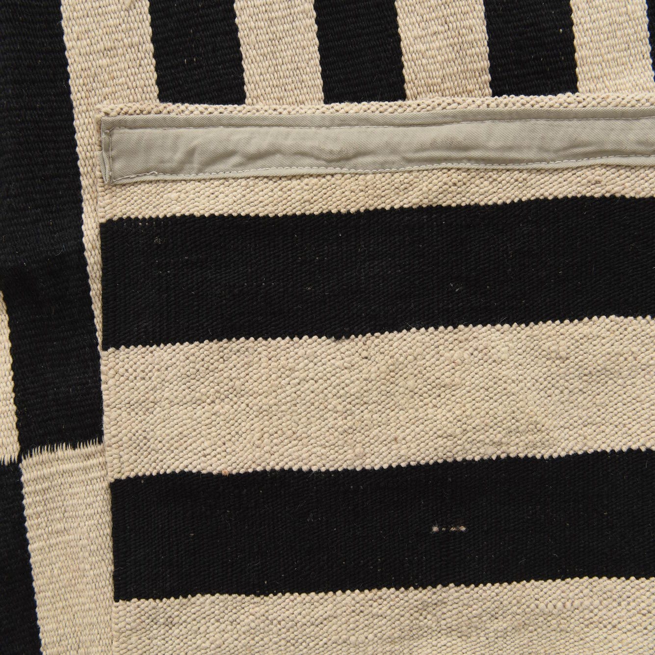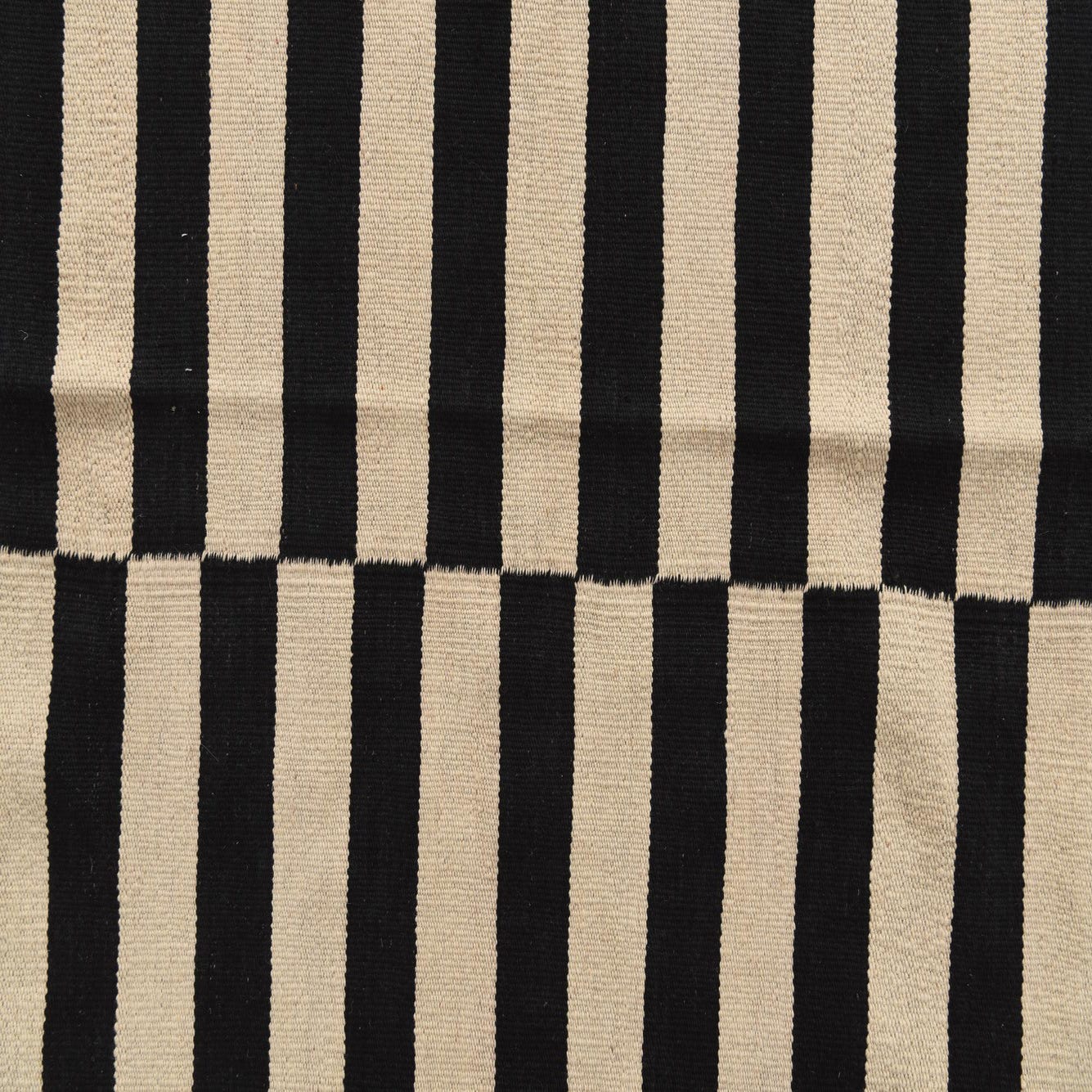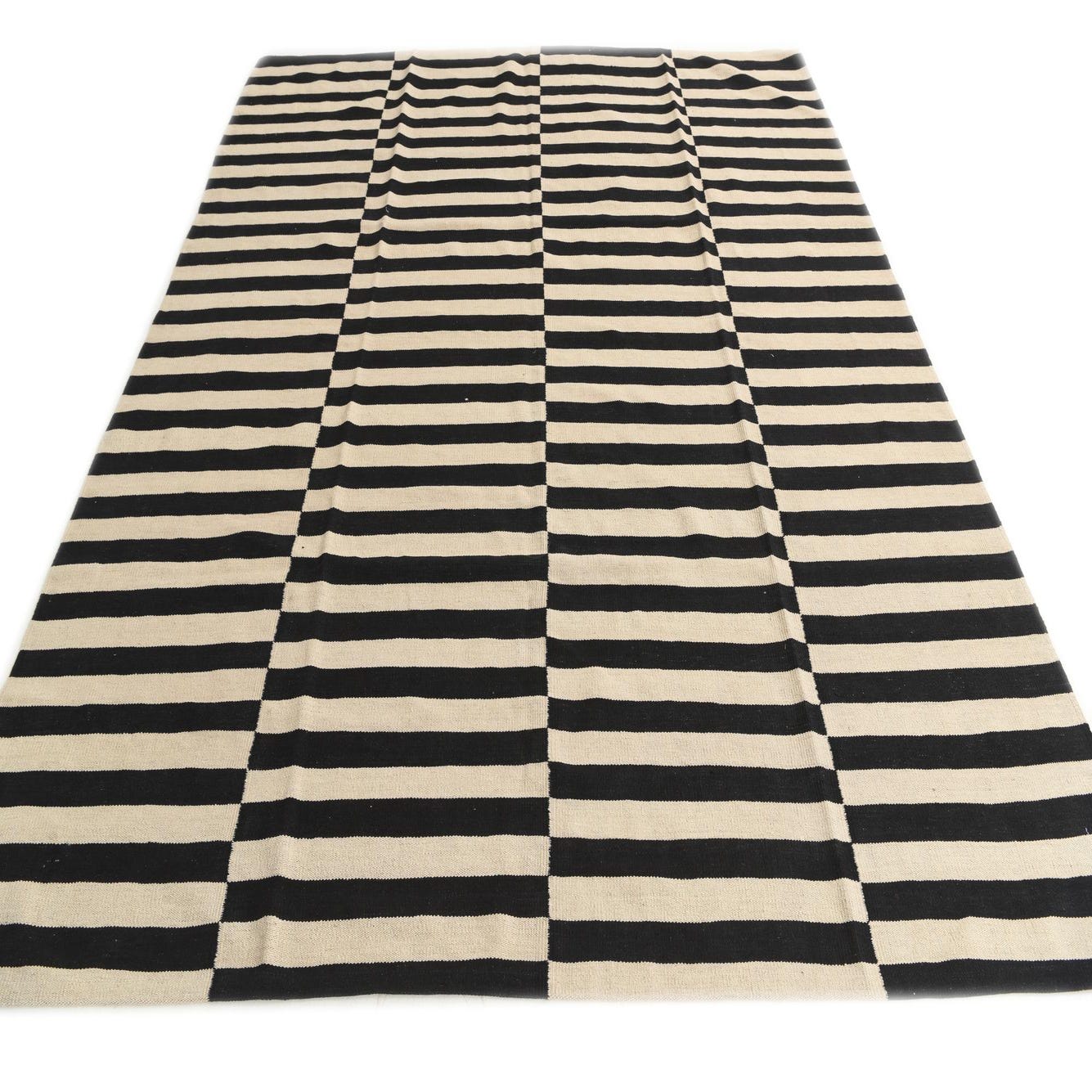An 8x10 rectangular flatweave rug featuring a bold black and ivory striped pattern with alternating horizontal and vertical sections.