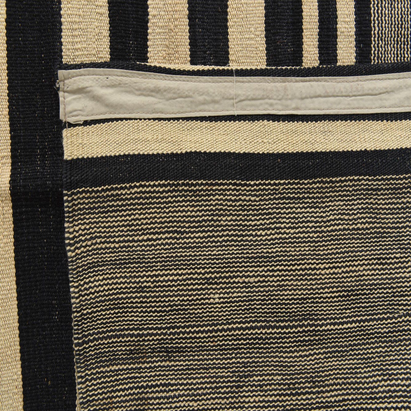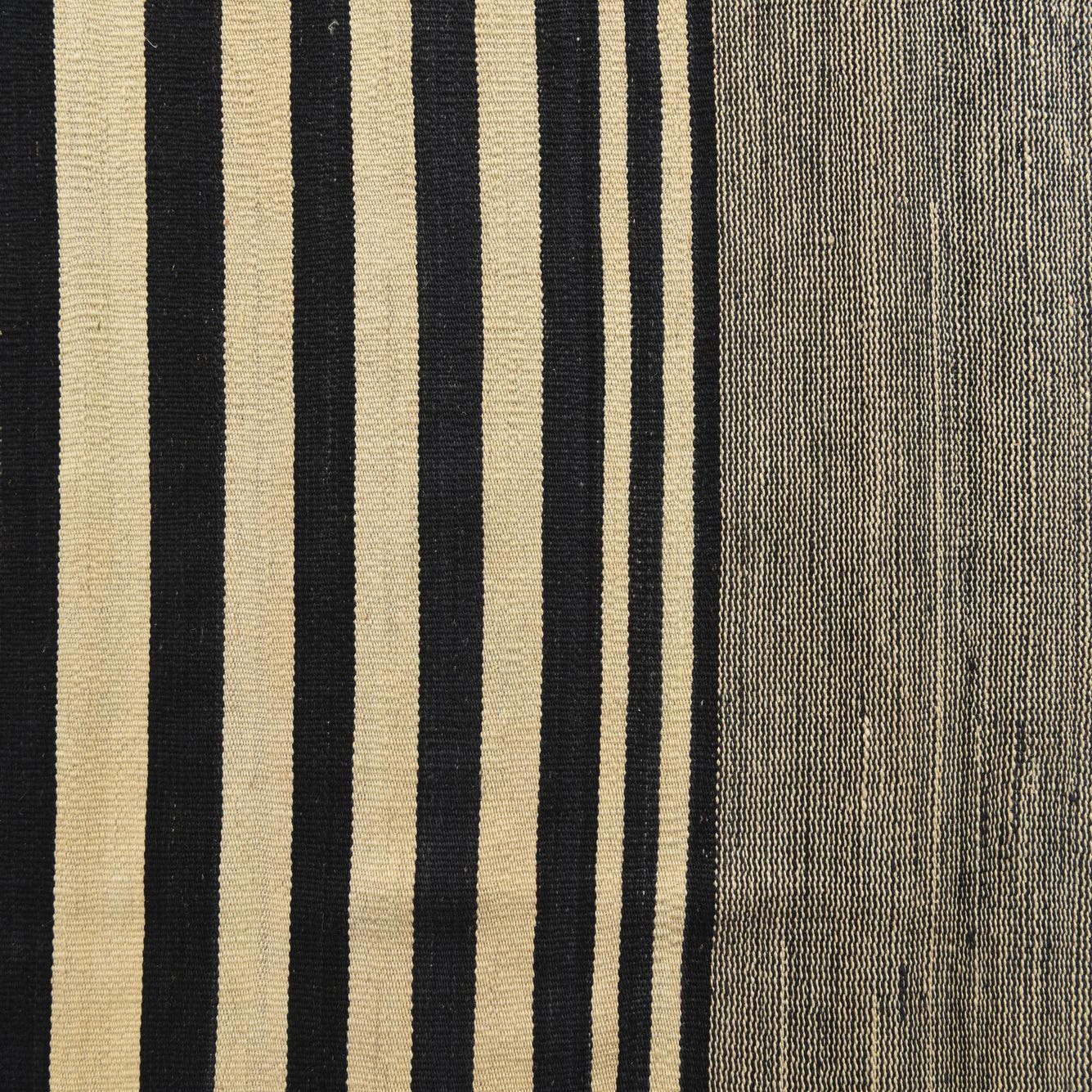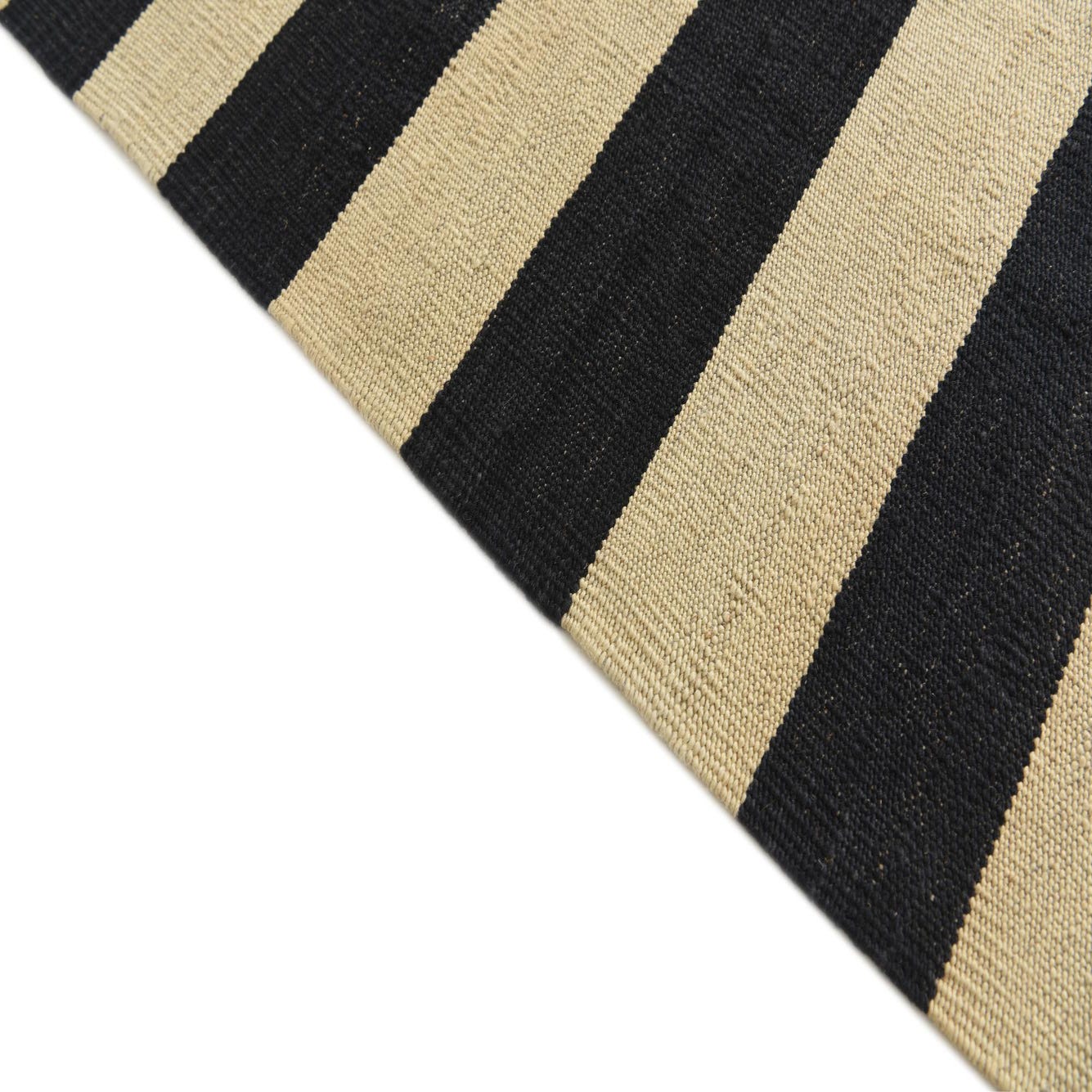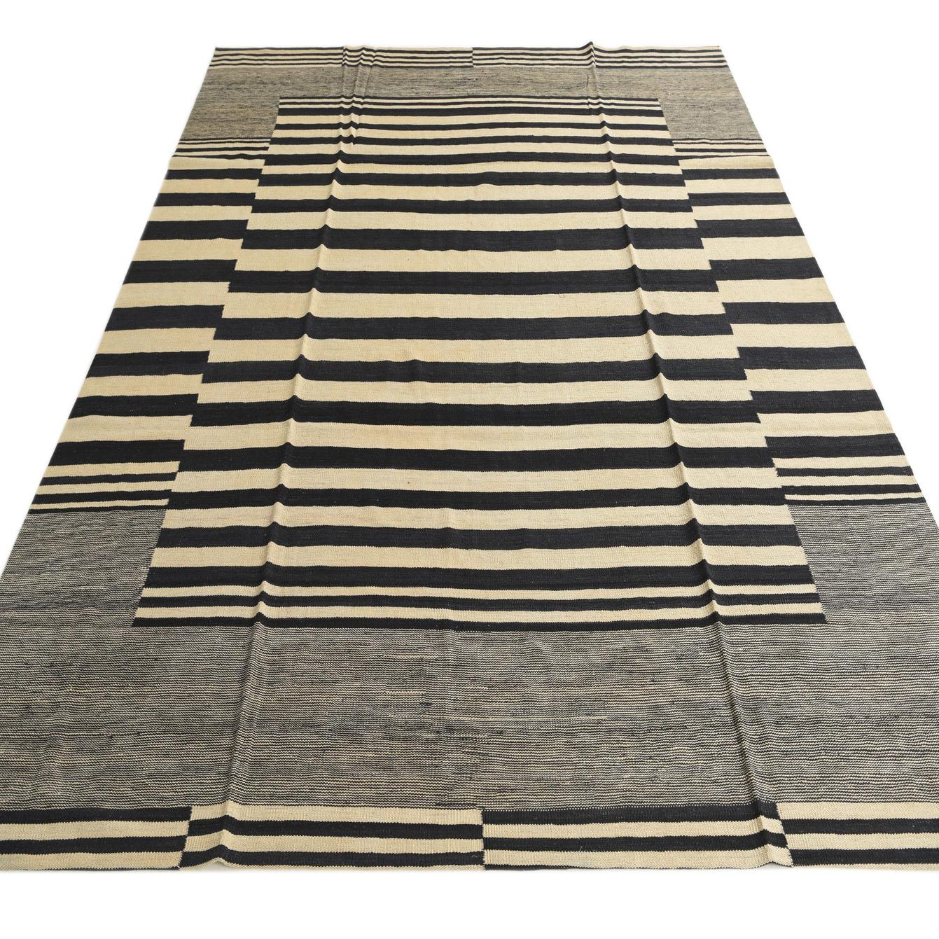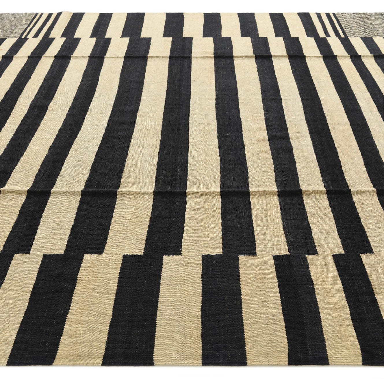 An 8x10 rectangular flatweave rug featuring a bold black and ivory striped pattern with a solid black border.