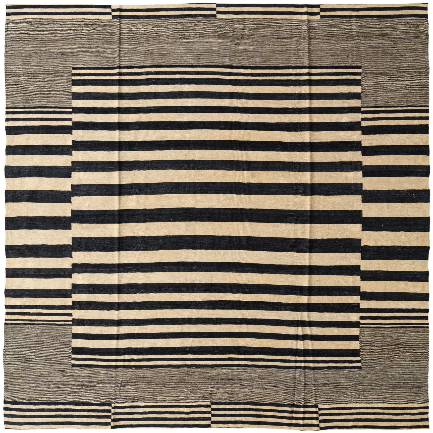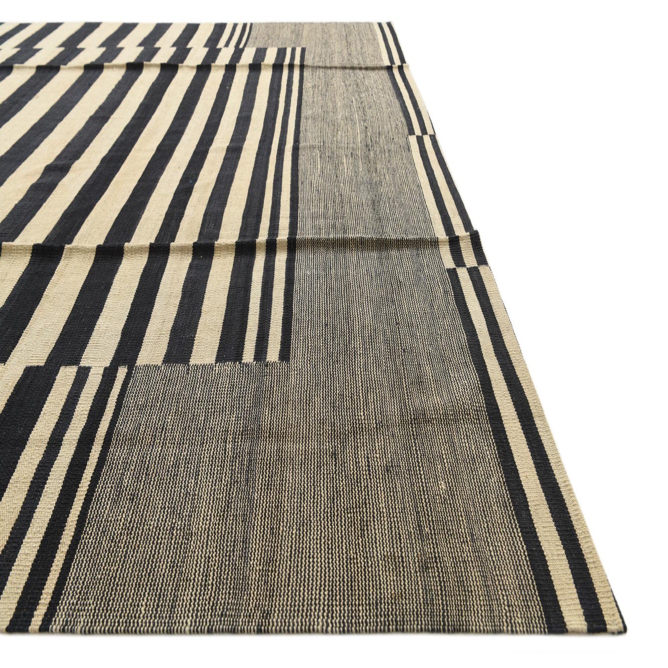 The Kilim Modern 8x10 rug is a handwoven piece that embodies a contemporary take on a traditional geometric pattern. This rug features a cream background contrasted with bold, black horizontal stripes, giving it a striking visual presence. The clean lines and sharp contrasts present in the design make this rug an ideal statement piece for modern and minimalist interiors.