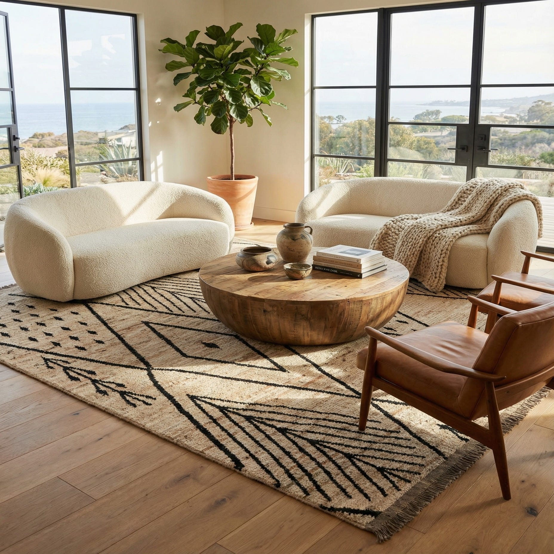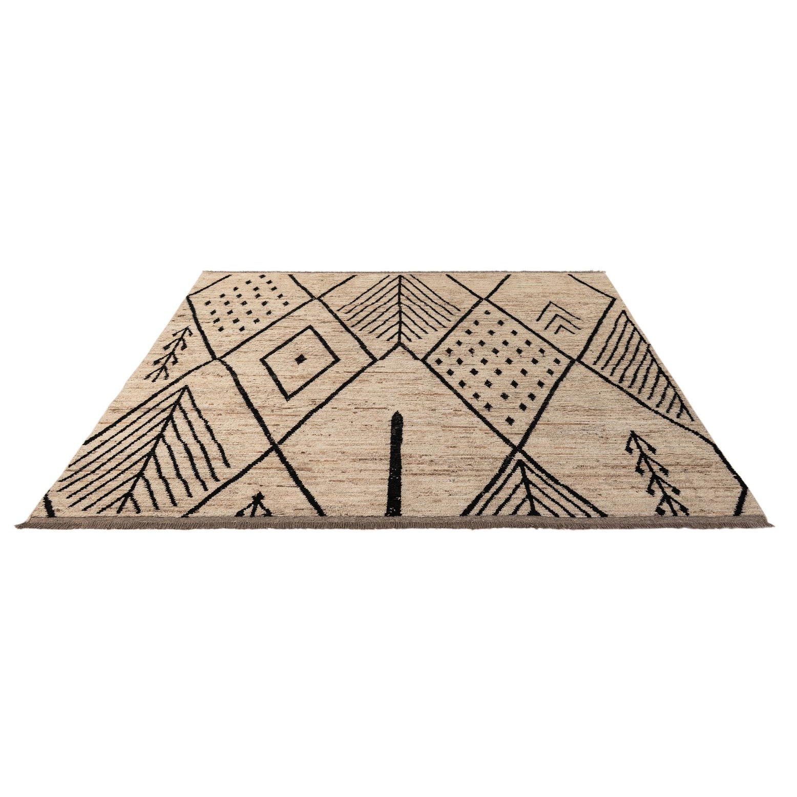 An 8x10 rectangular ivory wool rug with a modern tribal pattern of black diamonds and abstract tree-like motifs.