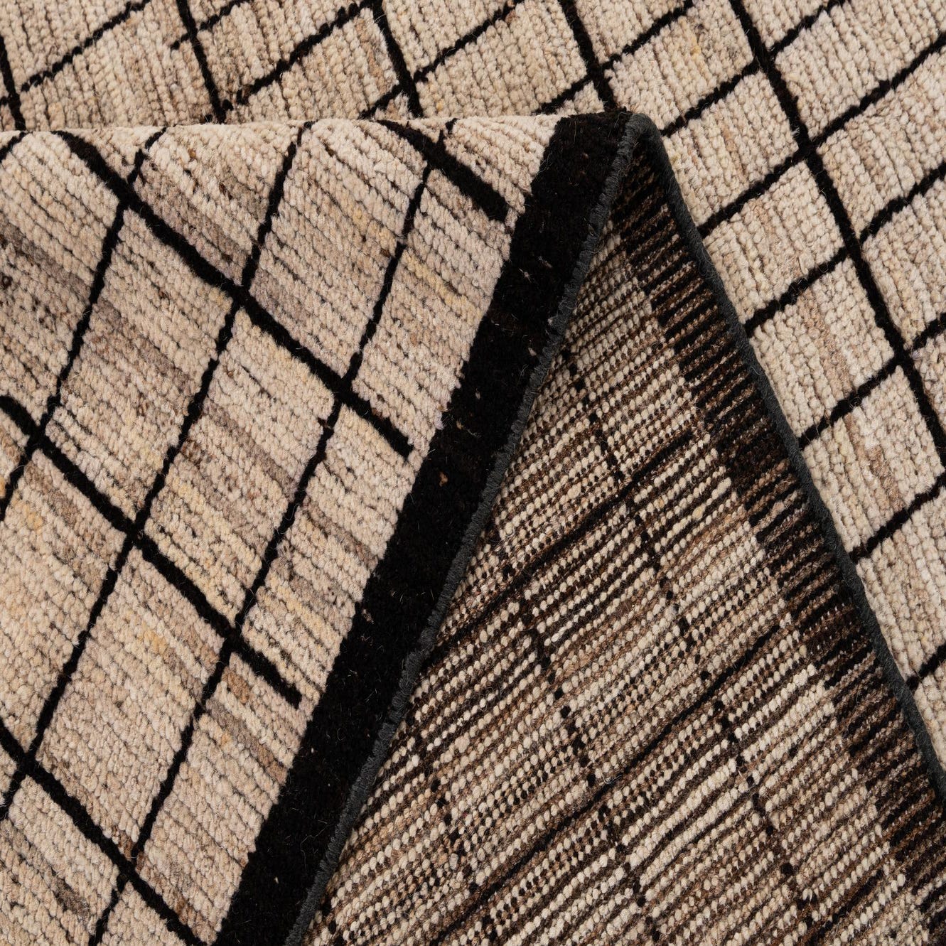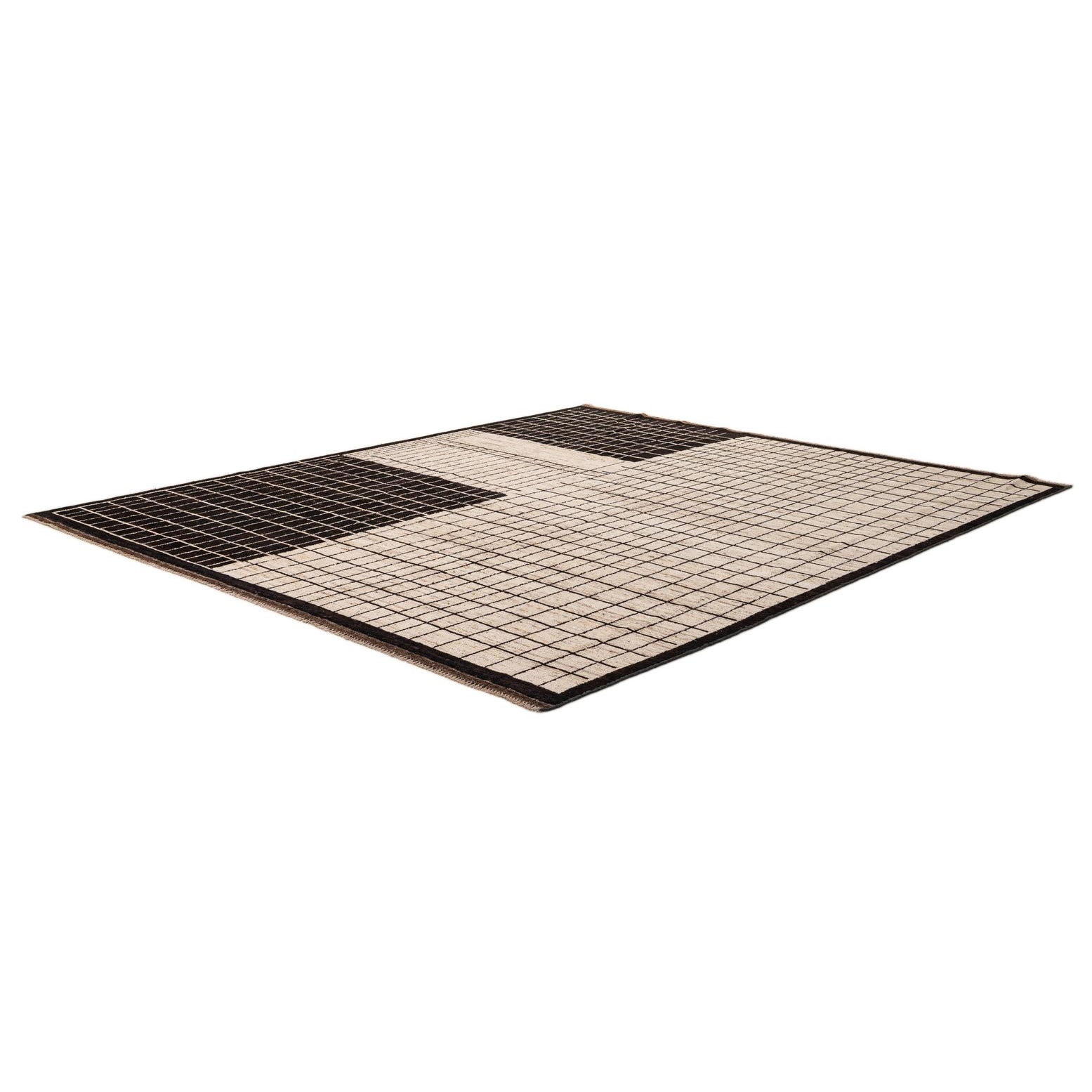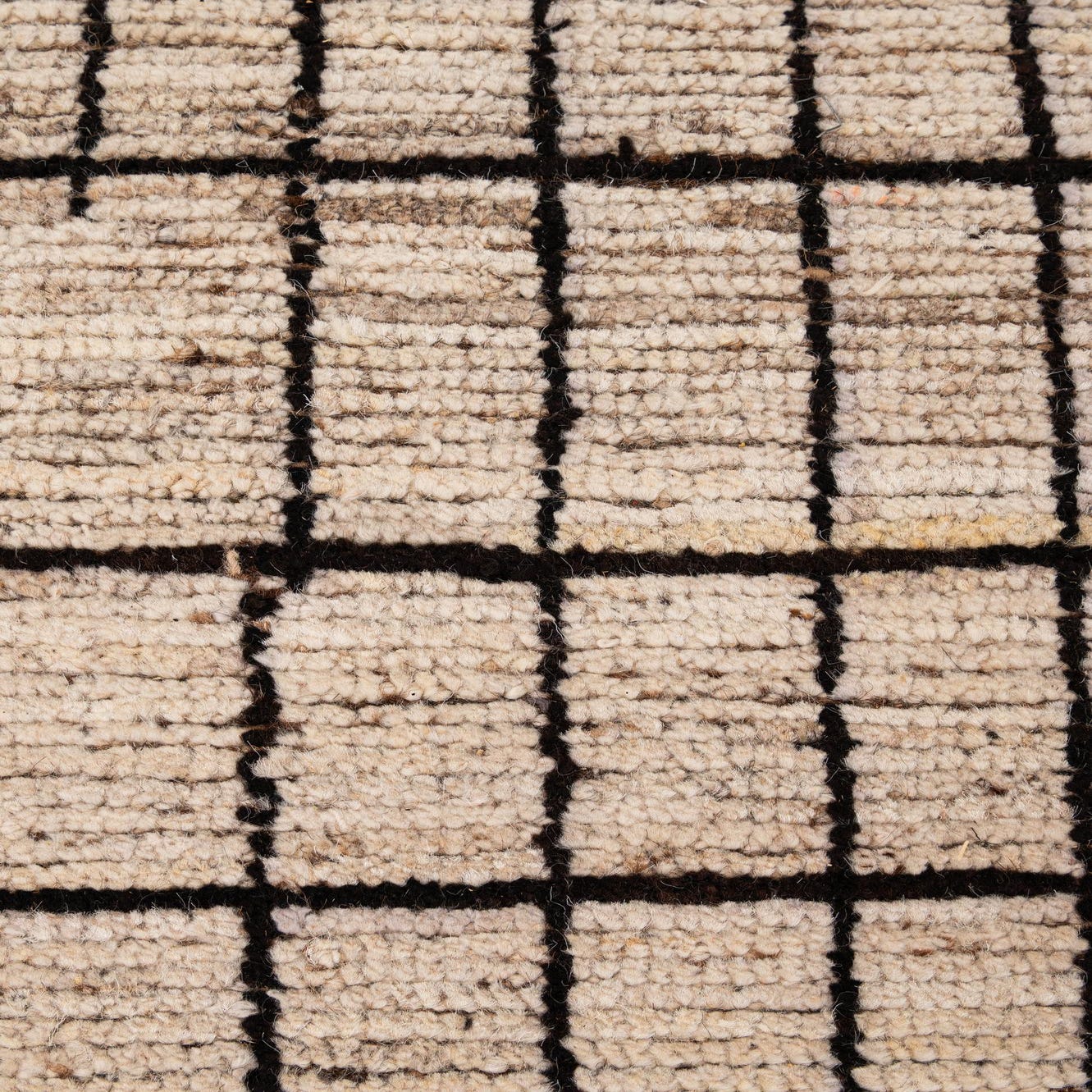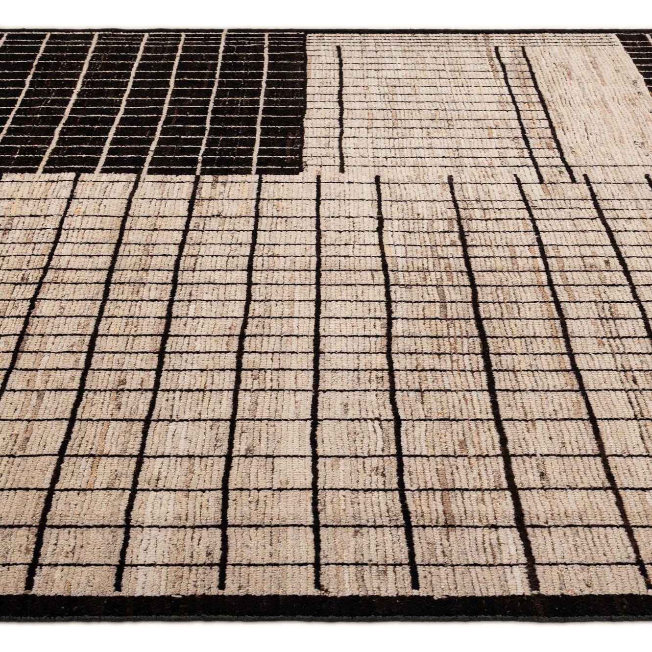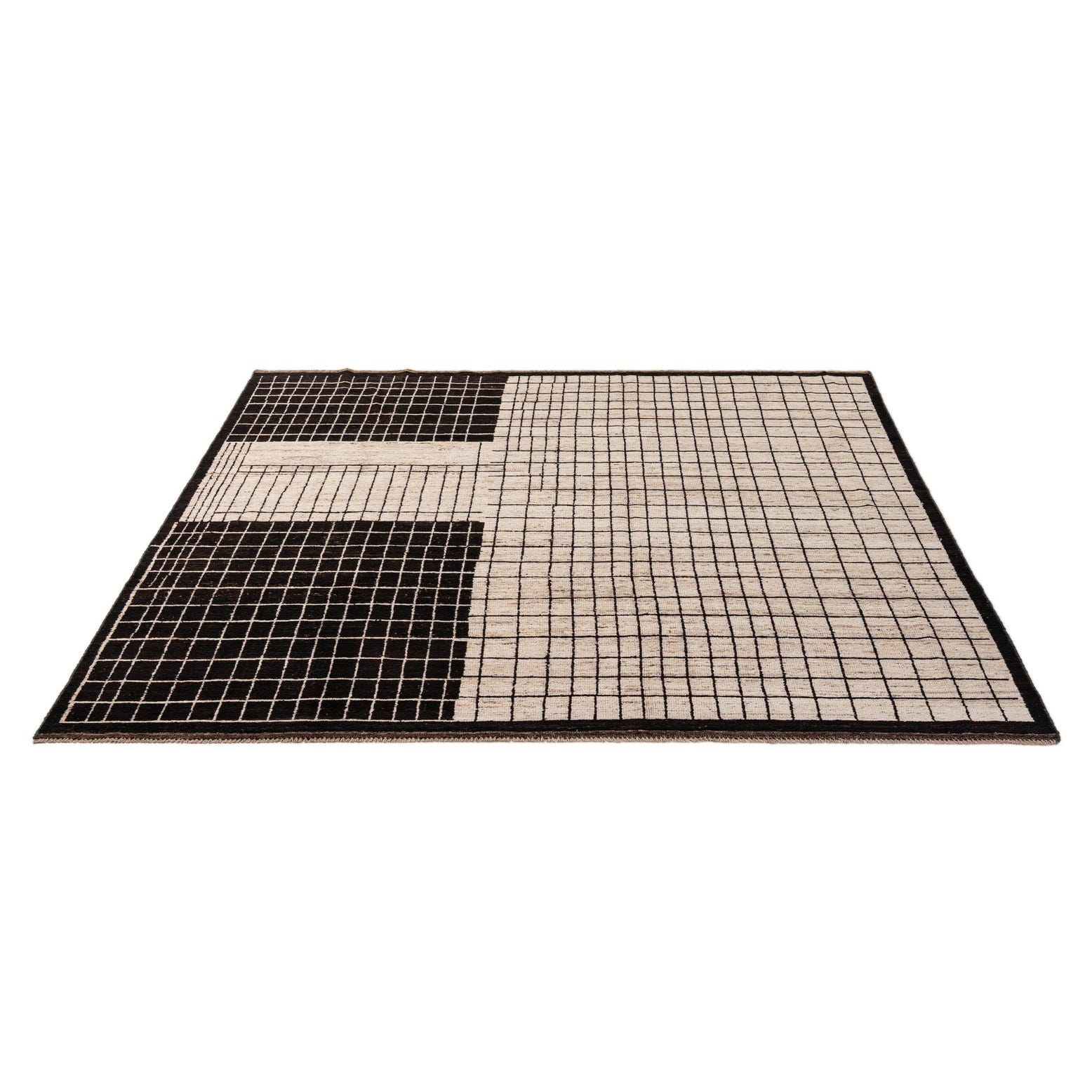 An 8x10 rectangular ivory and black wool rug with a modern tribal grid pattern, featuring large black squares with white grids and ivory sections with black grids.