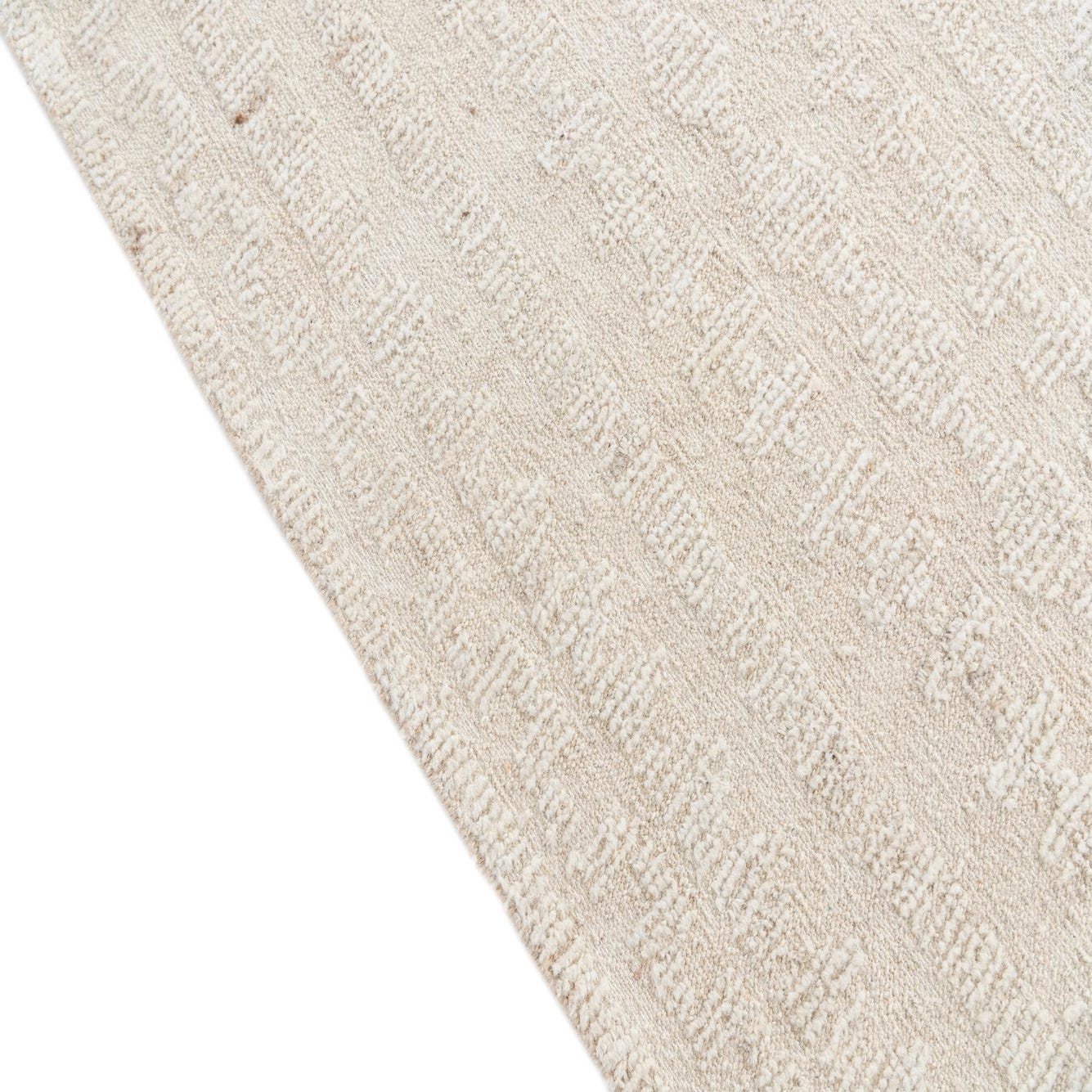 This rug shows a textured pattern that adds a layer of tactile interest without overwhelming the design. The piece is finished with a fringe edge, adding a traditional touch to its contemporary appeal. Its neutral palette contributes to its versatility, making it an excellent choice for various interior design scenarios.