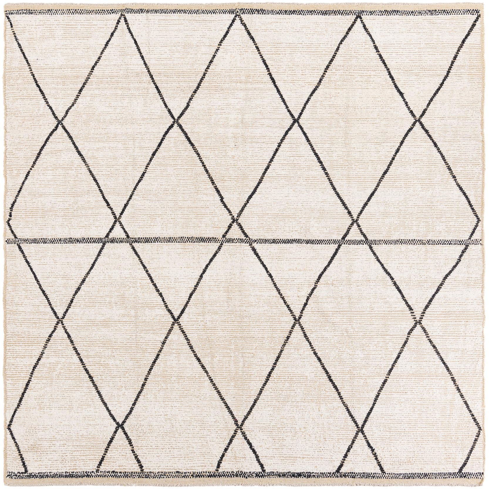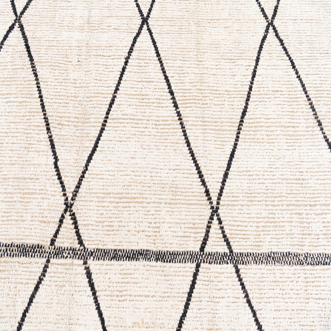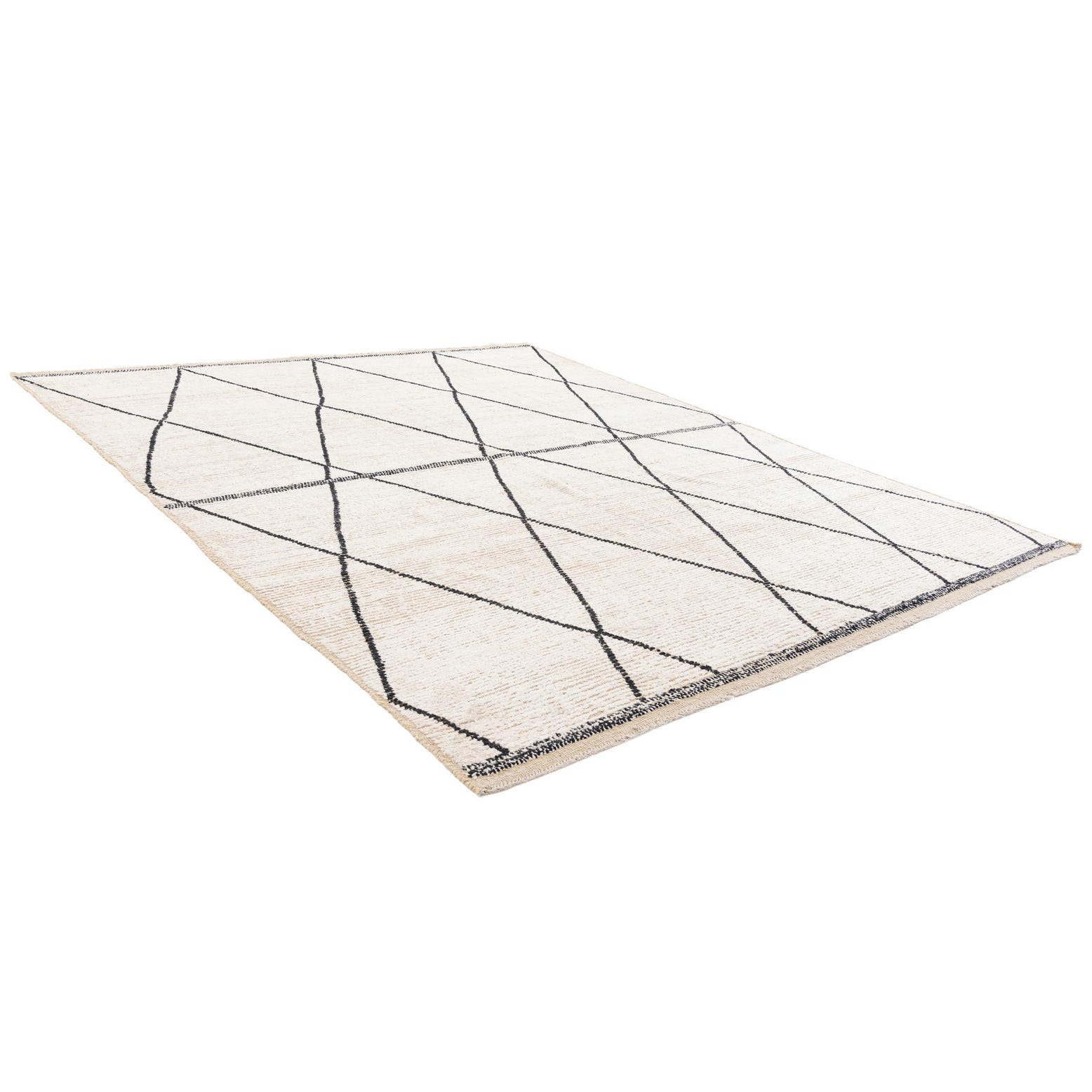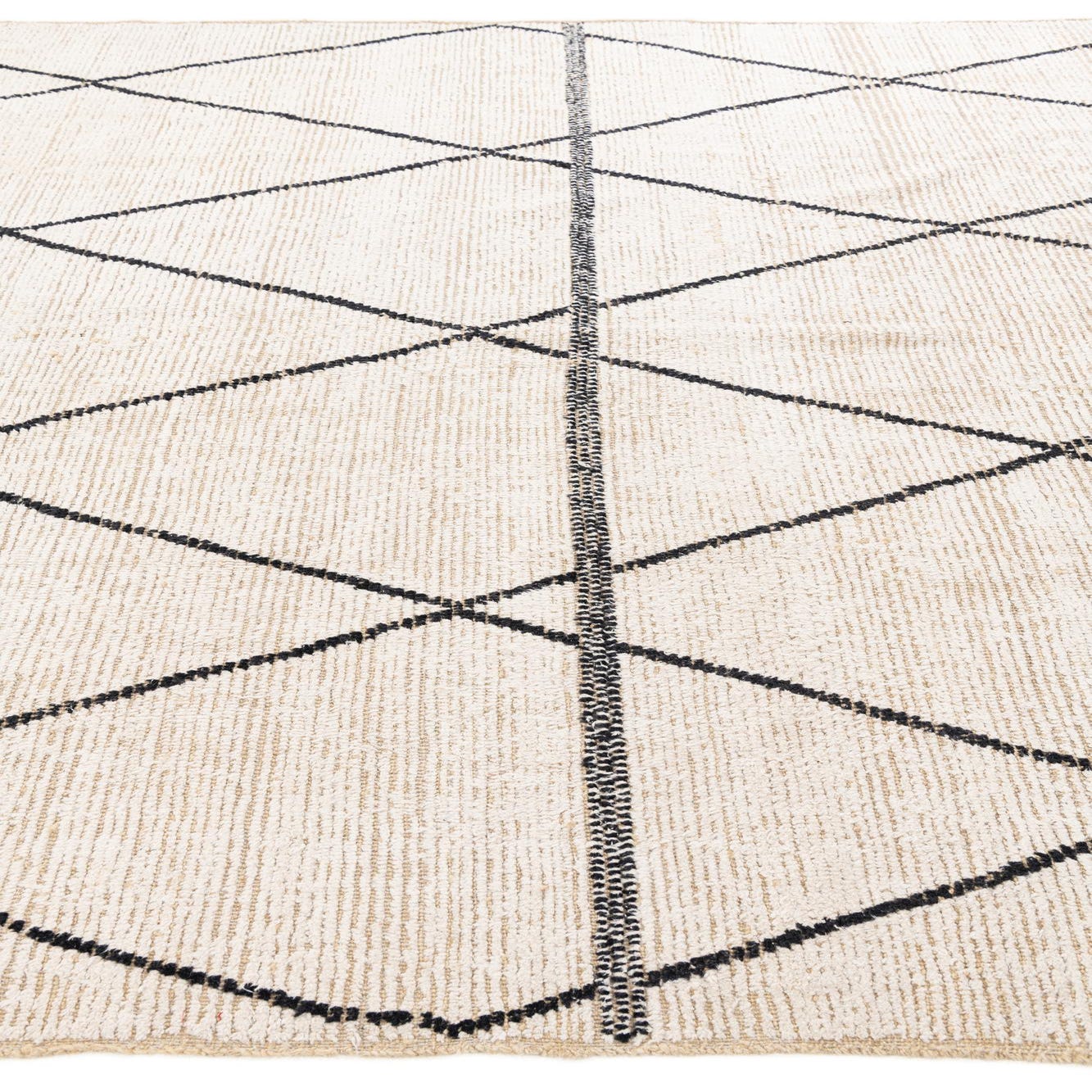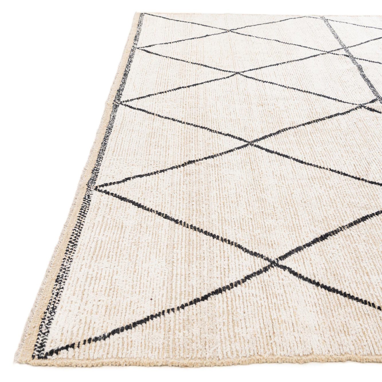 A clean, geometric lattice runs across a cream field, the black lines forming elongated diamonds that give the rug a modern yet timeless look. Beige accents and a natural-woven edge add a warm, organic touch to the neutral palette. Hand-knotted from 100% wool, the surface has a low-profile pile with subtle ridged texture; when you run a hand over it you can feel the density of the knotting and the soft, natural wool underfoot.