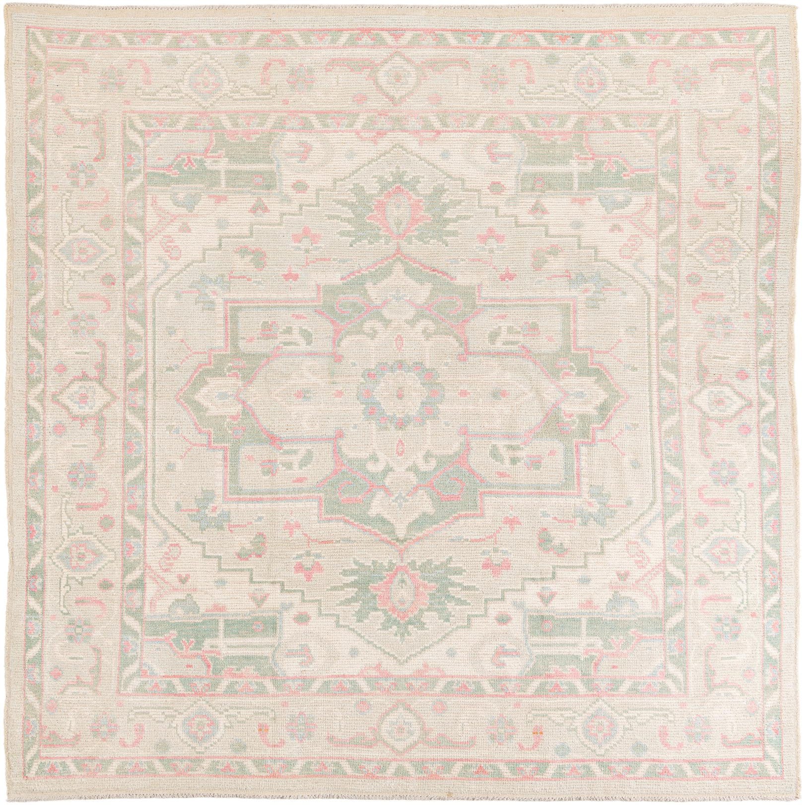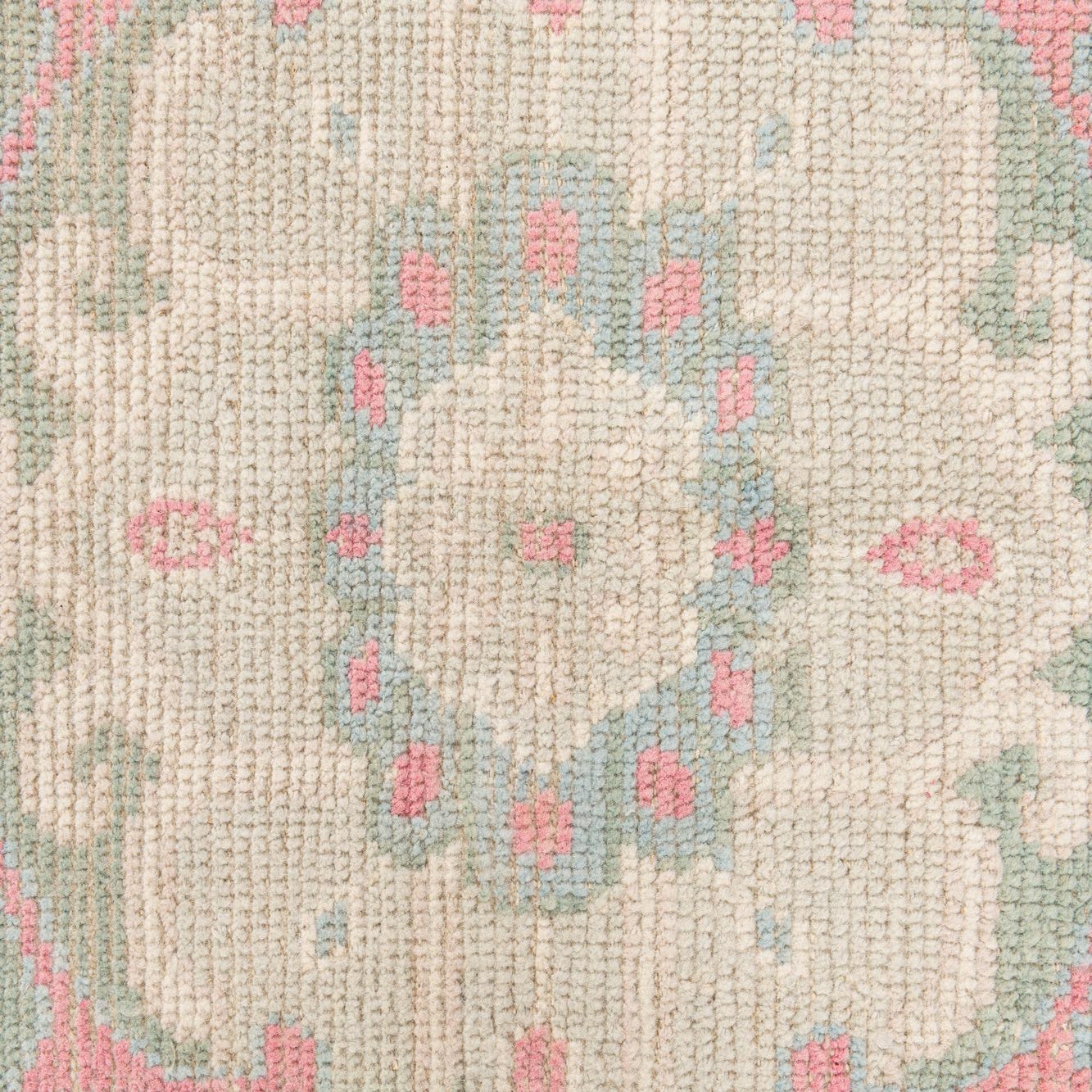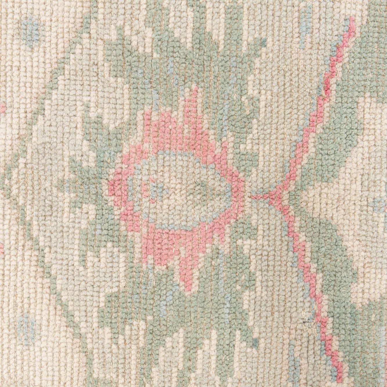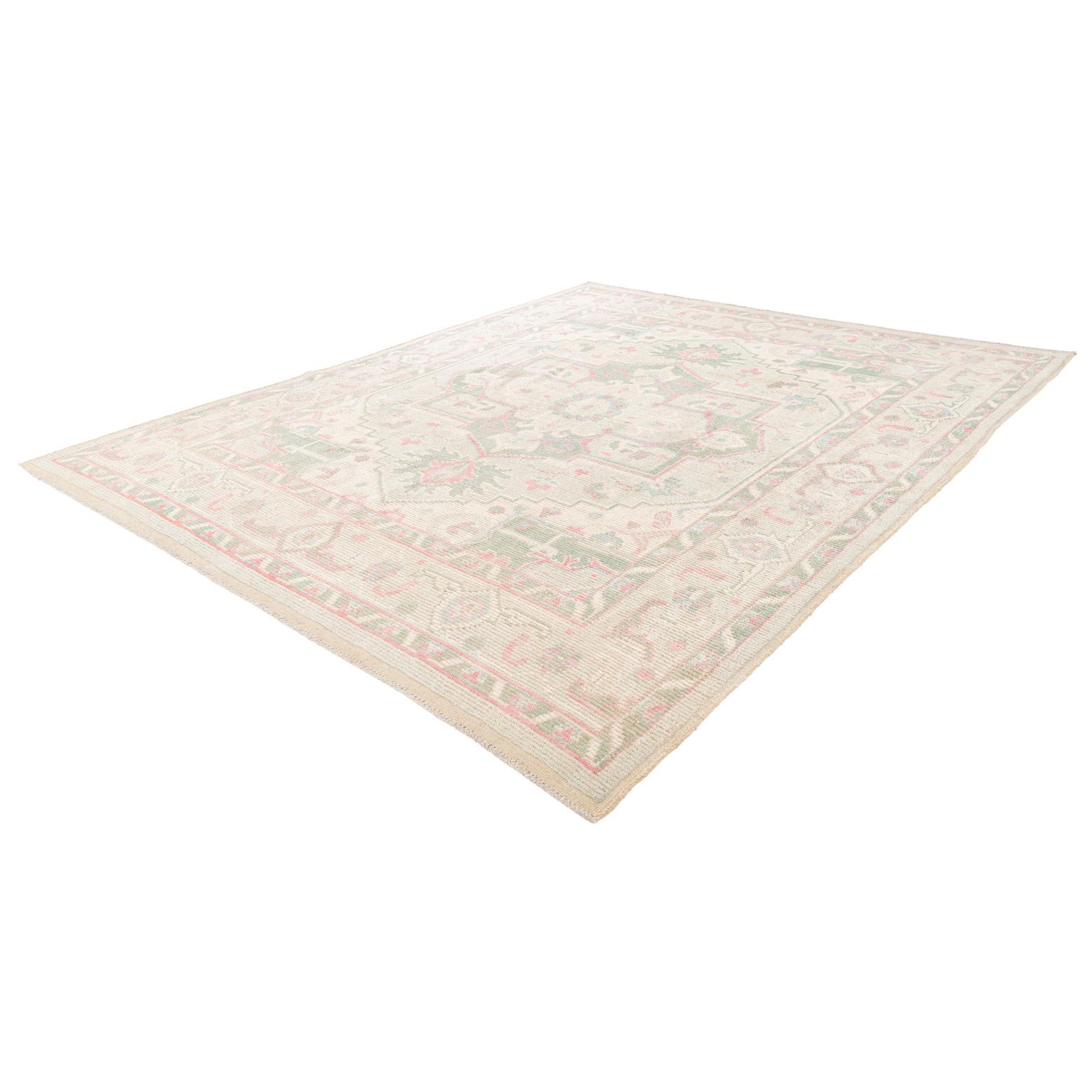 8x10 rectangular ivory wool rug with a modern Oushak pattern in cream, light pink, and sage green.