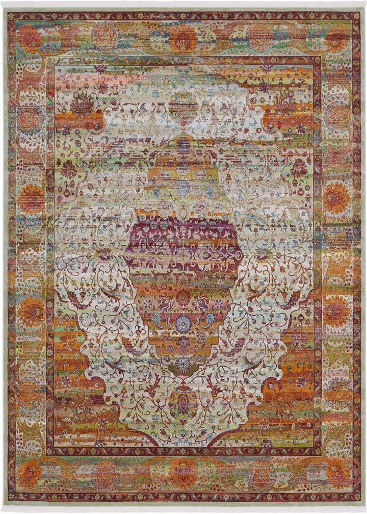 The Santiago Collection rug presents a captivating amalgamation of colors and traditional patterns, with a size of 8x10 that fits well in generous living spaces. This machine-woven piece is crafted from 100% polypropylene, offering both durability and an accessible touch of elegance. A cream background lays the foundation for a diverse palette, including touches of beige, varying shades of green and olive, alongside warm orange, rich red, and subtle pink accents.
