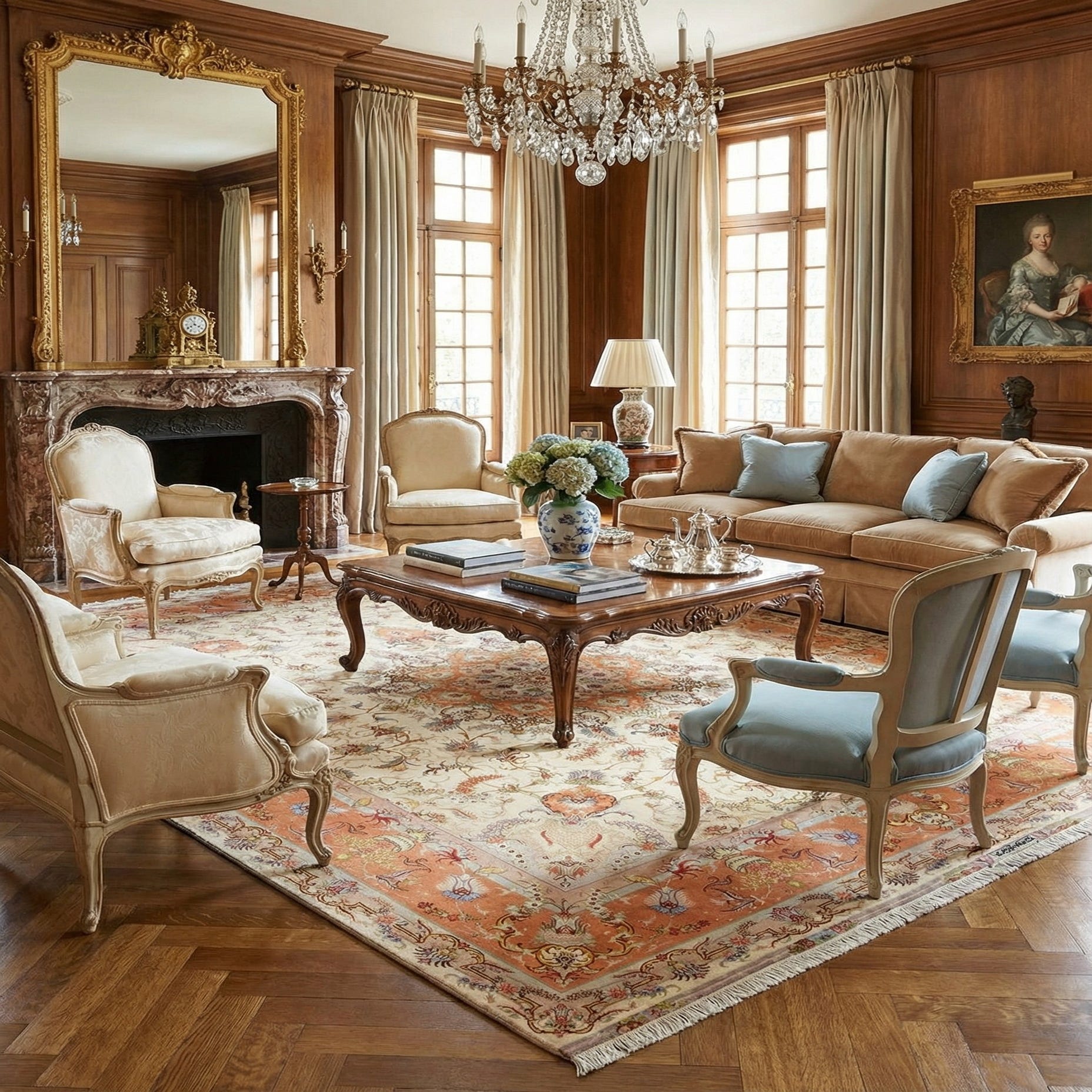 The textural depth of the rug is enhanced by the blend of wool and silk fibers, offering both durability and a subtle sheen that catches the light and accentuates the detailed patterns.