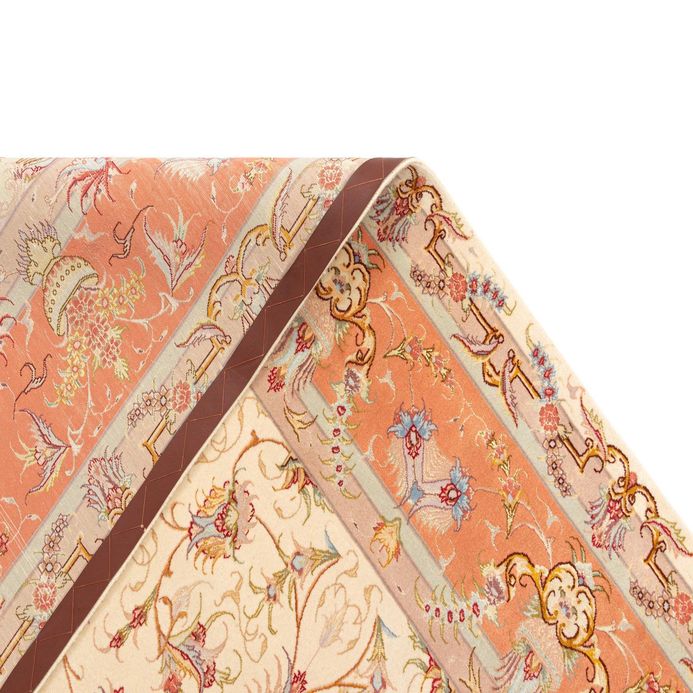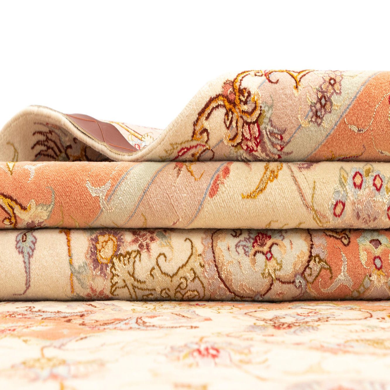 The Tabriz collection offers a handcrafted 8x10 rug composed of both wool and silk, providing a tactile experience that speaks to both comfort and luxury. The rug showcases a harmonious cream background, accented by a rich palette of colors including orange, purple, brown, red, violet, and blue. This intricate pattern is characterized by a central medallion surrounded by symmetrical floral designs and an ornate border, embodying the traditional craftsmanship of Tabriz designs.