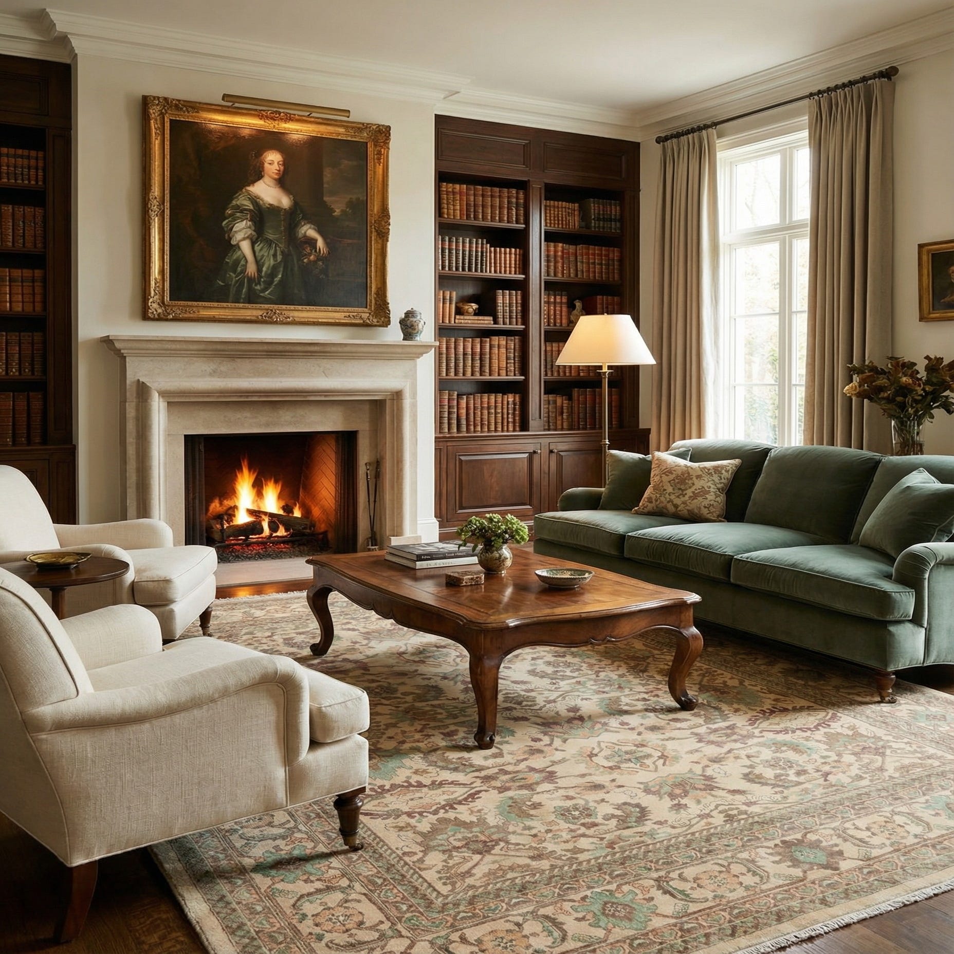 An 8x10 rectangular ivory Tabriz rug with a detailed oriental floral pattern in muted greens, browns, and creams.