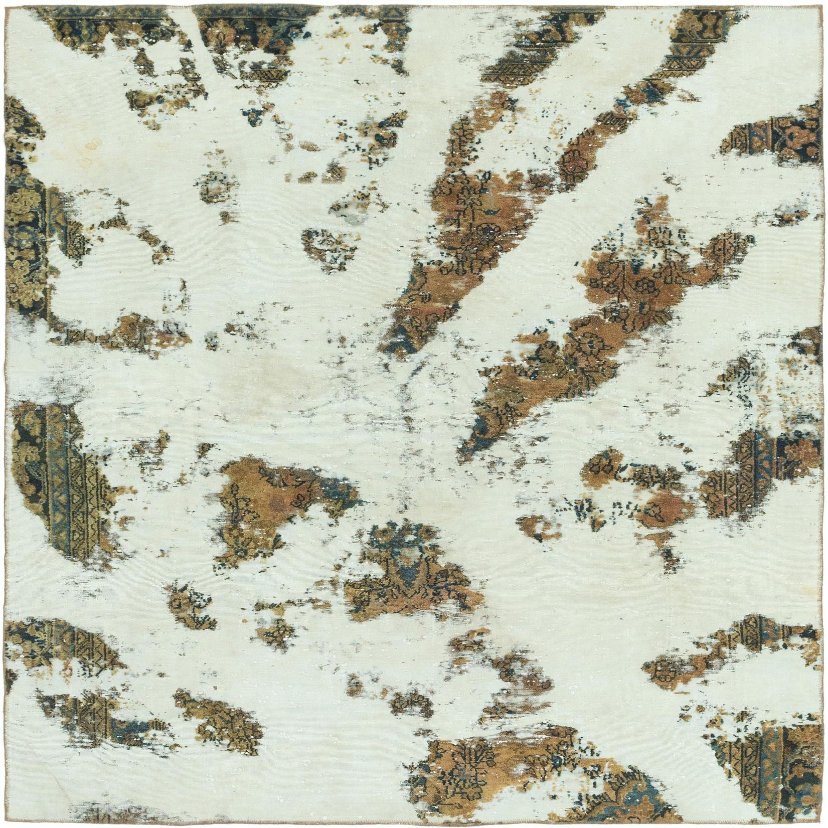 An 8x10 rectangular ivory wool rug with an abstract, distressed Persian pattern in brown and dark blue, suitable for a living room.