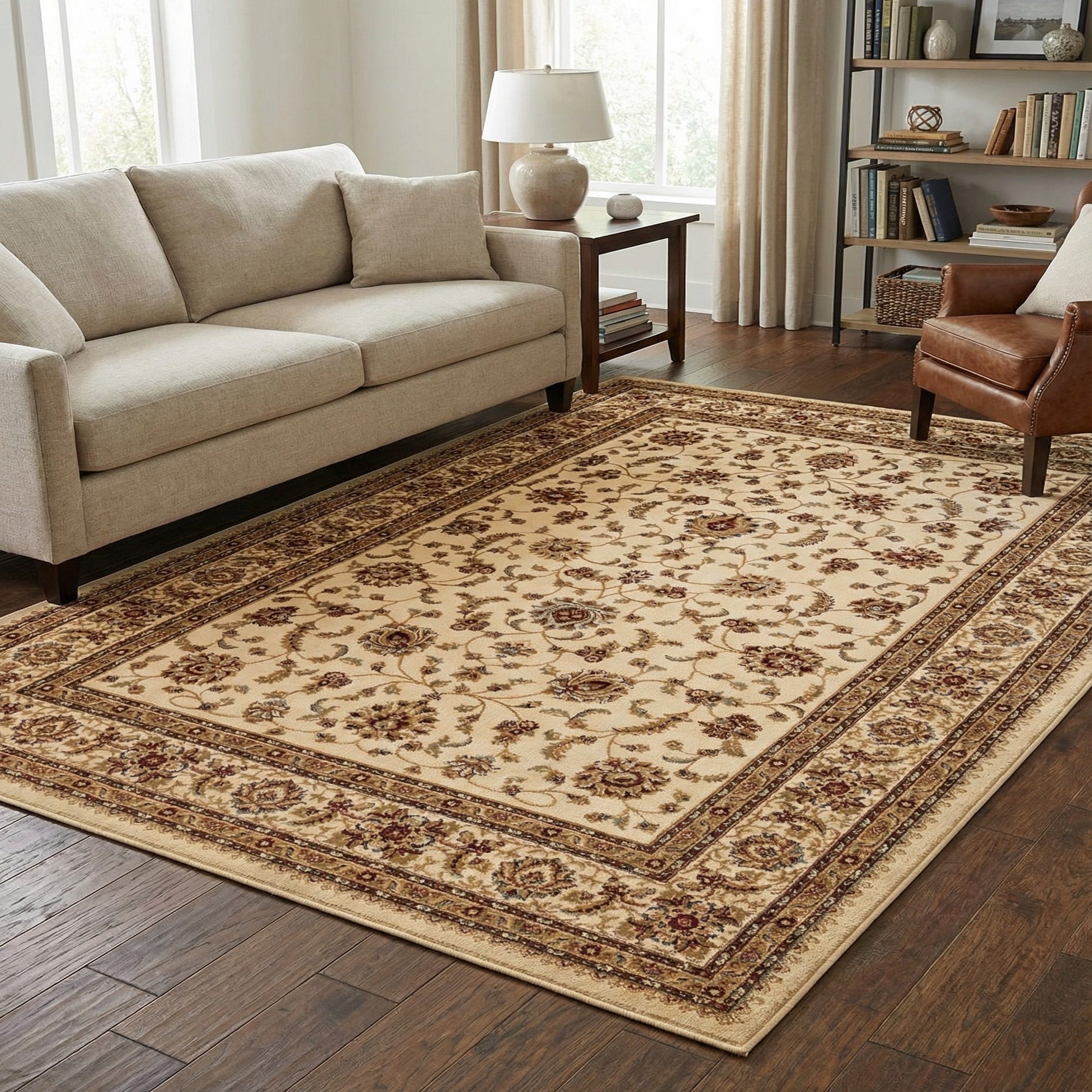 The Aditi Collection offers a timeless charm to any living space with its classic design and subtle color palette. This particular 8x11 rug features a harmonious blend of Cream, Brown, Green, Light Blue, Red, Rust Red, and Tan, accentuating its intricate traditional floral motifs and border patterns. The Cream background serves as a neutral canvas, allowing the patterns to stand out while maintaining an overall sense of balance and warmth.