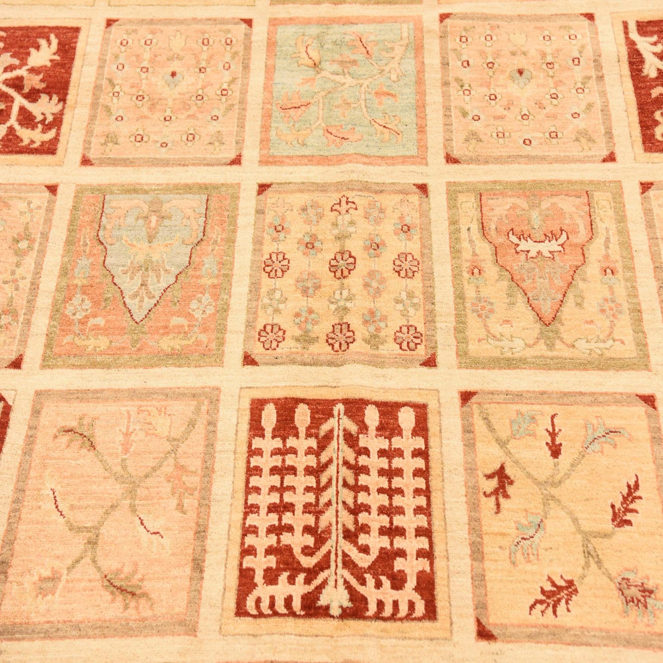 The Ariana Ziegler collection presents an 8x11 hand-knotted rug that exemplifies traditional craftsmanship. Constructed from 100% hand-spun wool, this rug showcases a creamy beige background with an alluring pattern consisting of a patchwork of medallion and geometric motifs. Its color palette features soft gold, light blue, and light green highlights, accented by red, pink, and peach tones, lending warmth and subtle vibrancy to any space.