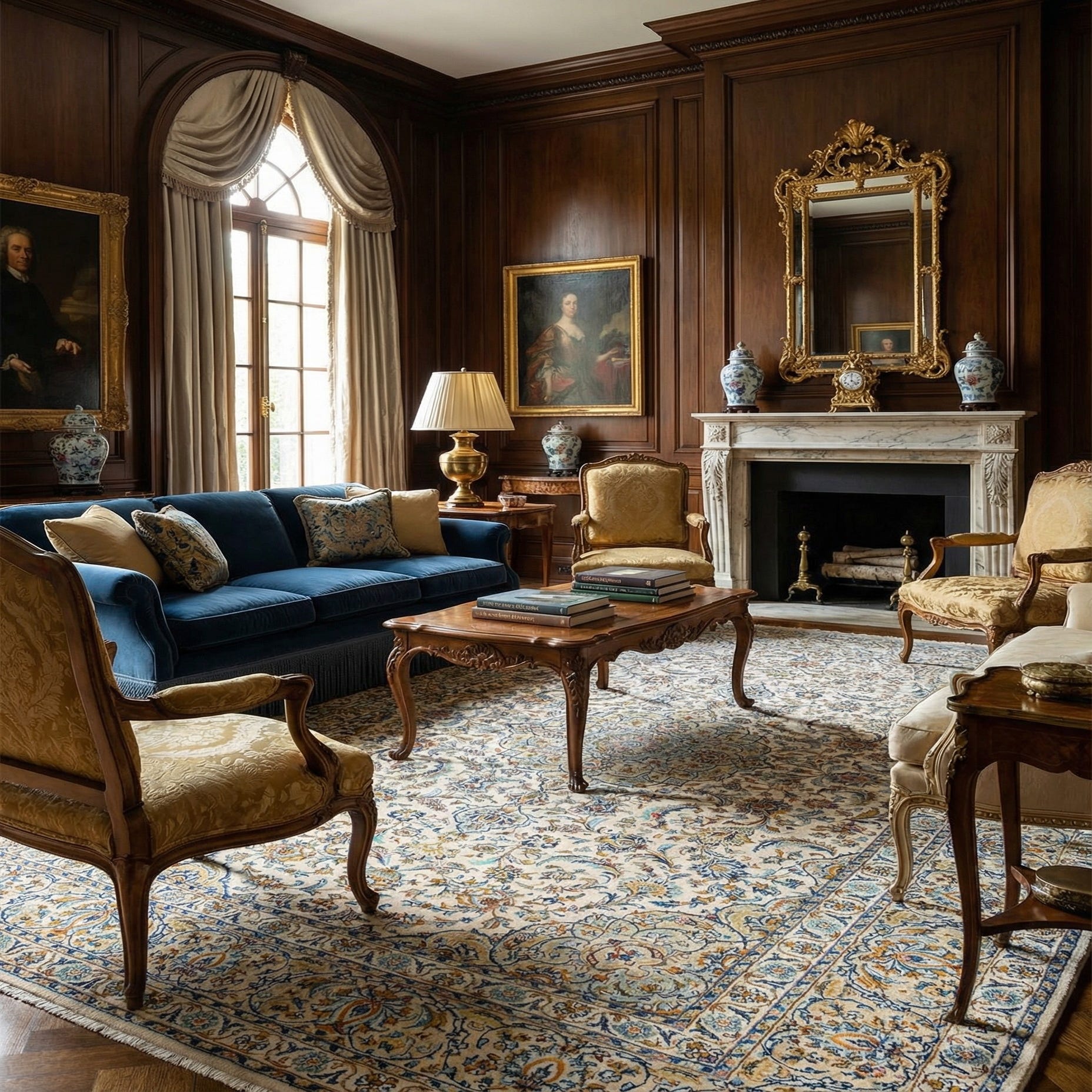 Ideal for a variety of interior setups, this rug is well-suited for placement in a formal living room, dining area, or office, complementing classic wood furniture pieces and adding depth to neutral color schemes. Moreover, this rug would serve as a distinguished foundation within spaces that embrace traditional or transitional decor, acting as a statement piece that brings warmth and artistry to the room.