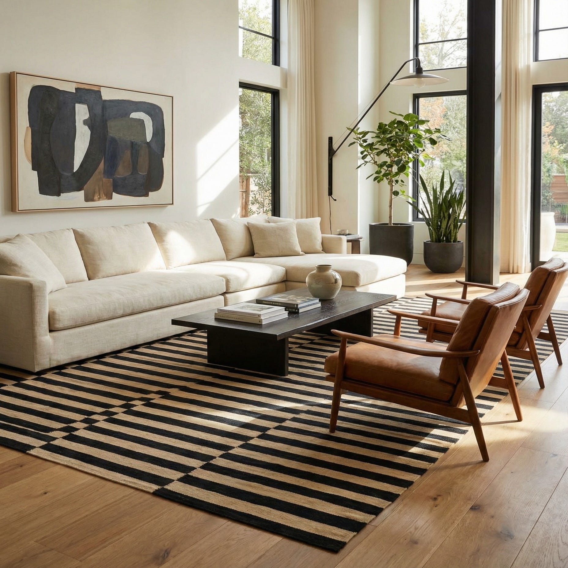 The contrasting black and cream colors provide a versatile palette that can seamlessly integrate into various interior design schemes. This rug could be a striking centerpiece in minimalist settings, complement the understated elegance of Scandinavian decor, or add a graphic punch to eclectic spaces. Its linear pattern brings a sense of structure and order, making it suitable for both casual and formal areas of the home. The natural wool material ensures that this rug is not only visually appealing but also has a tactile quality that adds to its charm.