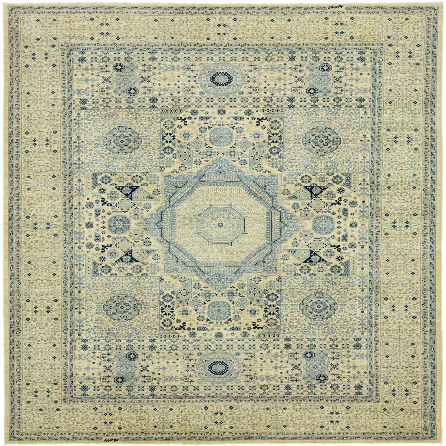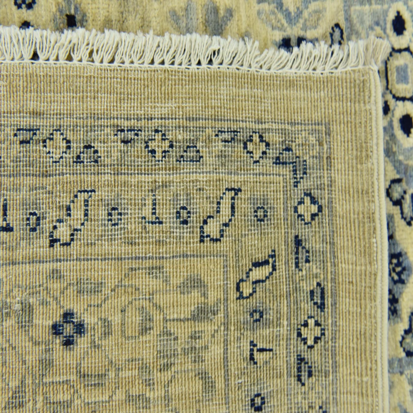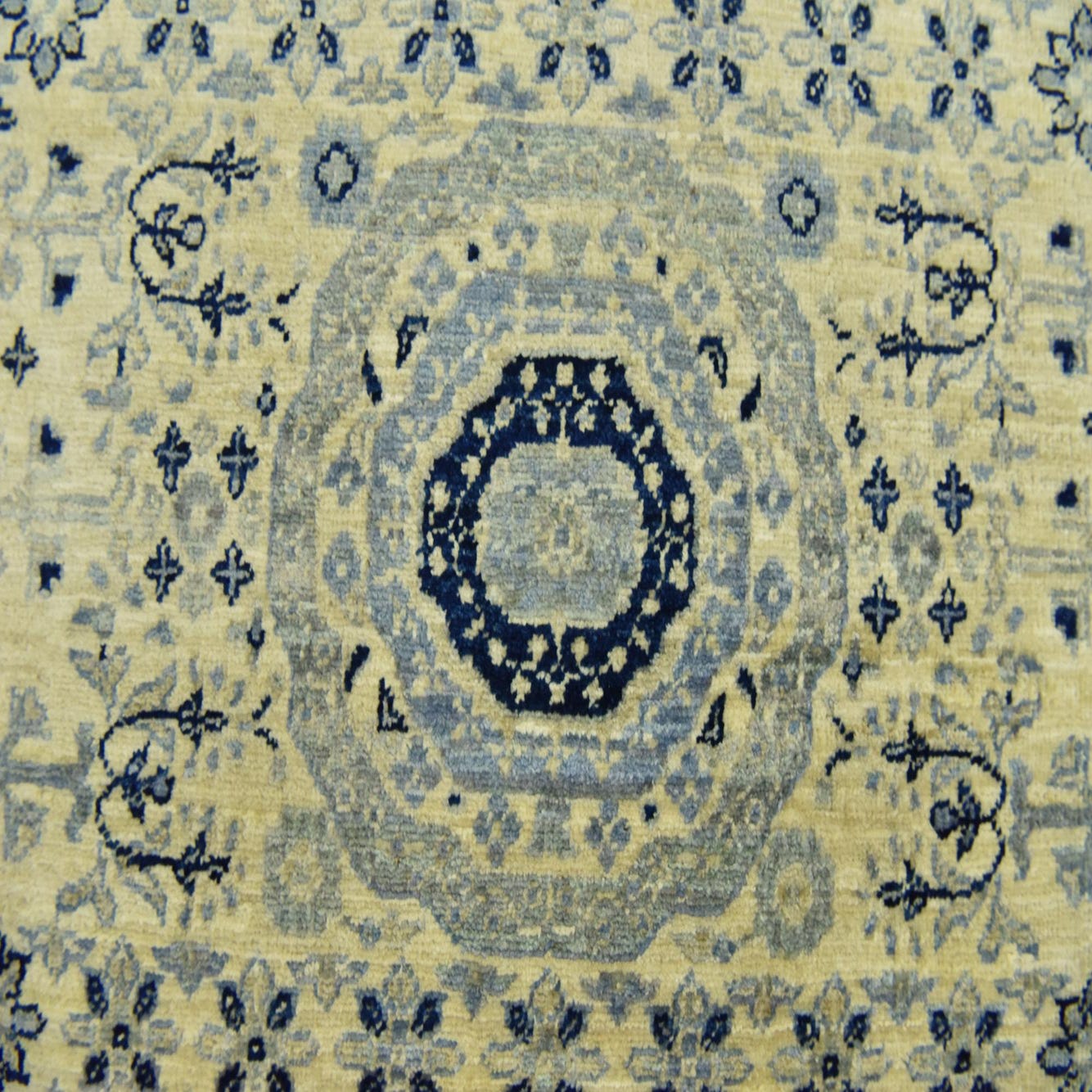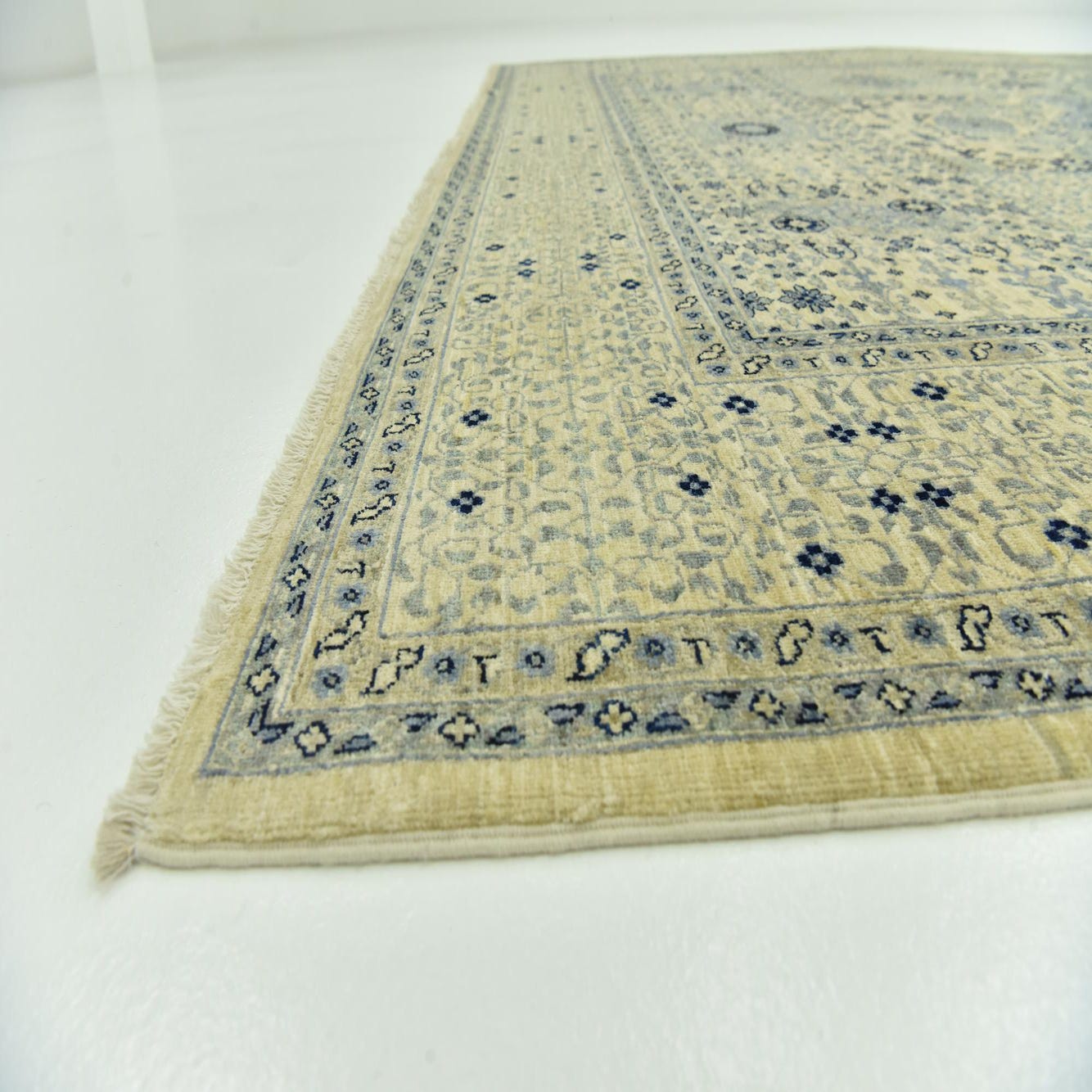 The Mamluk Ziegler rug presents a grand, sophisticated design with a rich cream background that is beautifully complemented by shades of gray, light blue, and navy blue. The intricate geometric and botanical motifs are symmetrically arranged, forming an elaborate central medallion and a detailed border that exhibits the craftsmanship of the hand-knotted technique. This 8x11 rug is crafted from 100% hand-spun wool, offering a luxurious feel underfoot and a texture that accentuates the precision of its pattern.